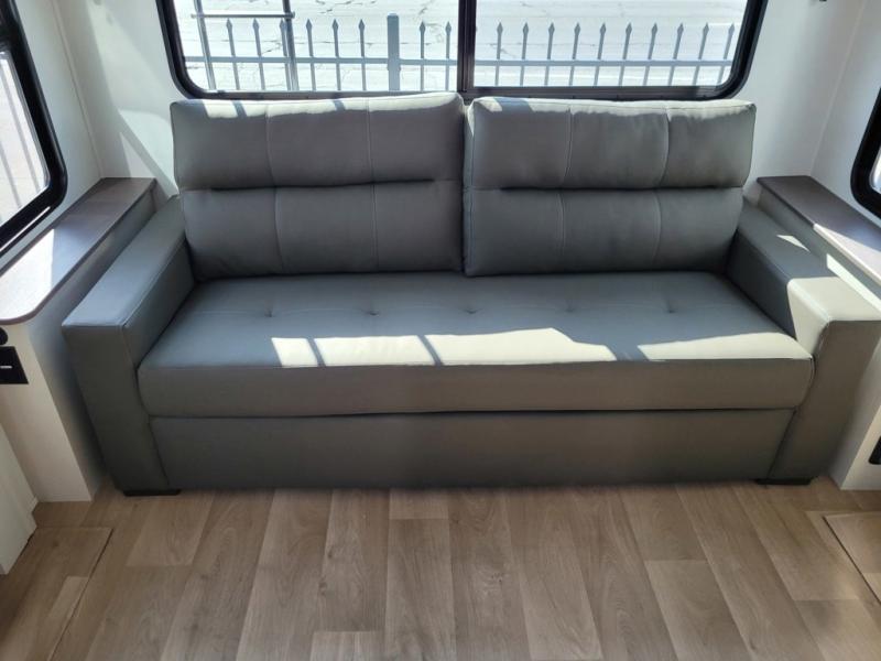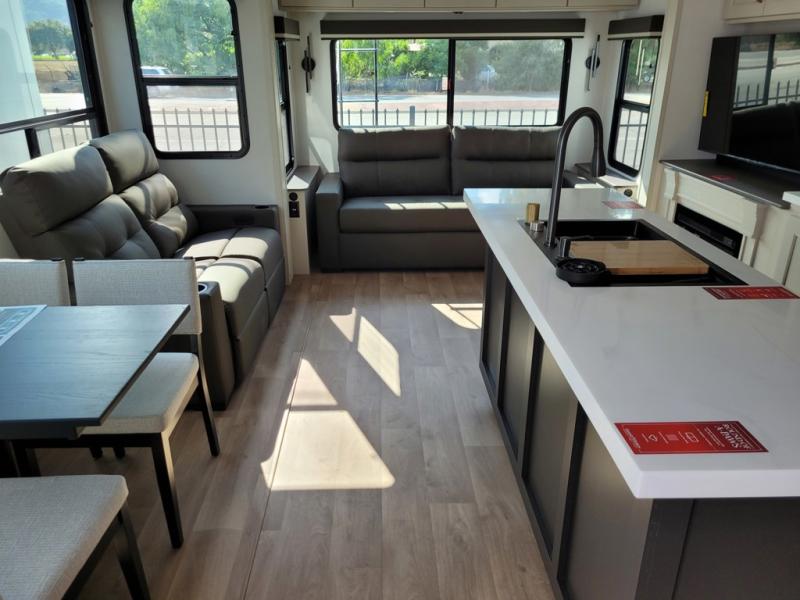 Any Grand Design Influence fifth wheel features five-sided aluminum cage construction with a walk-on roof and a fully enclosed underbelly with heated tanks and storage for all weather camping. For peace of mind, the MORryde CRE3000 Suspension system will provide safe and smooth towing, and the 101" widebody construction offers all the room you need and that is before multiple slides are fully engaged. You will appreciate the Keyed-Alike locks, slam-latch baggage doors with magnetic door catches, exterior security light, and SolidStep entry steps. On the inside, Congoleum flooring, premium roller shades for privacy, a hallway handrail for safety, and nightstands with USB ports to keep all of your electronics fully charged. You will also love the On Demand tankless water heater when showering, plus the added heat and ambiance from an electric fireplace, and so much more!