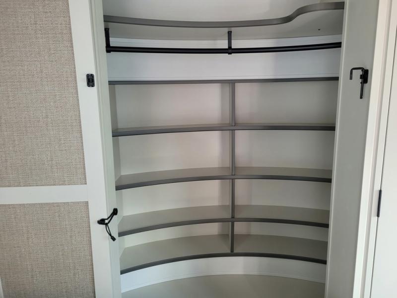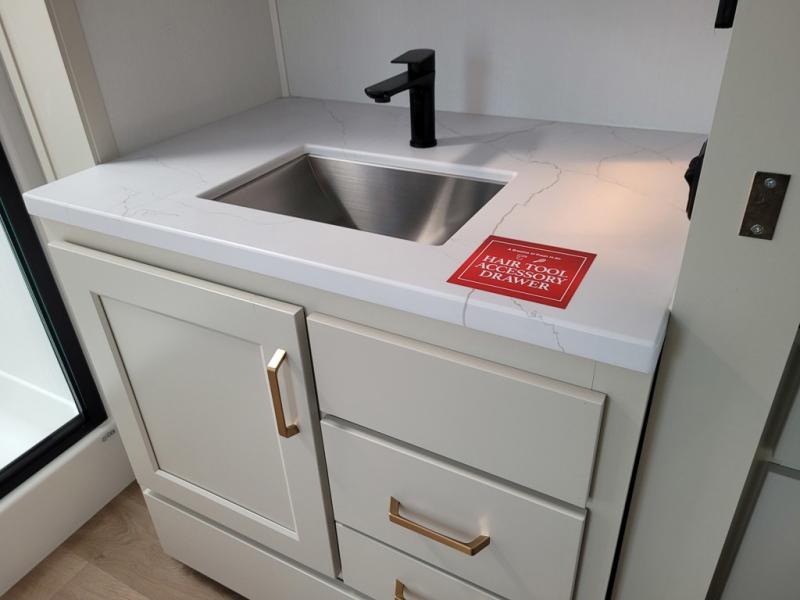 A perfect couples coach featuring triple slides and a tri-fold sofa just in case you want to have overnight guests! You will love the spacious interior thanks to the dual opposing slides in the main living and kitchen area. Here you will find a kitchen island in the center and plenty of seating with a free standing dinette, theater seating for movie night opposite the fireplace and entertainment center, as well as a tri-fold sofa. The kitchen offers all of the amenities just like home, a 16 cu. ft. 12-volt refrigerator for your perishables, and a pantry and hutch nearby for dry goods and dishes. There is even a pet dish under the refrigerator for your furry friends. The center island offers added counter space and a sink for dishes and prep work. Head up the steps to your private front bedroom with queen bed slide, and bathroom with dual entry. You even have washer/dryer prep in case you wish to add the units and enjoy even more at-home conveniences!