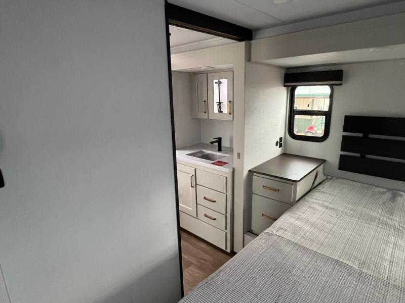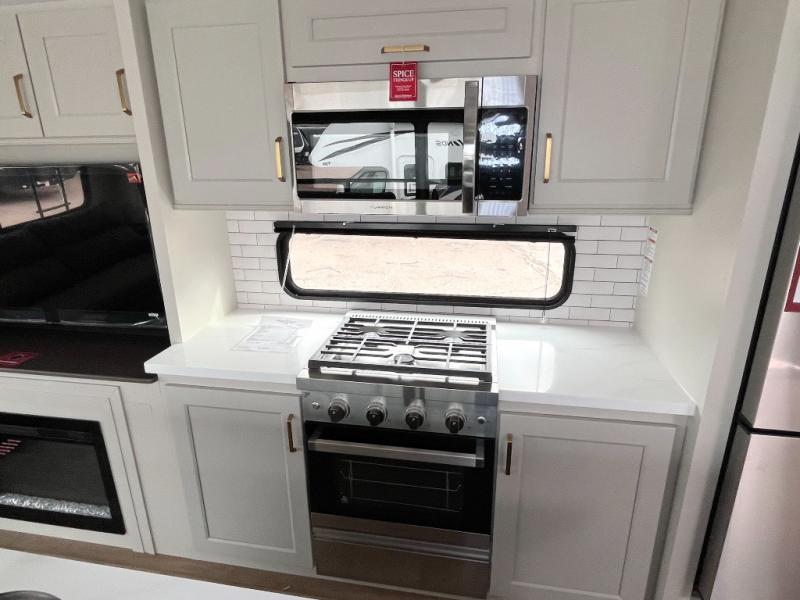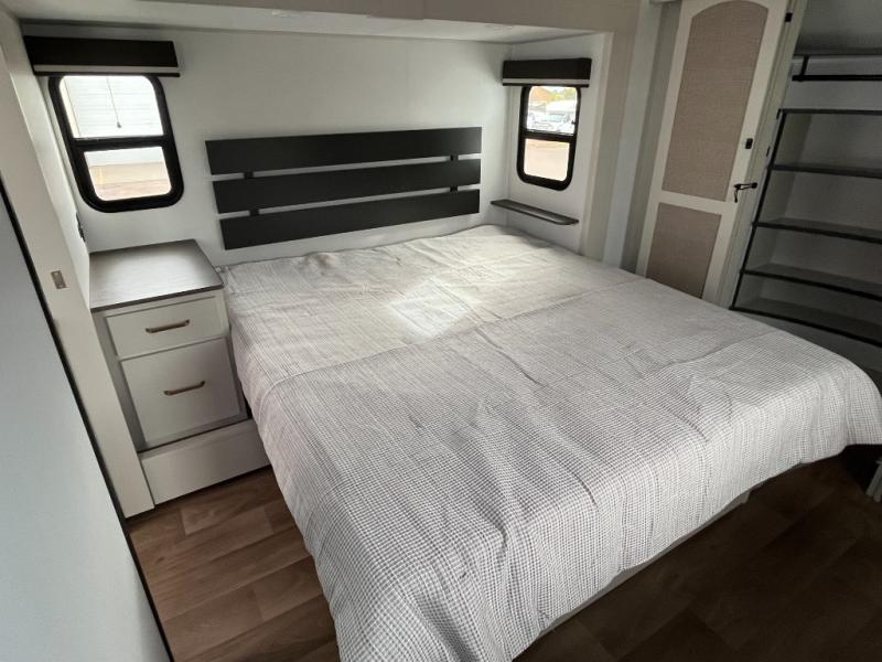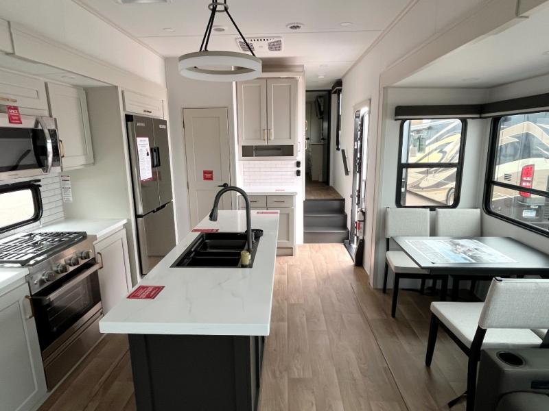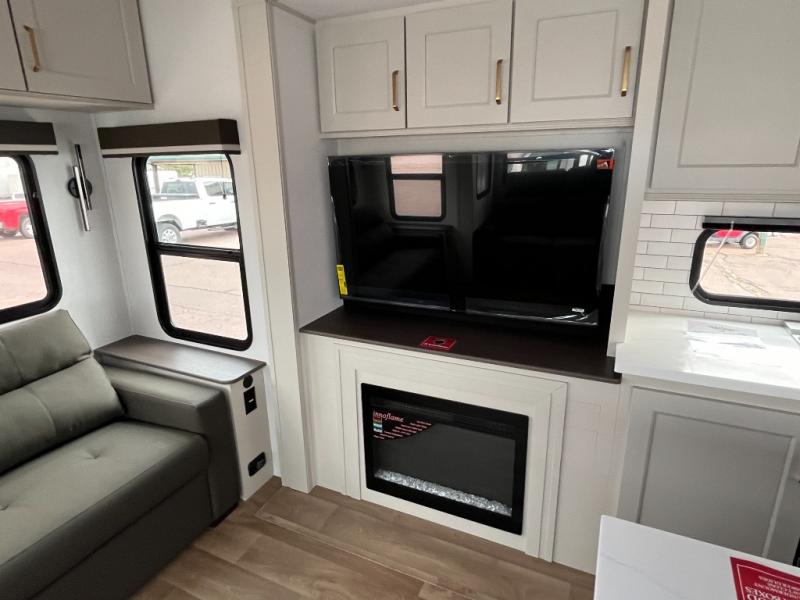 Any Grand Design Influence fifth wheel features five-sided aluminum cage construction with a walk-on roof and a fully enclosed underbelly with heated tanks and storage for all weather camping. For peace of mind, the MORryde CRE3000 Suspension system will provide safe and smooth towing, and the 101" widebody construction offers all the room you need and that is before multiple slides are fully engaged. You will appreciate the Keyed-Alike locks, slam-latch baggage doors with magnetic door catches, exterior security light, and SolidStep entry steps. On the inside, Congoleum flooring, premium roller shades for privacy, a hallway handrail for safety, and nightstands with USB ports to keep all of your electronics fully charged. You will also love the On Demand tankless water heater when showering, plus the added heat and ambiance from an electric fireplace, and so much more!