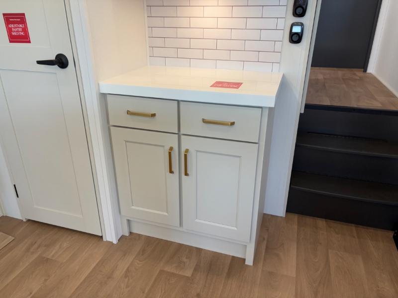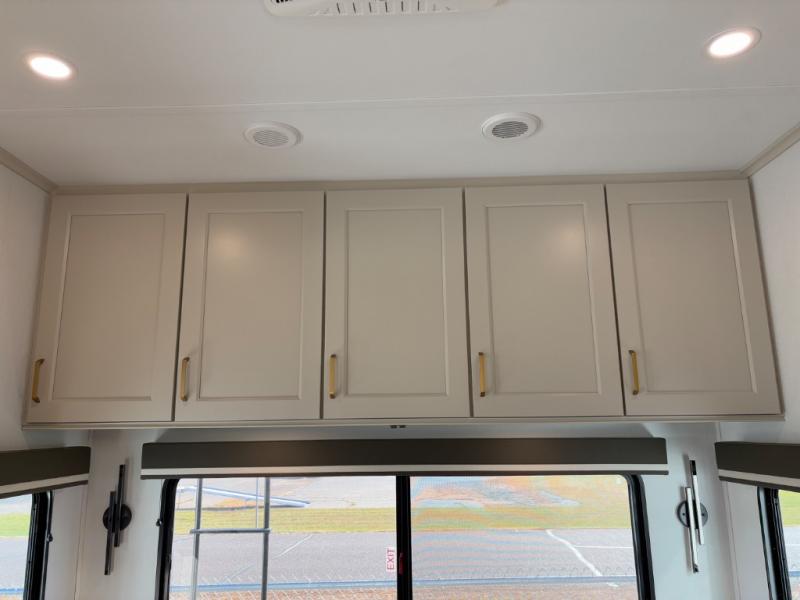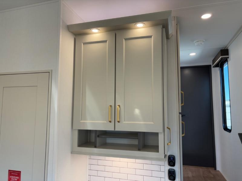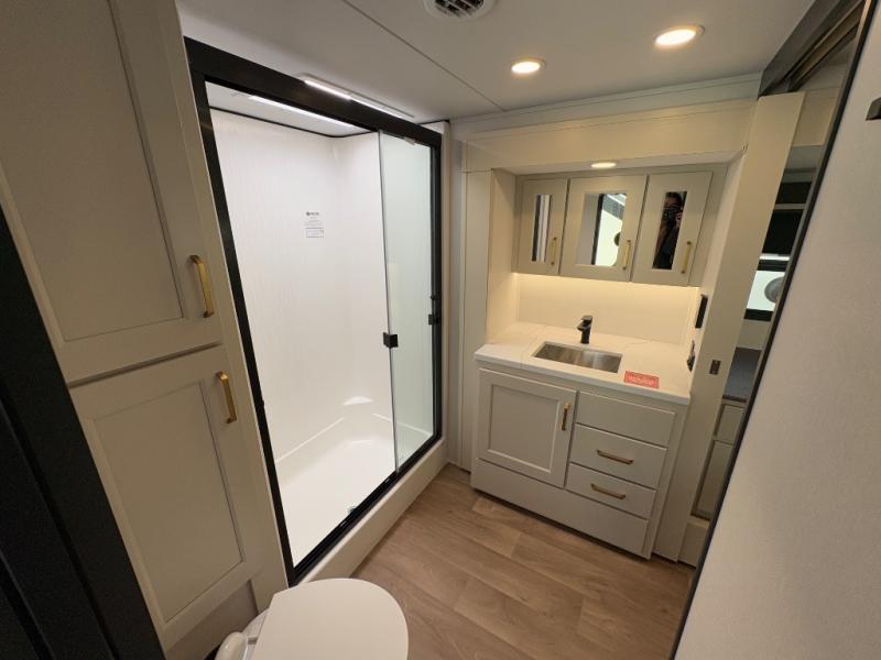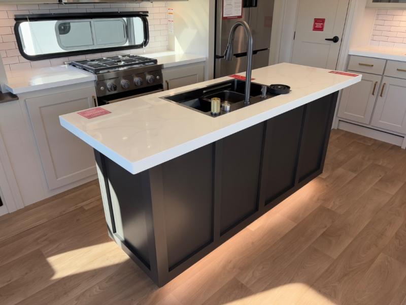 A perfect couples coach featuring triple slides and a tri-fold sofa just in case you want to have overnight guests! You will love the spacious interior thanks to the dual opposing slides in the main living and kitchen area. Here you will find a kitchen island in the center and plenty of seating with a free standing dinette, theater seating for movie night opposite the fireplace and entertainment center, as well as a tri-fold sofa. The kitchen offers all of the amenities just like home, a 16 cu. ft. 12-volt refrigerator for your perishables, and a pantry and hutch nearby for dry goods and dishes. There is even a pet dish under the refrigerator for your furry friends. The center island offers added counter space and a sink for dishes and prep work. Head up the steps to your private front bedroom with queen bed slide, and bathroom with dual entry. You even have washer/dryer prep in case you wish to add the units and enjoy even more at-home conveniences!