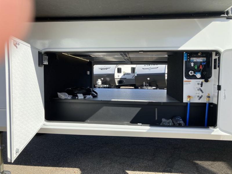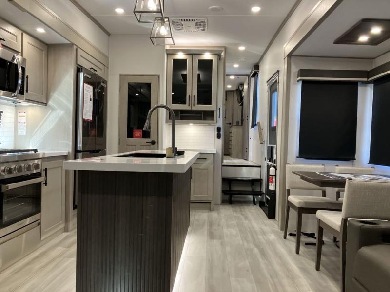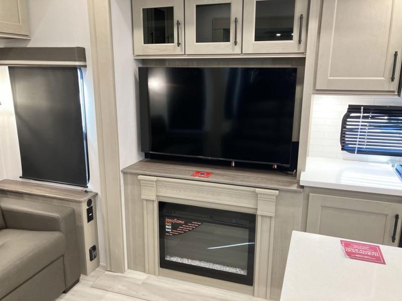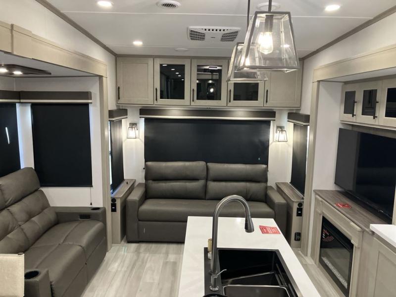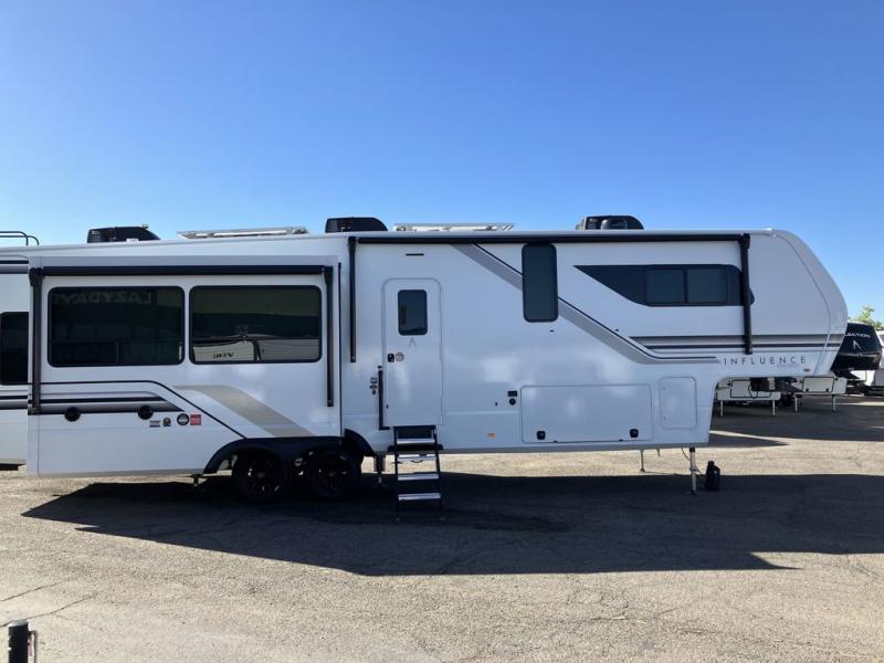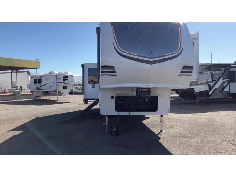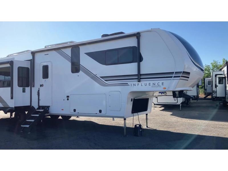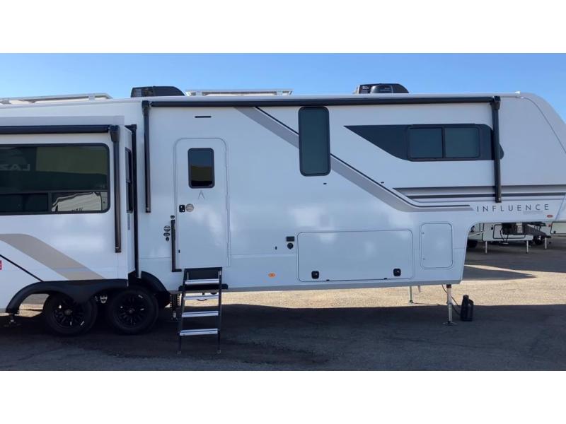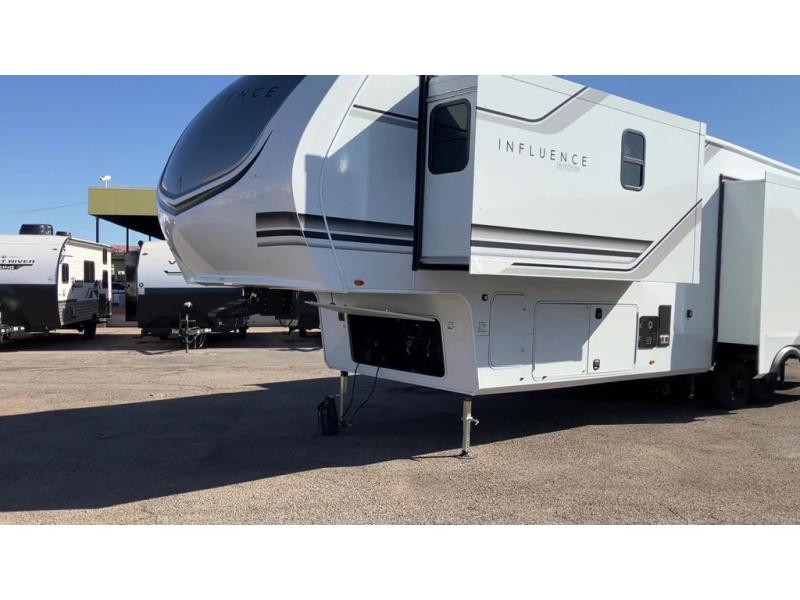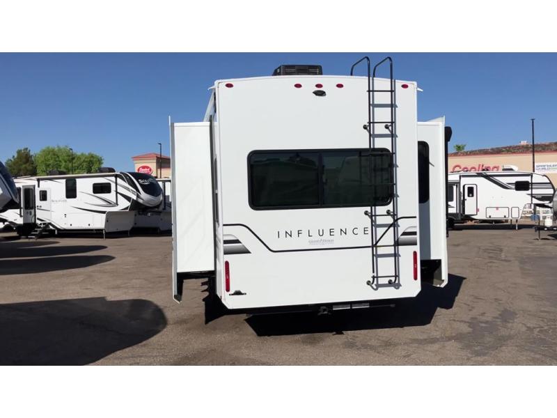 Any Grand Design Influence fifth wheel features five-sided aluminum cage construction with a walk-on roof and a fully enclosed underbelly with heated tanks and storage for all weather camping. For peace of mind, the MORryde CRE3000 Suspension system will provide safe and smooth towing, and the 101" widebody construction offers all the room you need and that is before multiple slides are fully engaged. You will appreciate the Keyed-Alike locks, slam-latch baggage doors with magnetic door catches, exterior security light, and SolidStep entry steps. On the inside, Congoleum flooring, premium roller shades for privacy, a hallway handrail for safety, and nightstands with USB ports to keep all of your electronics fully charged. You will also love the On Demand tankless water heater when showering, plus the added heat and ambiance from an electric fireplace, and so much more!