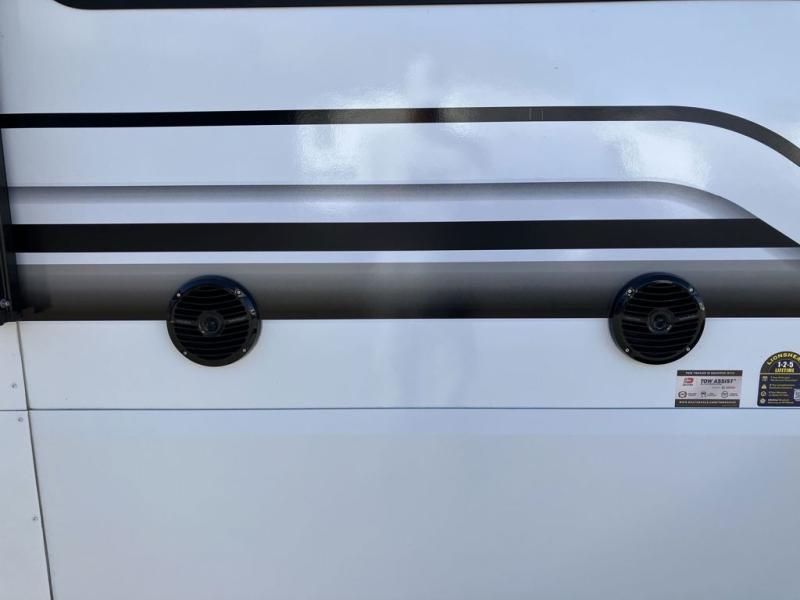A perfect couples coach featuring triple slides and a tri-fold sofa just in case you want to have overnight guests! You will love the spacious interior thanks to the dual opposing slides in the main living and kitchen area. Here you will find a kitchen island in the center and plenty of seating with a free standing dinette, theater seating for movie night opposite the fireplace and entertainment center, as well as a tri-fold sofa. The kitchen offers all of the amenities just like home, a 16 cu. ft. 12-volt refrigerator for your perishables, and a pantry and hutch nearby for dry goods and dishes. There is even a pet dish under the refrigerator for your furry friends. The center island offers added counter space and a sink for dishes and prep work. Head up the steps to your private front bedroom with queen bed slide, and bathroom with dual entry. You even have washer/dryer prep in case you wish to add the units and enjoy even more at-home conveniences!