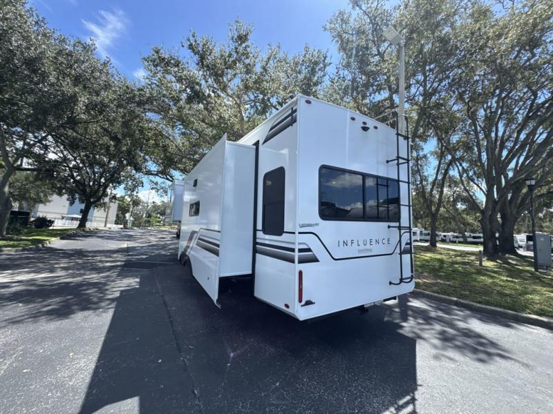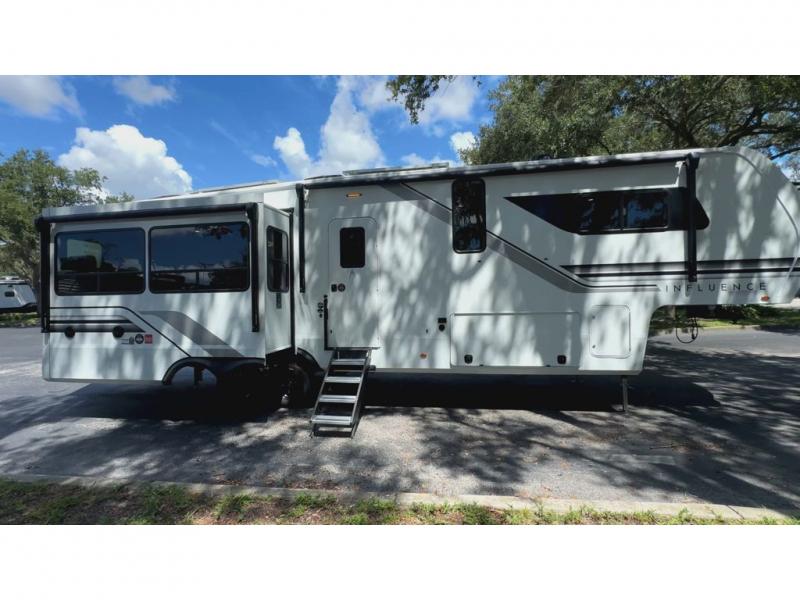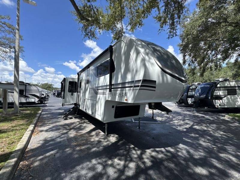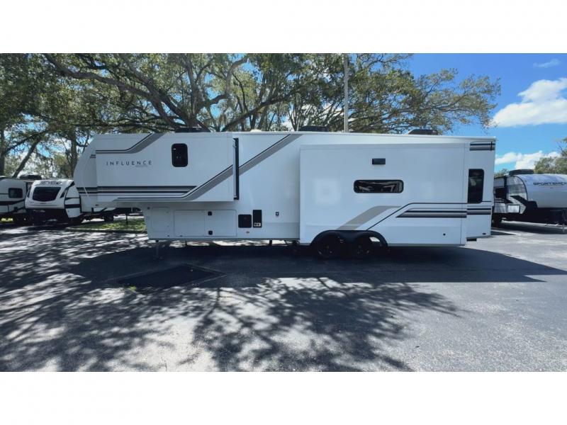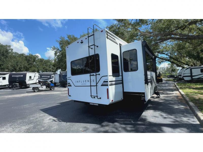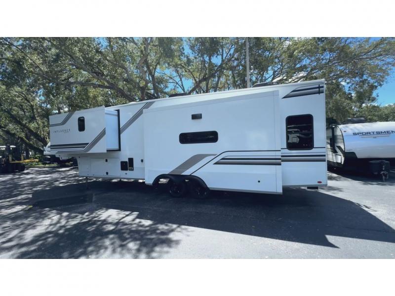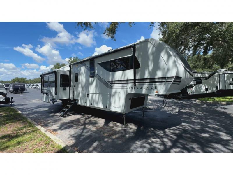 Any Grand Design Influence fifth wheel features five-sided aluminum cage construction with a walk-on roof and a fully enclosed underbelly with heated tanks and storage for all weather camping. For peace of mind, the MORryde CRE3000 Suspension system will provide safe and smooth towing, and the 101" widebody construction offers all the room you need and that is before multiple slides are fully engaged. You will appreciate the Keyed-Alike locks, slam-latch baggage doors with magnetic door catches, exterior security light, and SolidStep entry steps. On the inside, Congoleum flooring, premium roller shades for privacy, a hallway handrail for safety, and nightstands with USB ports to keep all of your electronics fully charged. You will also love the On Demand tankless water heater when showering, plus the added heat and ambiance from an electric fireplace, and so much more!