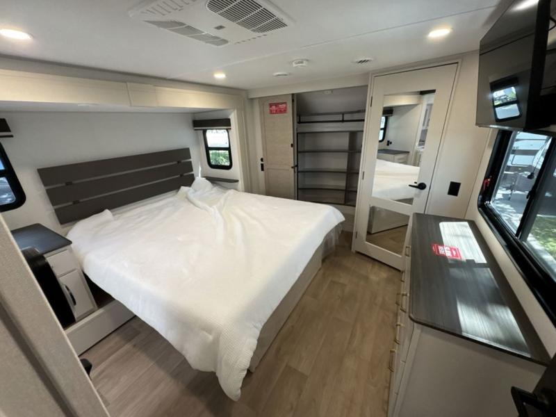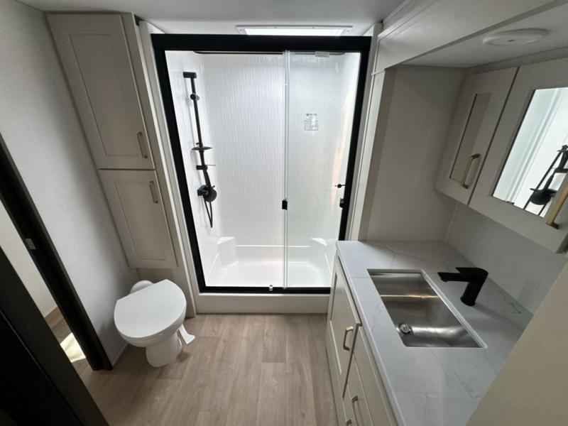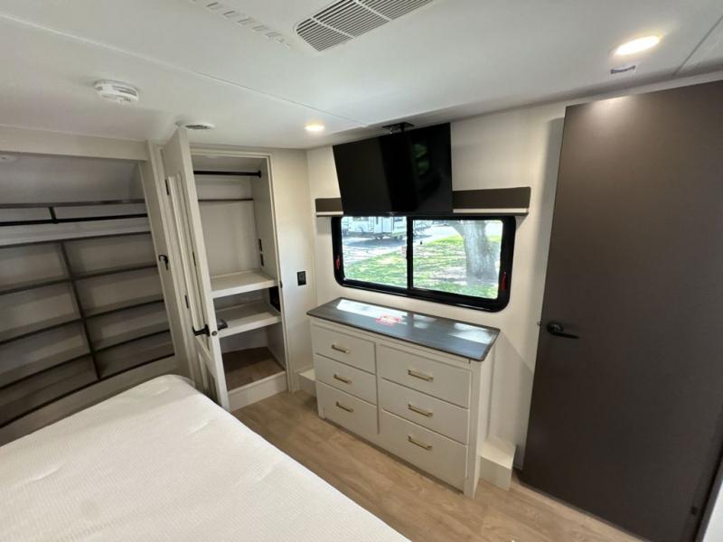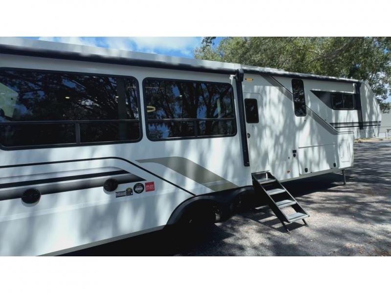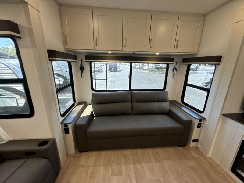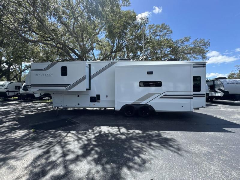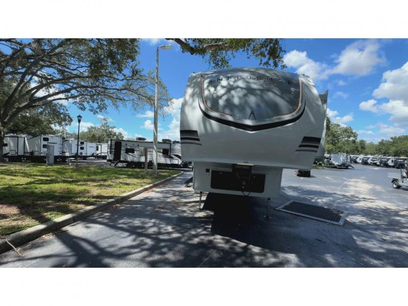 Any Grand Design Influence fifth wheel features five-sided aluminum cage construction with a walk-on roof and a fully enclosed underbelly with heated tanks and storage for all weather camping. For peace of mind, the MORryde CRE3000 Suspension system will provide safe and smooth towing, and the 101" widebody construction offers all the room you need and that is before multiple slides are fully engaged. You will appreciate the Keyed-Alike locks, slam-latch baggage doors with magnetic door catches, exterior security light, and SolidStep entry steps. On the inside, Congoleum flooring, premium roller shades for privacy, a hallway handrail for safety, and nightstands with USB ports to keep all of your electronics fully charged. You will also love the On Demand tankless water heater when showering, plus the added heat and ambiance from an electric fireplace, and so much more!