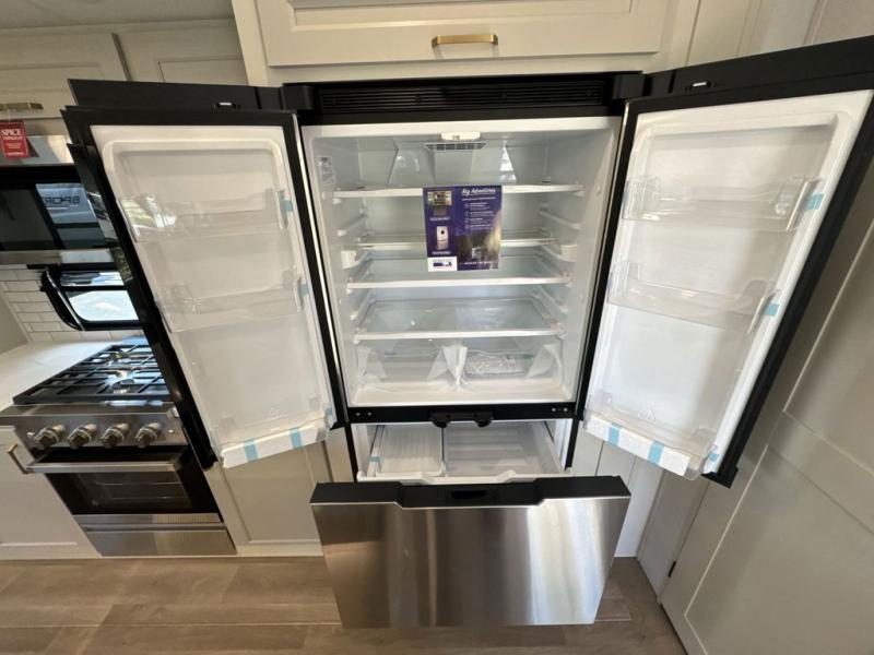 A perfect couples coach featuring triple slides and a tri-fold sofa just in case you want to have overnight guests! You will love the spacious interior thanks to the dual opposing slides in the main living and kitchen area. Here you will find a kitchen island in the center and plenty of seating with a free standing dinette, theater seating for movie night opposite the fireplace and entertainment center, as well as a tri-fold sofa. The kitchen offers all of the amenities just like home, a 16 cu. ft. 12-volt refrigerator for your perishables, and a pantry and hutch nearby for dry goods and dishes. There is even a pet dish under the refrigerator for your furry friends. The center island offers added counter space and a sink for dishes and prep work. Head up the steps to your private front bedroom with queen bed slide, and bathroom with dual entry. You even have washer/dryer prep in case you wish to add the units and enjoy even more at-home conveniences!