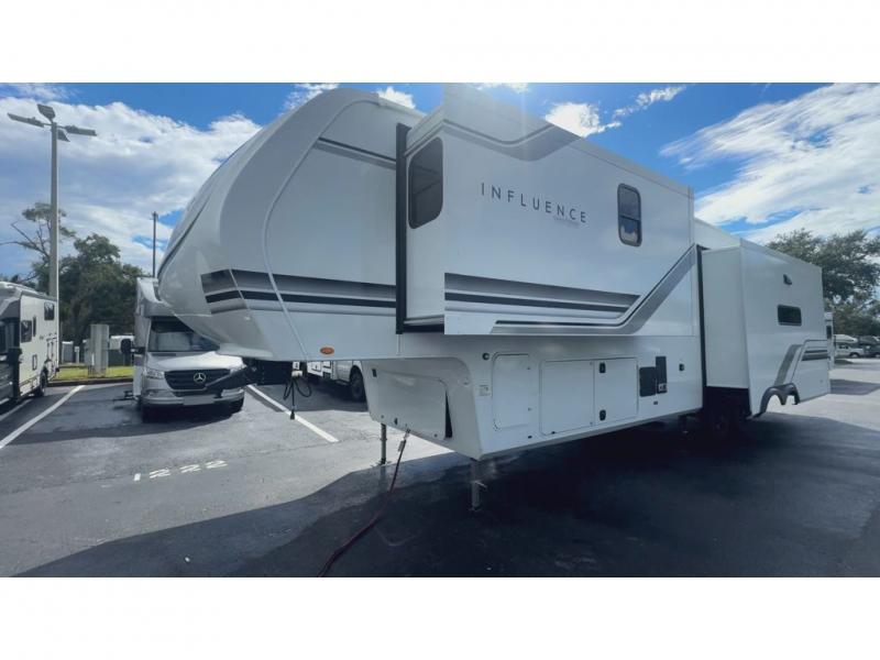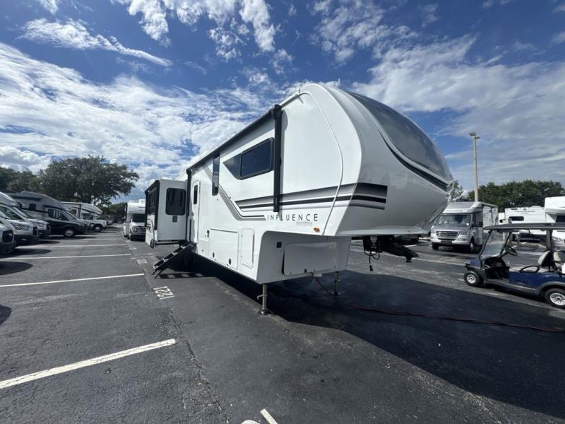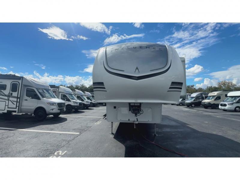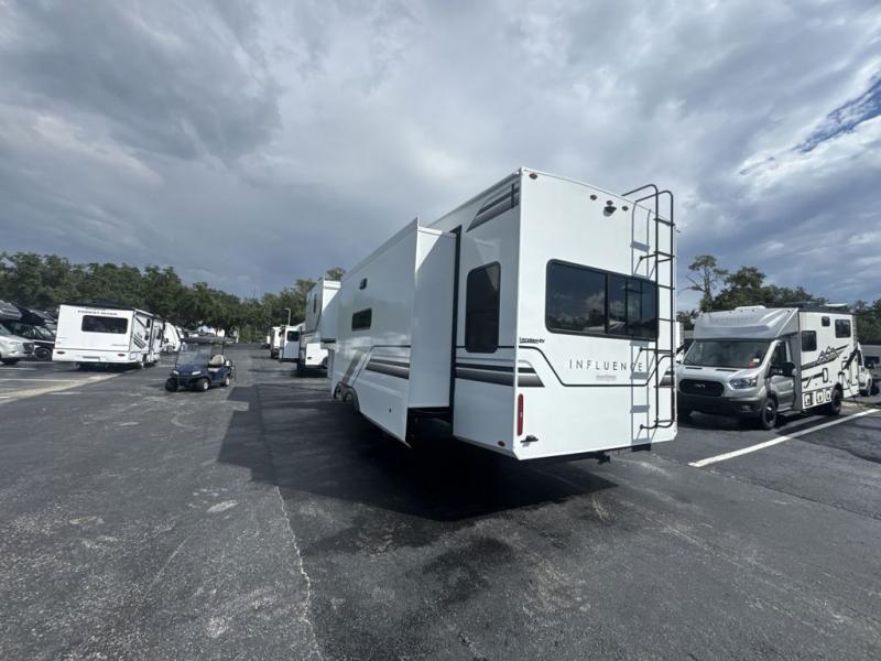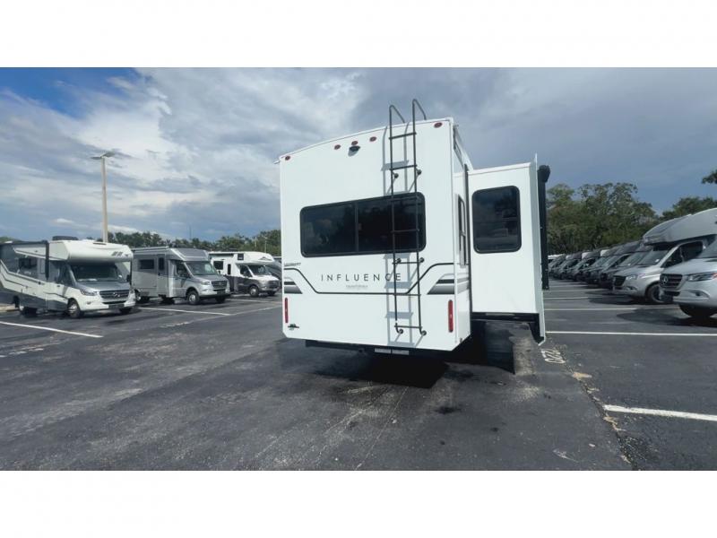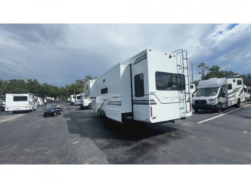 Any Grand Design Influence fifth wheel features five-sided aluminum cage construction with a walk-on roof and a fully enclosed underbelly with heated tanks and storage for all weather camping. For peace of mind, the MORryde CRE3000 Suspension system will provide safe and smooth towing, and the 101" widebody construction offers all the room you need and that is before multiple slides are fully engaged. You will appreciate the Keyed-Alike locks, slam-latch baggage doors with magnetic door catches, exterior security light, and SolidStep entry steps. On the inside, Congoleum flooring, premium roller shades for privacy, a hallway handrail for safety, and nightstands with USB ports to keep all of your electronics fully charged. You will also love the On Demand tankless water heater when showering, plus the added heat and ambiance from an electric fireplace, and so much more!