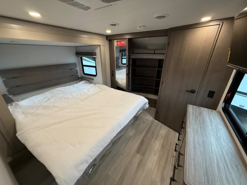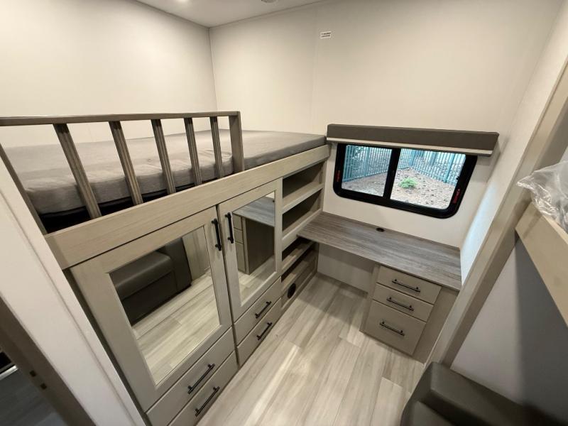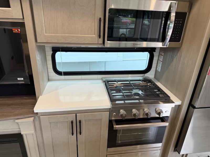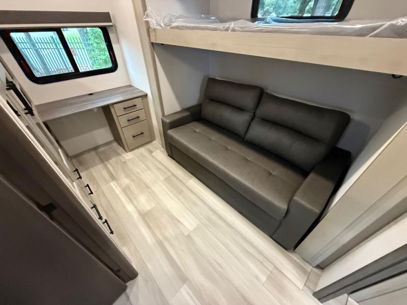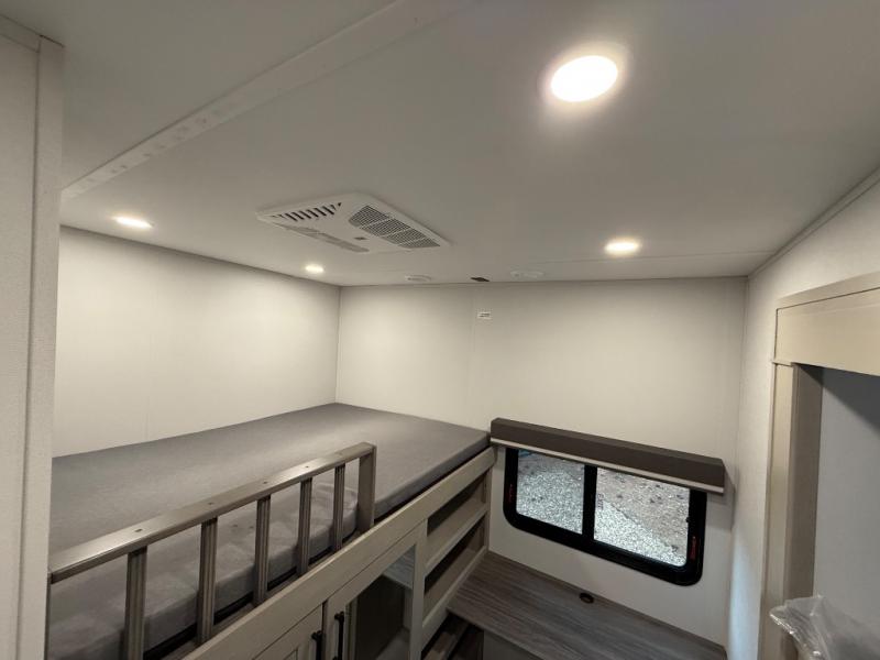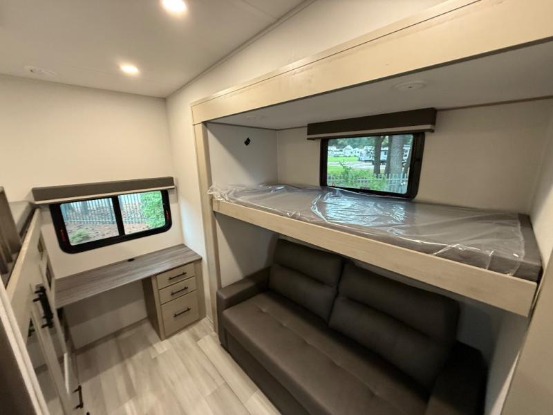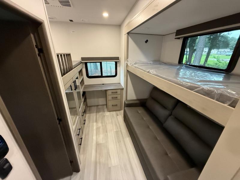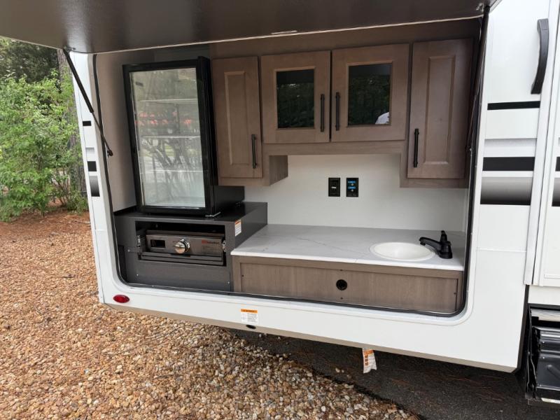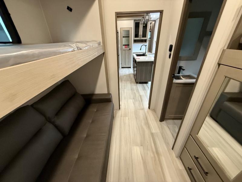 Grab the whole gang and head out in this fifth wheel featuring a private bunkhouse that sleeps five. This unit also features dual entry doors for added convenience with one set leading into a half bath, and quad slides for even more space in this widebody layout. The combined kitchen and living area featuring dual opposing slides offer space to dine and relax including theater seating for two opposite the entertainment center and fireplace. The chef in your group will appreciate the amenities for dreaming up dishes to feed everyone, and the outside griddle, sink and beverage cooler provides even more options. In front, a private bedroom and full bath with a queen bed or optional king bed, your choice. You can even add a washer and dryer with a space in front prepped for both if you like.