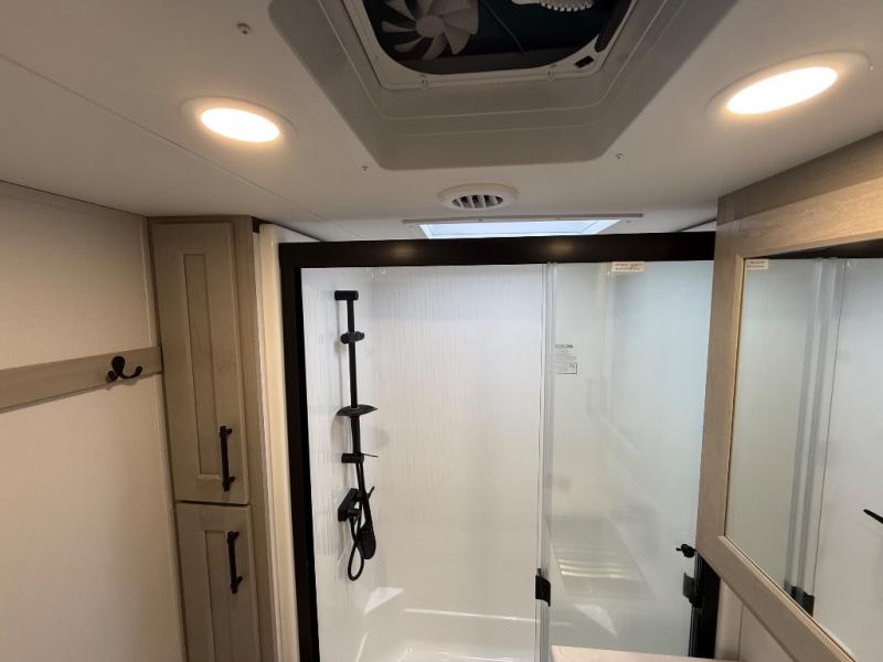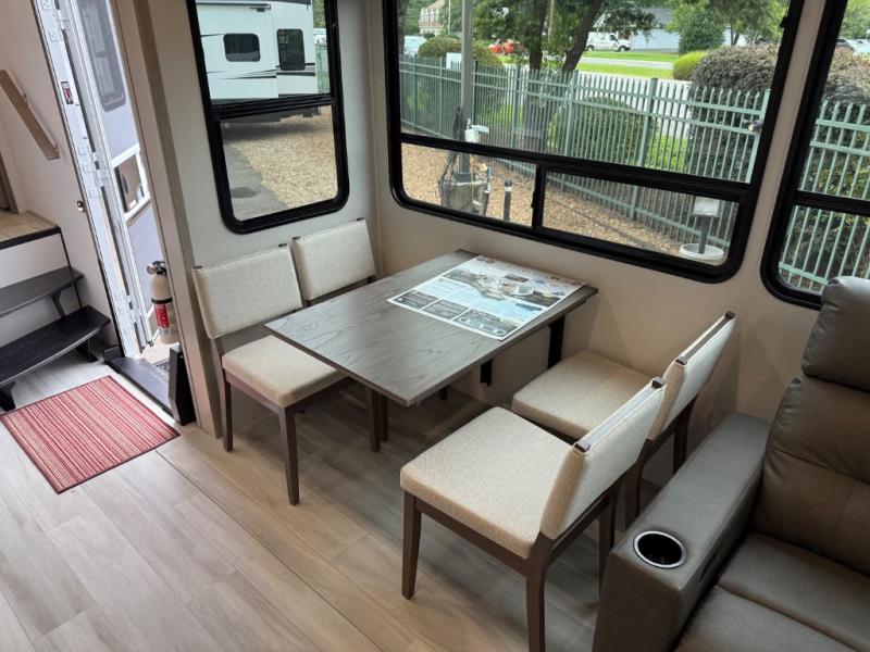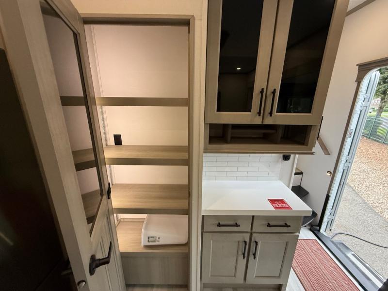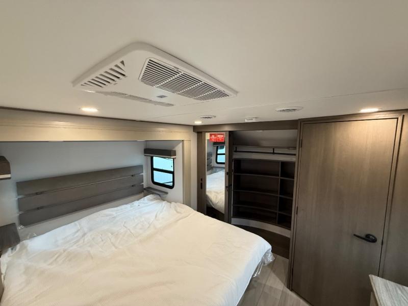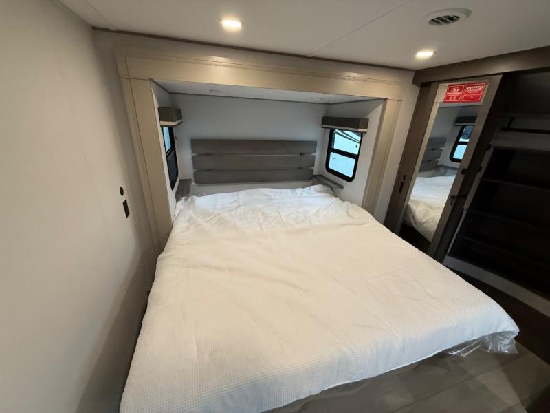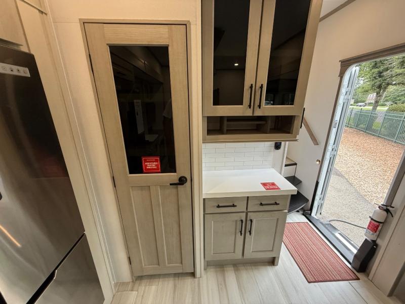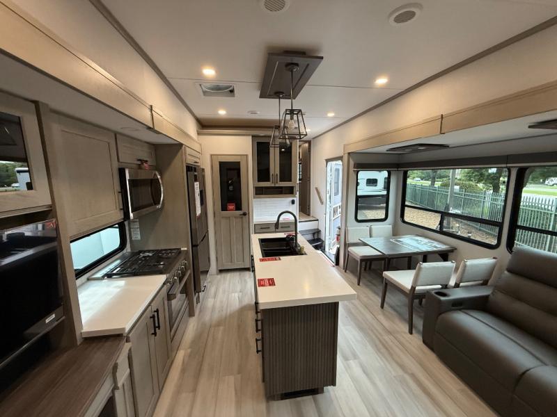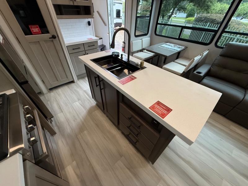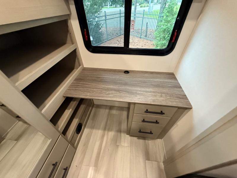 Grab the whole gang and head out in this fifth wheel featuring a private bunkhouse that sleeps five. This unit also features dual entry doors for added convenience with one set leading into a half bath, and quad slides for even more space in this widebody layout. The combined kitchen and living area featuring dual opposing slides offer space to dine and relax including theater seating for two opposite the entertainment center and fireplace. The chef in your group will appreciate the amenities for dreaming up dishes to feed everyone, and the outside griddle, sink and beverage cooler provides even more options. In front, a private bedroom and full bath with a queen bed or optional king bed, your choice. You can even add a washer and dryer with a space in front prepped for both if you like.