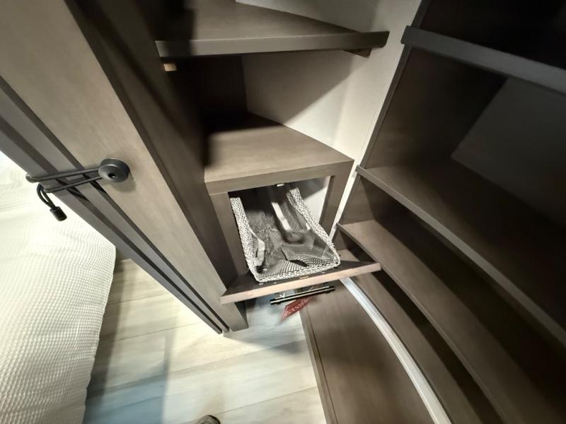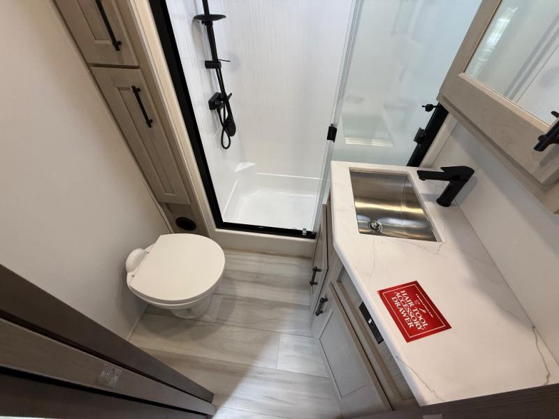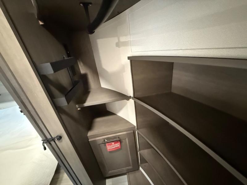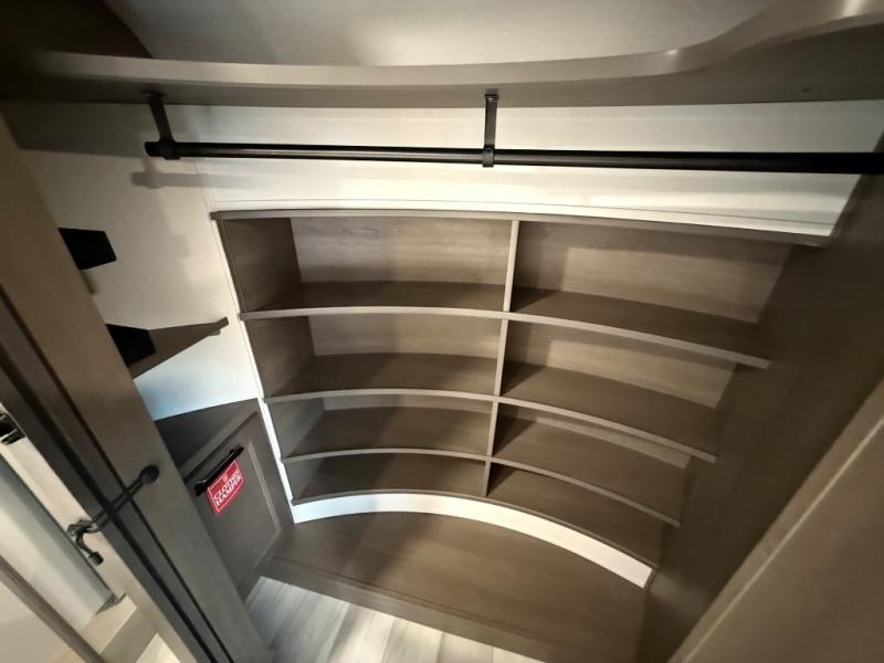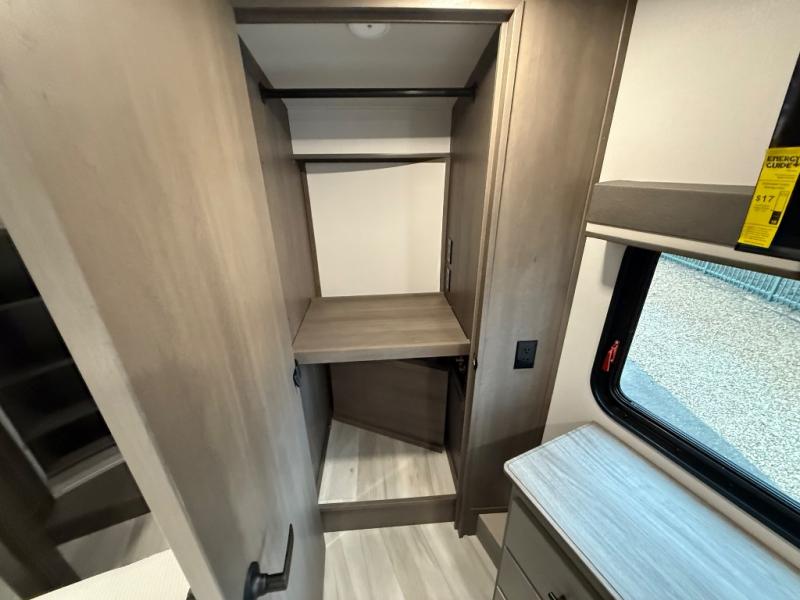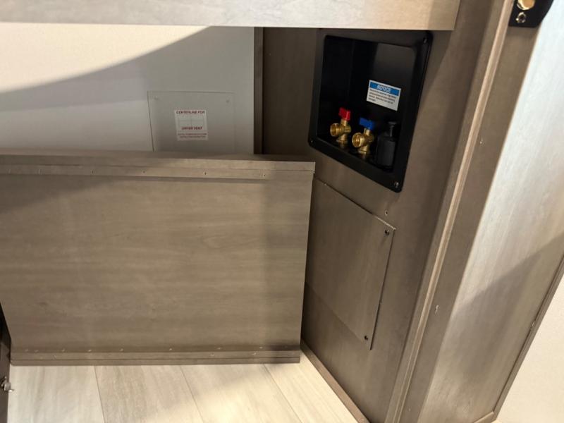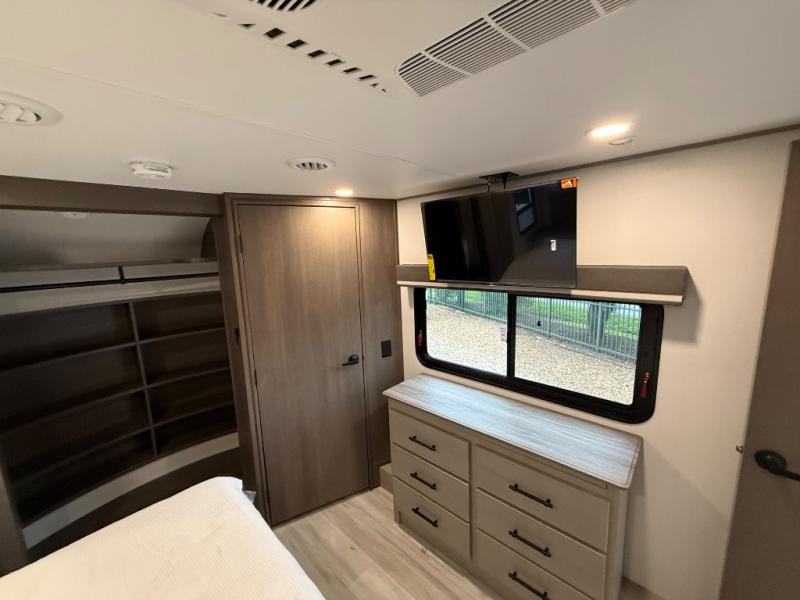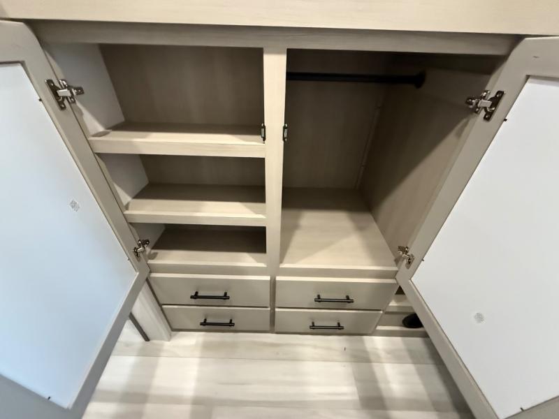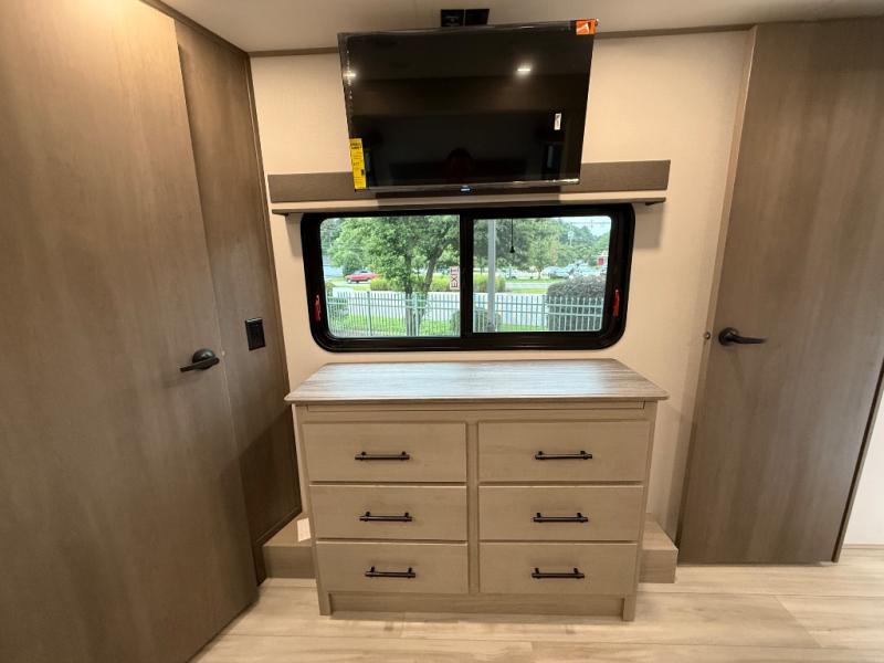 Grab the whole gang and head out in this fifth wheel featuring a private bunkhouse that sleeps five. This unit also features dual entry doors for added convenience with one set leading into a half bath, and quad slides for even more space in this widebody layout. The combined kitchen and living area featuring dual opposing slides offer space to dine and relax including theater seating for two opposite the entertainment center and fireplace. The chef in your group will appreciate the amenities for dreaming up dishes to feed everyone, and the outside griddle, sink and beverage cooler provides even more options. In front, a private bedroom and full bath with a queen bed or optional king bed, your choice. You can even add a washer and dryer with a space in front prepped for both if you like.