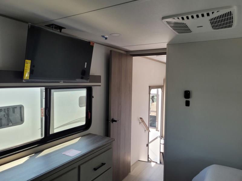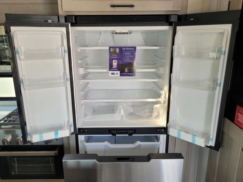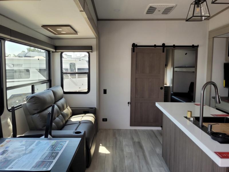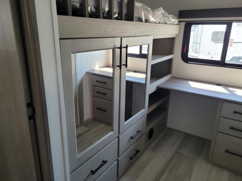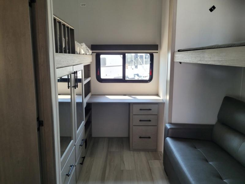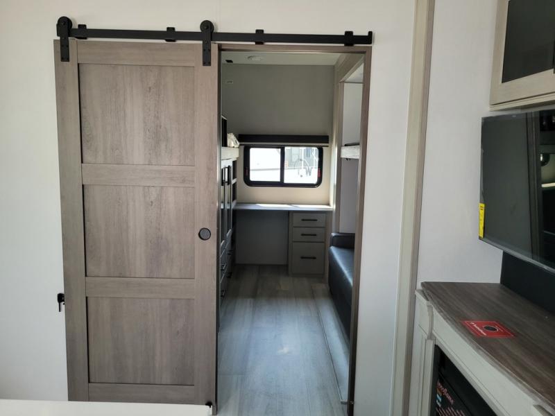 Grab the whole gang and head out in this fifth wheel featuring a private bunkhouse that sleeps five. This unit also features dual entry doors for added convenience with one set leading into a half bath, and quad slides for even more space in this widebody layout. The combined kitchen and living area featuring dual opposing slides offer space to dine and relax including theater seating for two opposite the entertainment center and fireplace. The chef in your group will appreciate the amenities for dreaming up dishes to feed everyone, and the outside griddle, sink and beverage cooler provides even more options. In front, a private bedroom and full bath with a queen bed or optional king bed, your choice. You can even add a washer and dryer with a space in front prepped for both if you like.