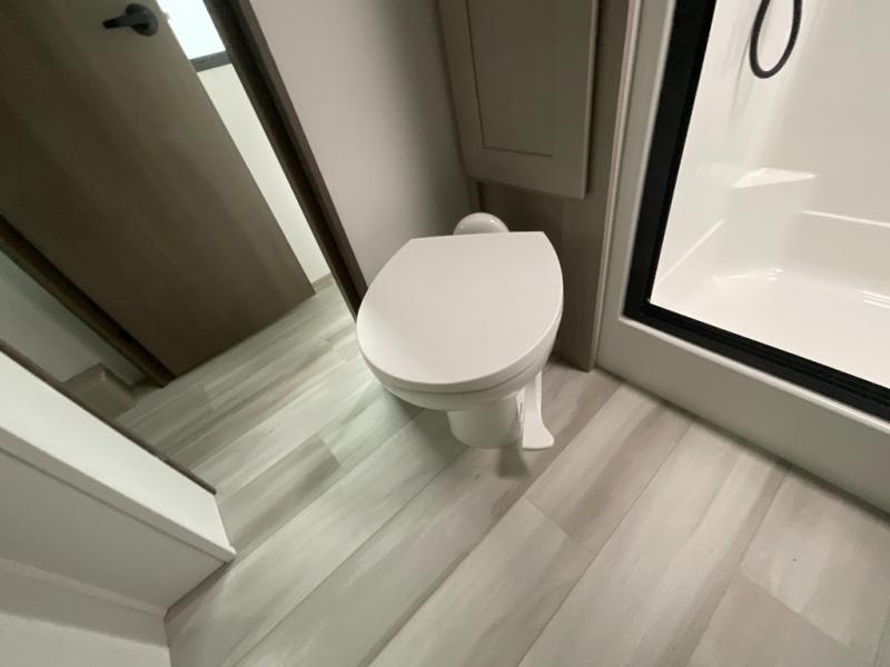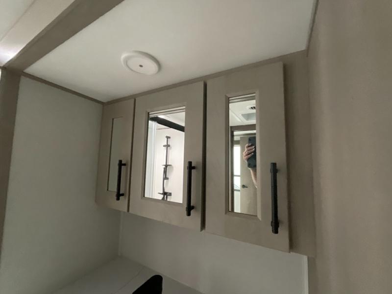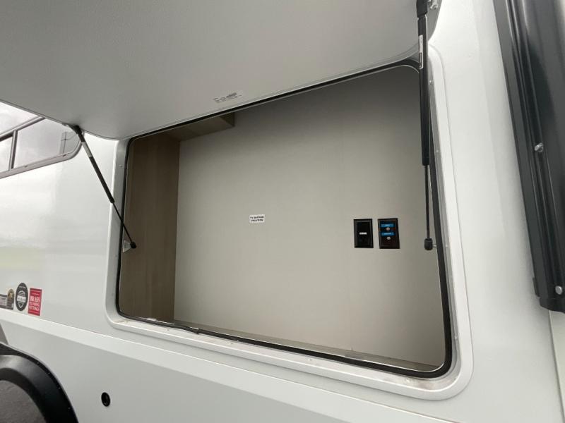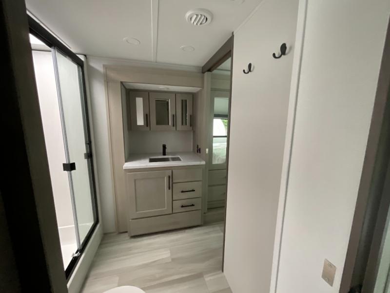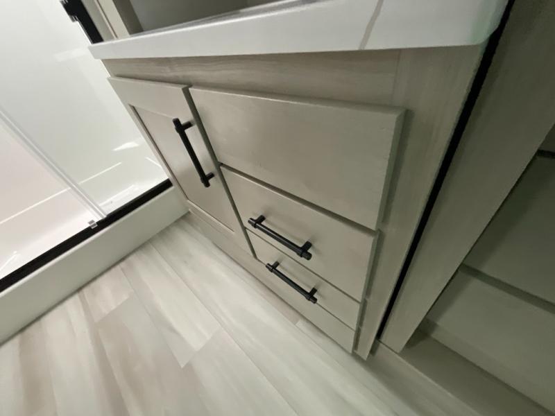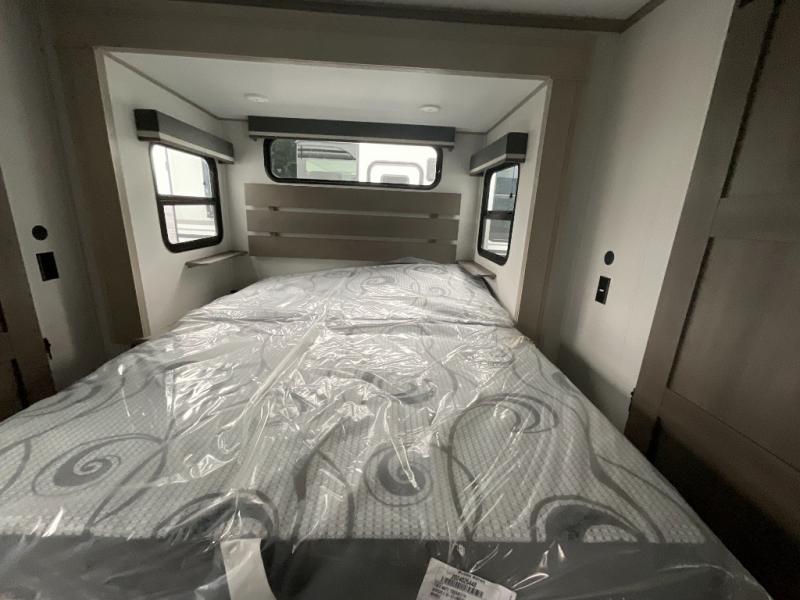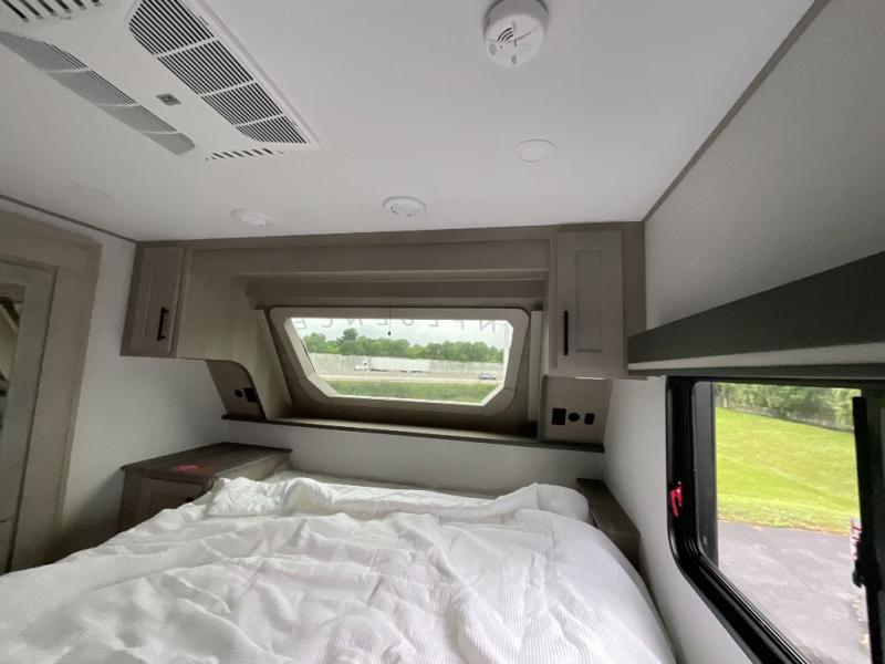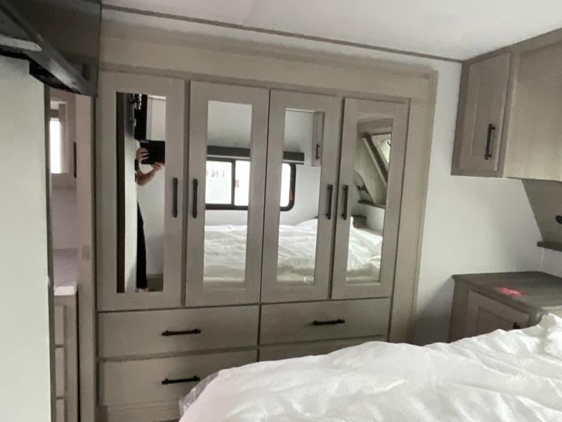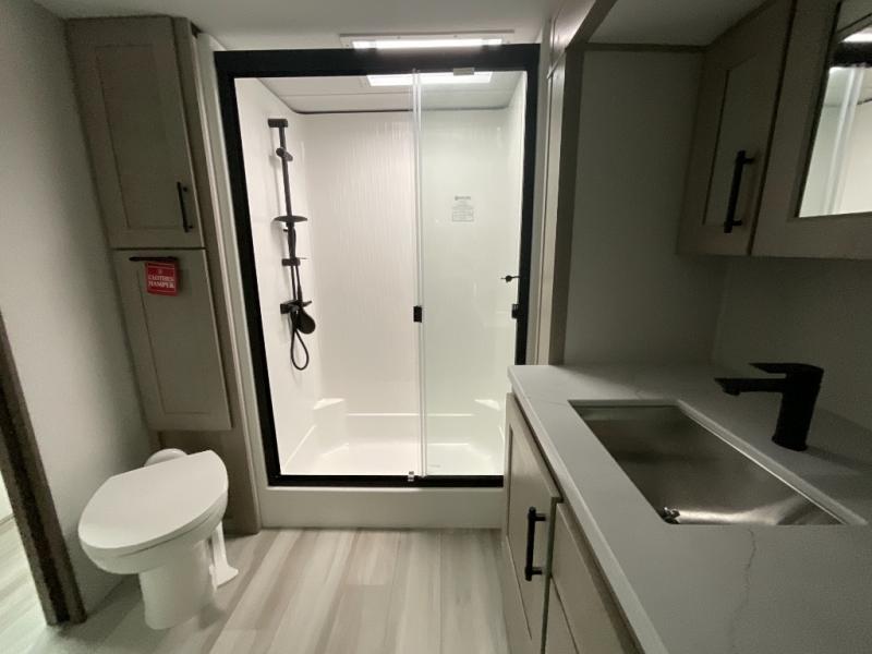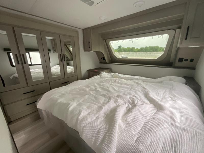 The front master suite is designed as a private retreat with a walk-around king bed, dual wardrobes, overhead storage, and privacy doors. The full bathroom includes a large shower, a vanity with ample storage, and thoughtful touches that provide residential-level comfort while traveling.