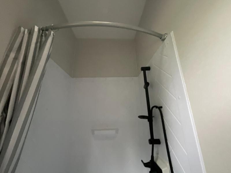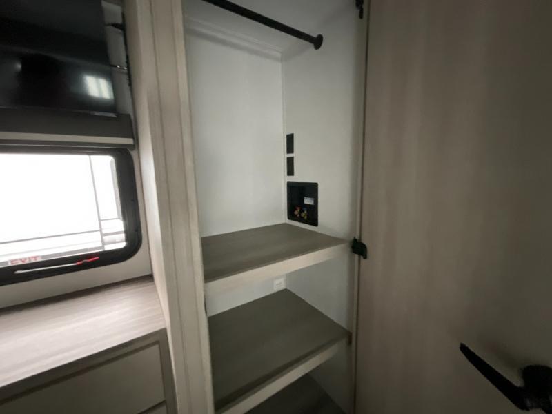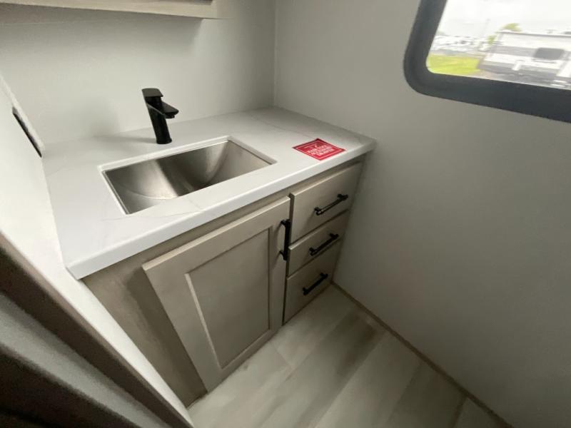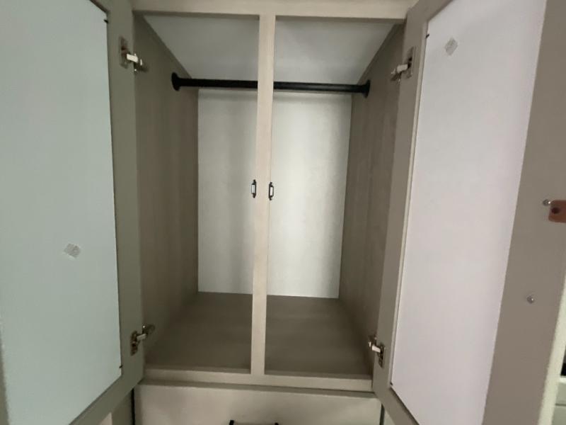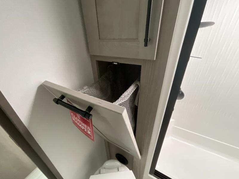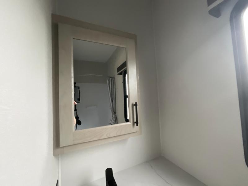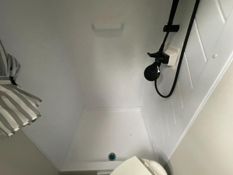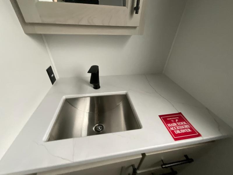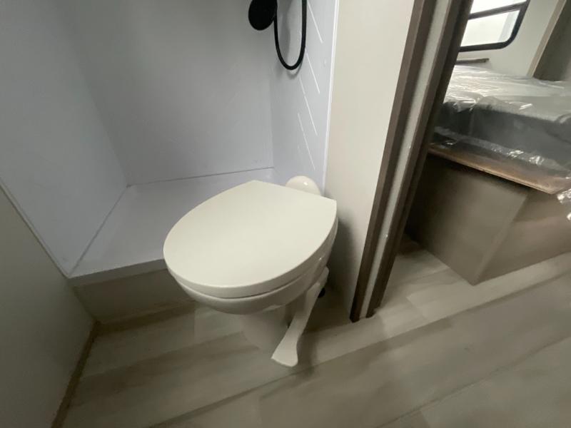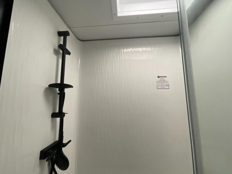 The front master suite is designed as a private retreat with a walk-around king bed, dual wardrobes, overhead storage, and privacy doors. The full bathroom includes a large shower, a vanity with ample storage, and thoughtful touches that provide residential-level comfort while traveling.