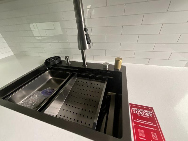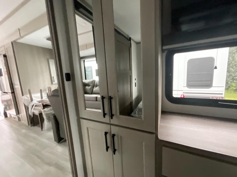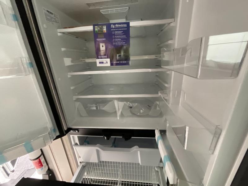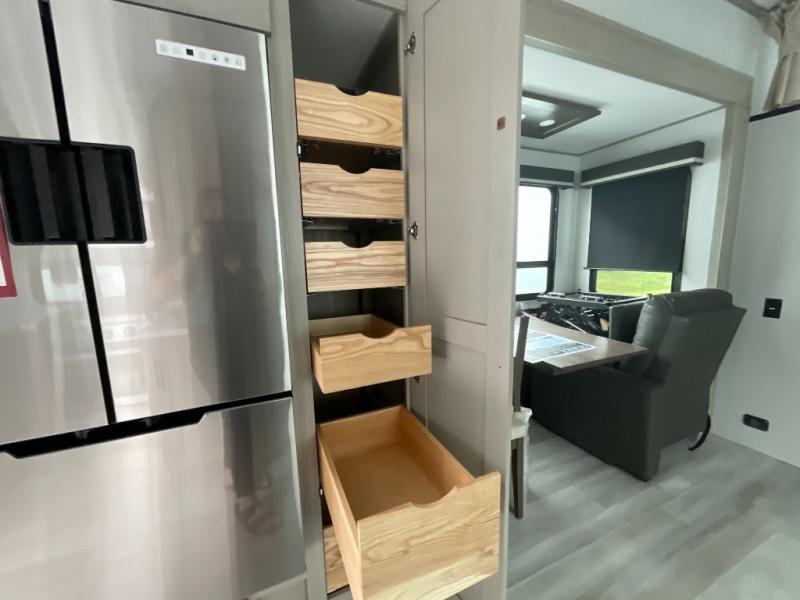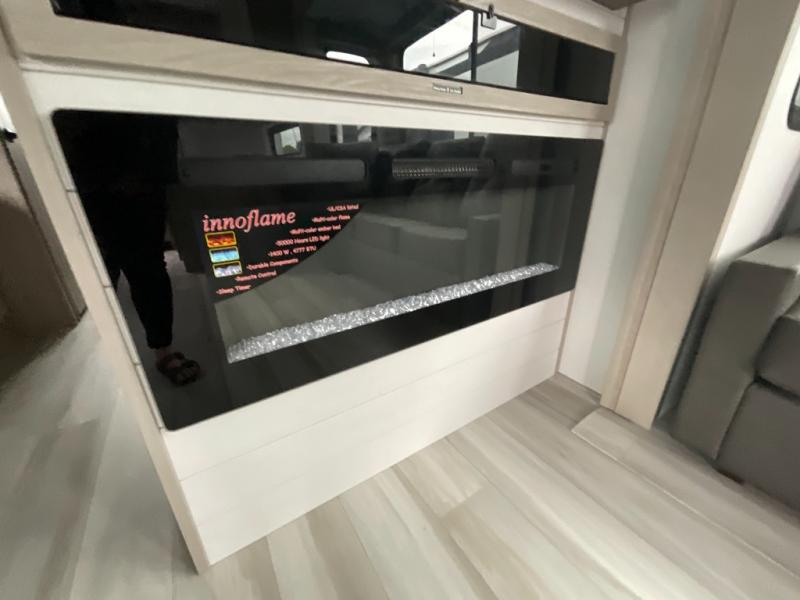 The rear-living design creates an open, inviting environment perfect for entertaining or relaxing after a day on the road. Theater seating, a plush sofa, and a centrally located entertainment center with a large TV and optional fireplace provide ultimate comfort. Panoramic windows fill the interior with natural light, creating a bright, airy atmosphere that brings the outdoors inside.