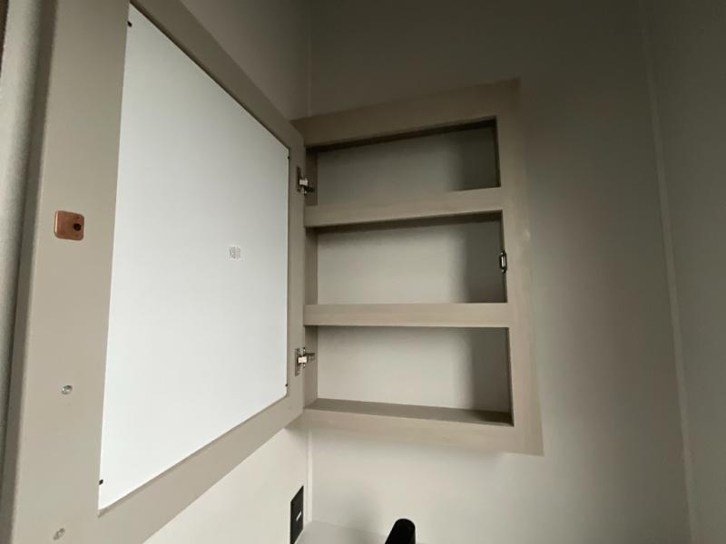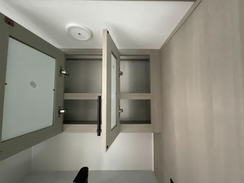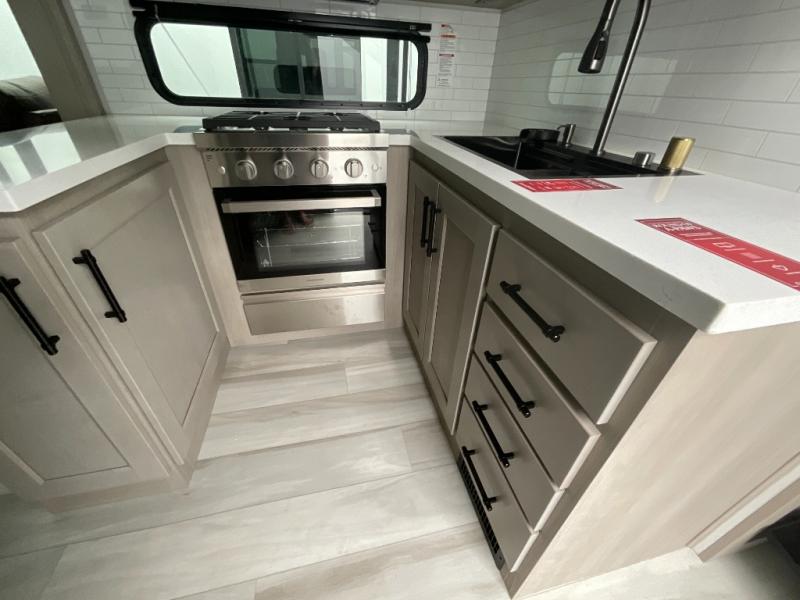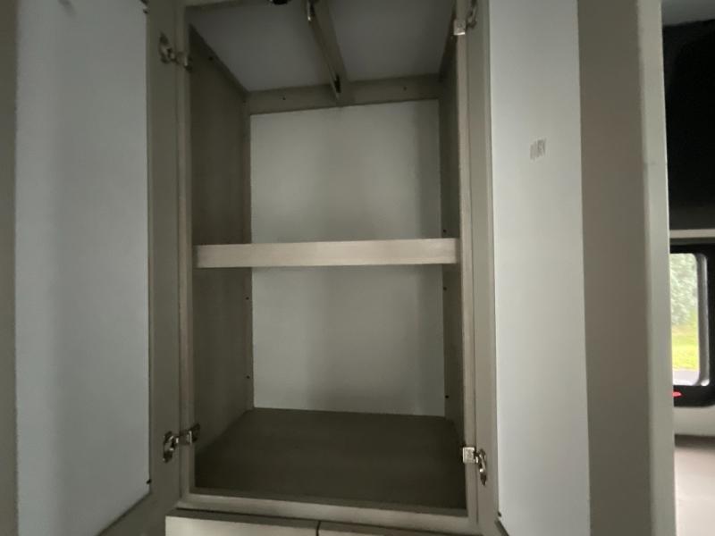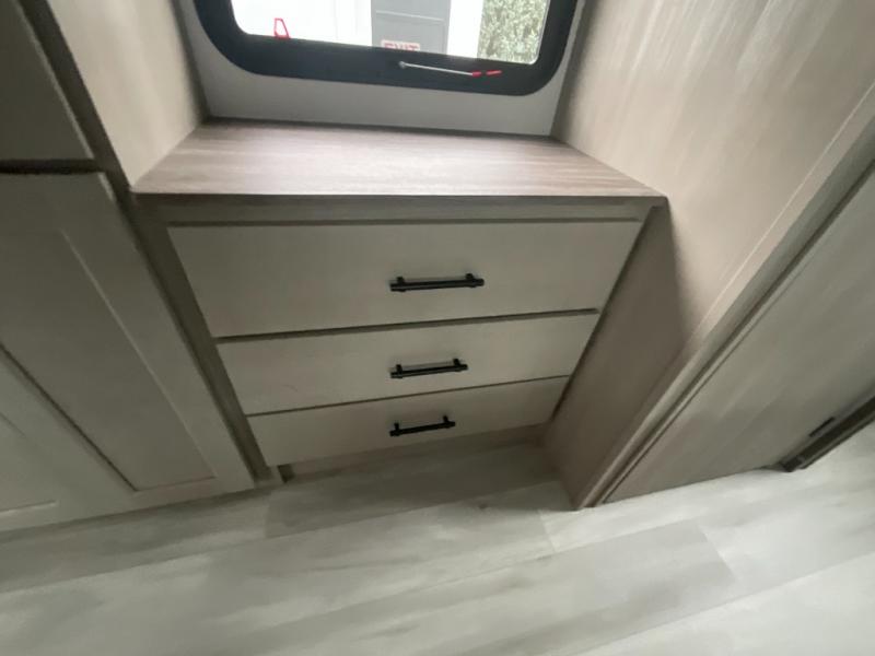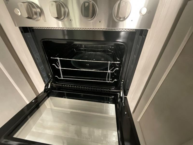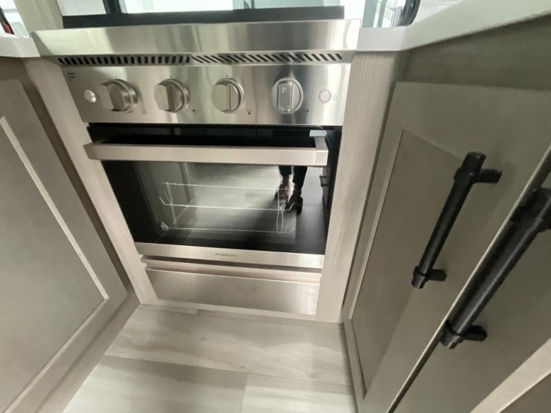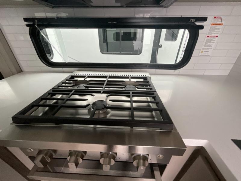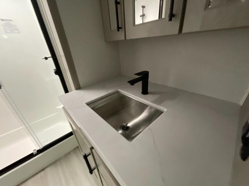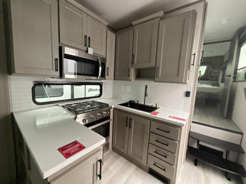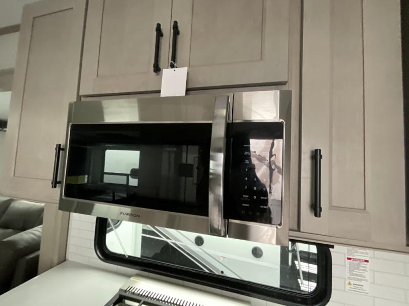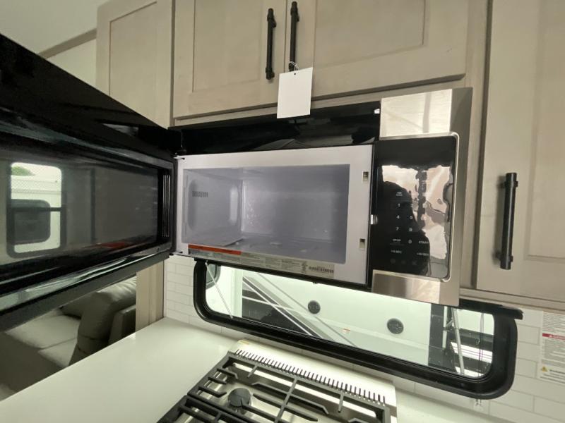 The chef-inspired kitchen is designed for convenience and functionality. Solid-surface countertops, a three-burner cooktop, residential refrigerator, microwave, and abundant cabinetry make meal preparation easy and enjoyable. The adjacent dinette offers a versatile space for dining, playing games, or working remotely, making this motorhome ideal for a variety of lifestyles.