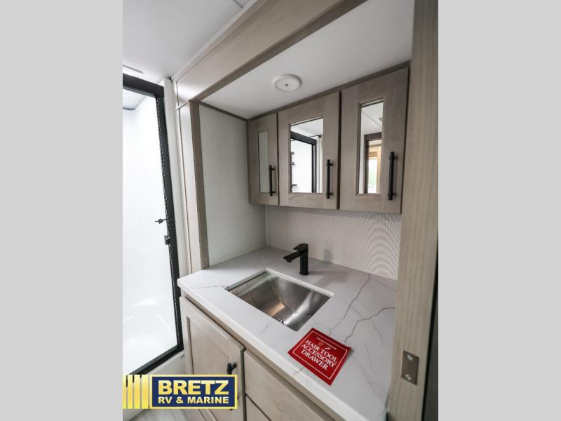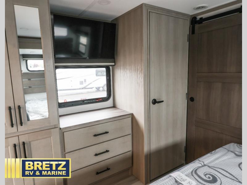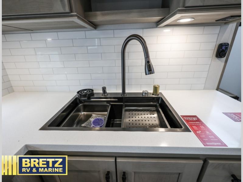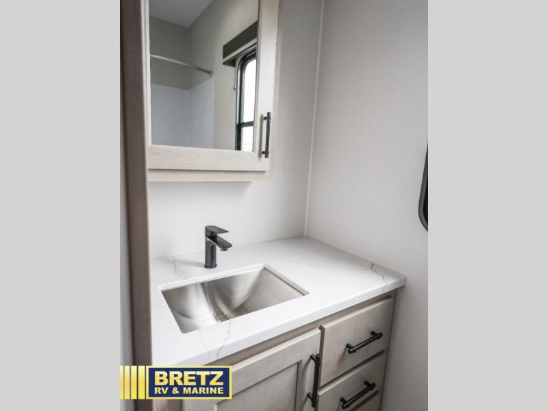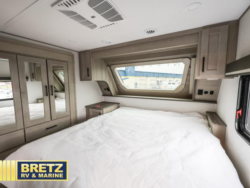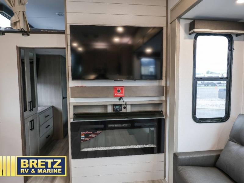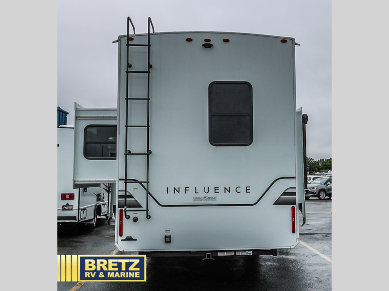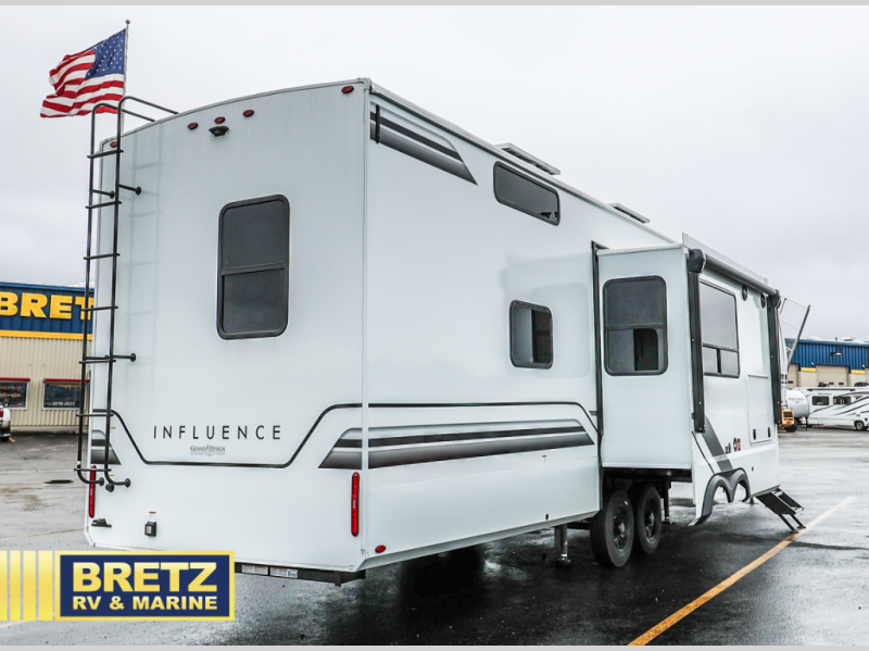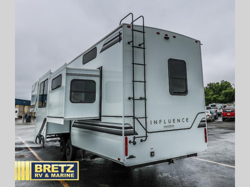 Any Grand Design Influence fifth wheel features five-sided aluminum cage construction with a walk-on roof and a fully enclosed underbelly with heated tanks and storage for all weather camping. For peace of mind, the MORryde CRE3000 Suspension system will provide safe and smooth towing, and the 101" widebody construction offers all the room you need and that is before multiple slides are fully engaged. You will appreciate the Keyed-Alike locks, slam-latch baggage doors with magnetic door catches, exterior security light, and SolidStep entry steps. On the inside, Congoleum flooring, premium roller shades for privacy, a hallway handrail for safety, and nightstands with USB ports to keep all of your electronics fully charged. You will also love the On Demand tankless water heater when showering, plus the added heat and ambiance from an electric fireplace, and so much more!