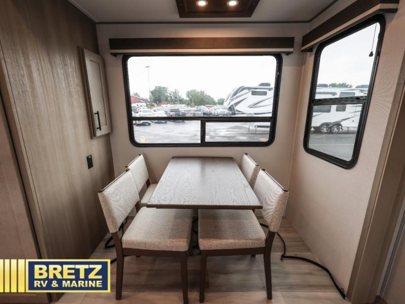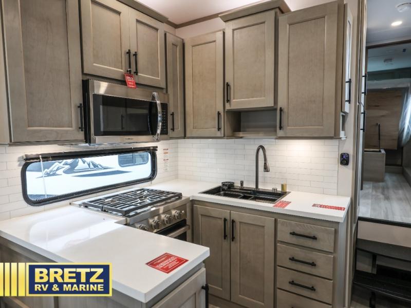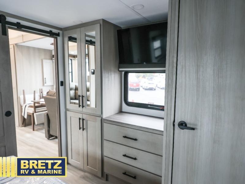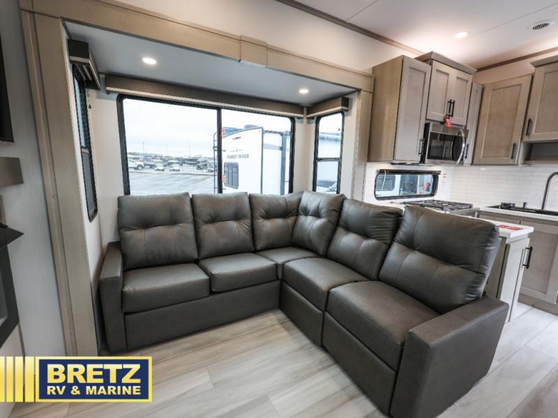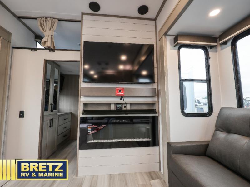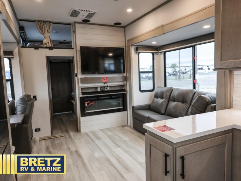 Grab the whole gang and head out in this fifth wheel featuring two private bedrooms, two full baths, and quad slides for even more space in this widebody layout. The living area featuring dual opposing slides offers space to dine and relax including an L-shaped sofa with recliners opposite the entertainment center and fireplace. You'll also love the full kitchen with ample counter space, a spice rack above the microwave, a pull-out pet dish, and more convenient features. The front master bedroom includes a queen bed with an optional king bed, a private entrance into the dual entry bath, plus a slide out with the wardrobe and bath sink. And your guests can take the second master bedroom with a folding queen bed slide, washer and dryer prep, a full rear bath, and even a loft above for more sleeping space!