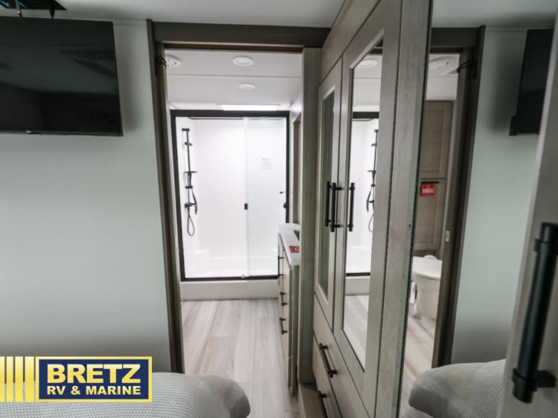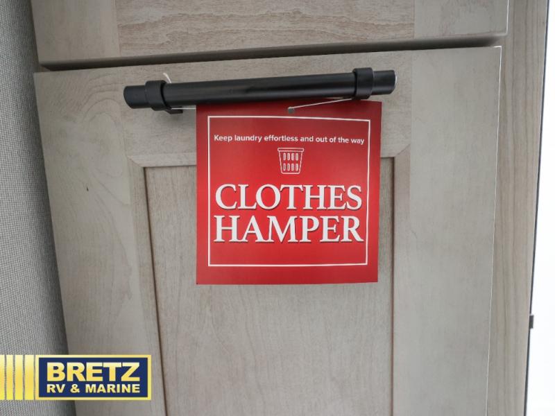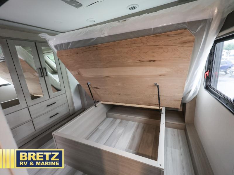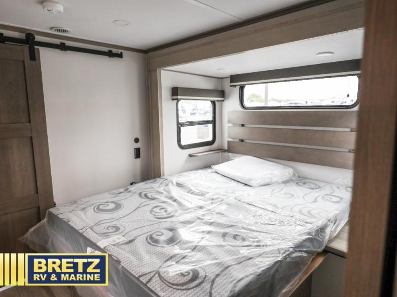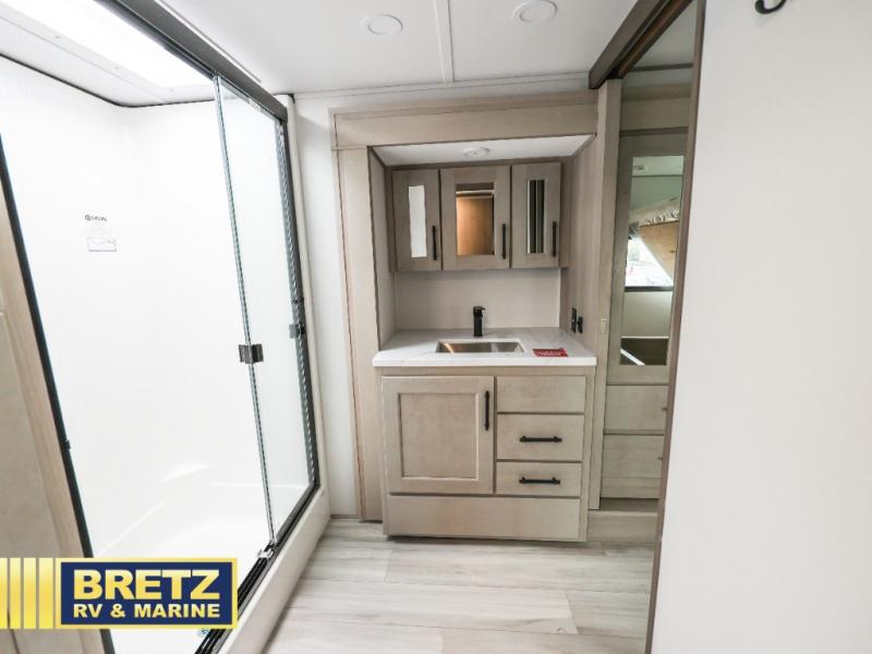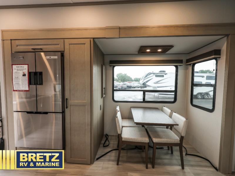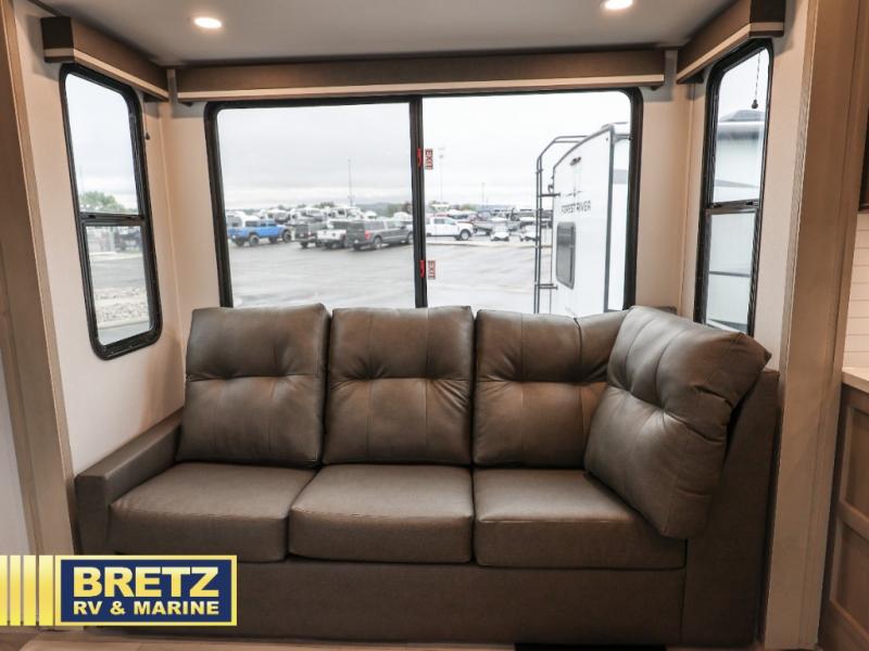 Grab the whole gang and head out in this fifth wheel featuring two private bedrooms, two full baths, and quad slides for even more space in this widebody layout. The living area featuring dual opposing slides offers space to dine and relax including an L-shaped sofa with recliners opposite the entertainment center and fireplace. You'll also love the full kitchen with ample counter space, a spice rack above the microwave, a pull-out pet dish, and more convenient features. The front master bedroom includes a queen bed with an optional king bed, a private entrance into the dual entry bath, plus a slide out with the wardrobe and bath sink. And your guests can take the second master bedroom with a folding queen bed slide, washer and dryer prep, a full rear bath, and even a loft above for more sleeping space!