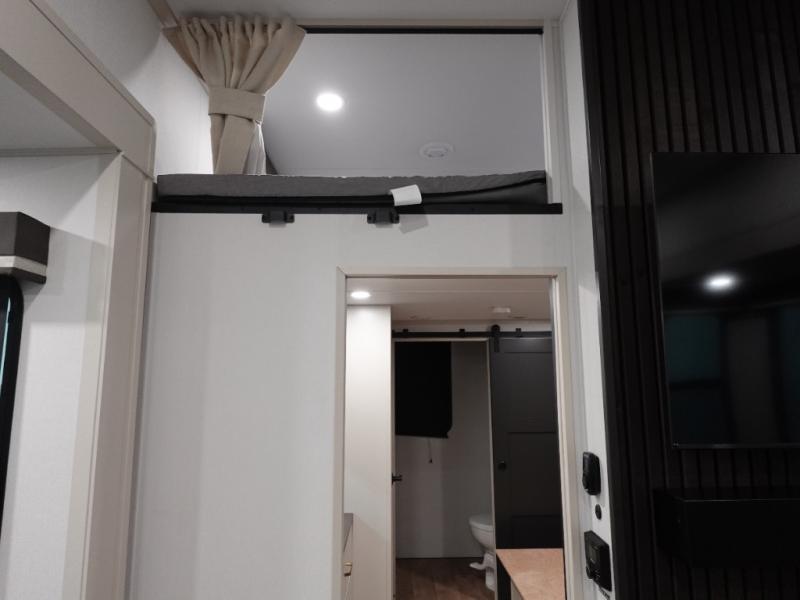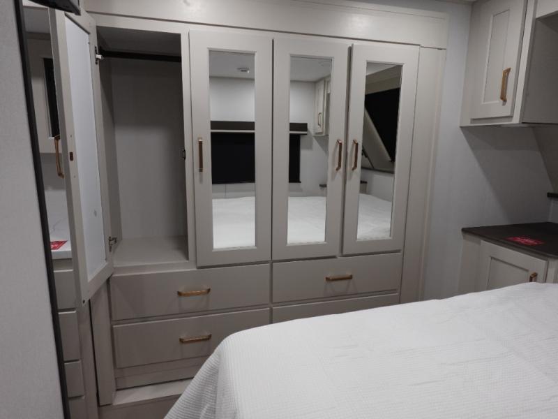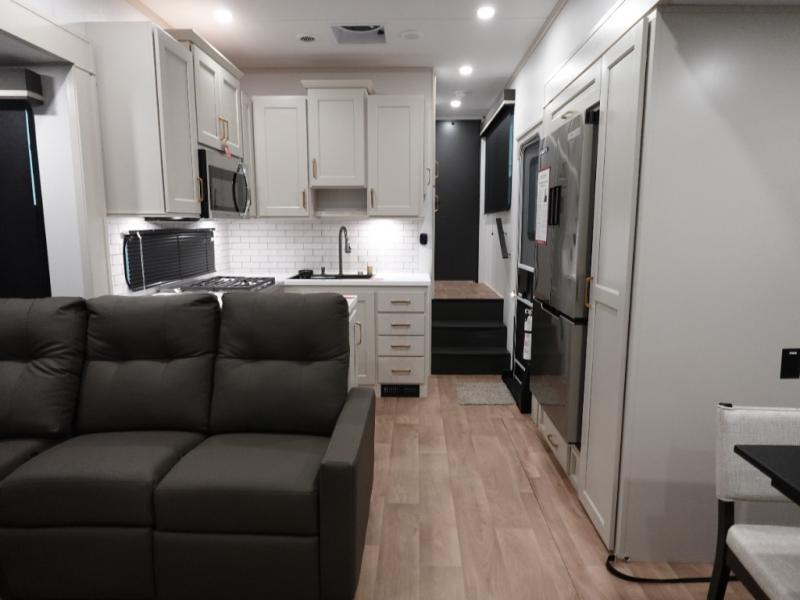Grab the whole gang and head out in this fifth wheel featuring two private bedrooms, two full baths, and quad slides for even more space in this widebody layout. The living area featuring dual opposing slides offers space to dine and relax including an L-shaped sofa with recliners opposite the entertainment center and fireplace. You'll also love the full kitchen with ample counter space, a spice rack above the microwave, a pull-out pet dish, and more convenient features. The front master bedroom includes a king bed, a private entrance into the dual entry bath, plus a slide out with the wardrobe and bath sink. And your guests can take the second master bedroom with a folding queen bed slide, washer and dryer prep, a full rear bath, and even a loft above for more sleeping space!