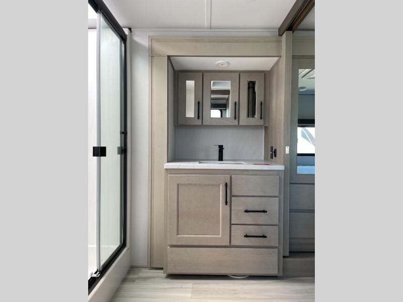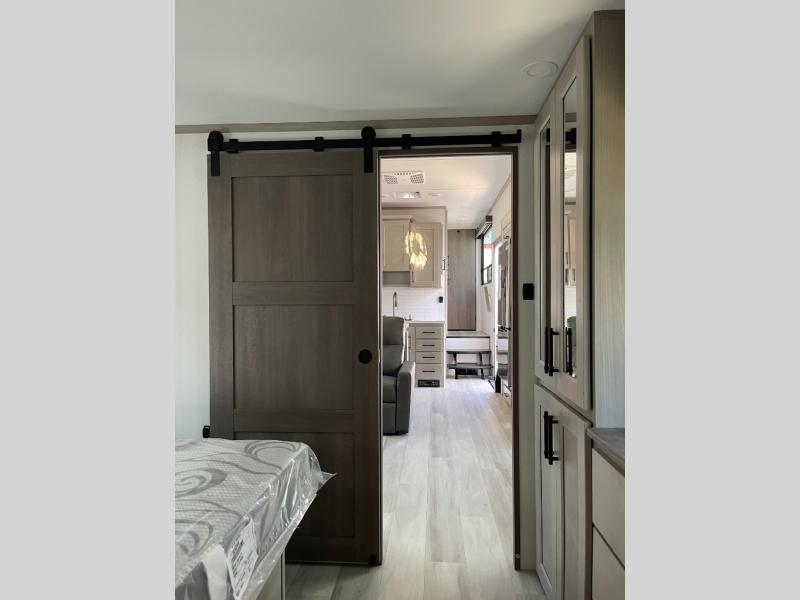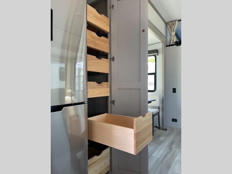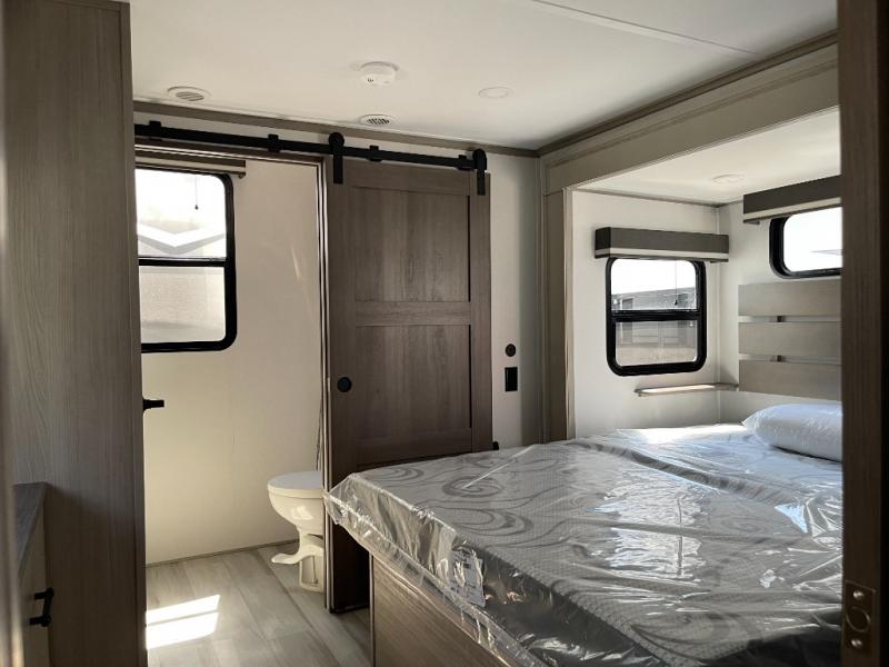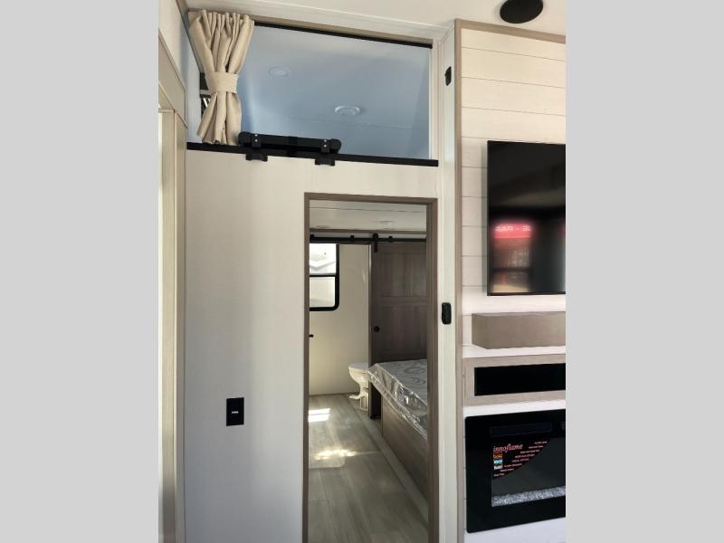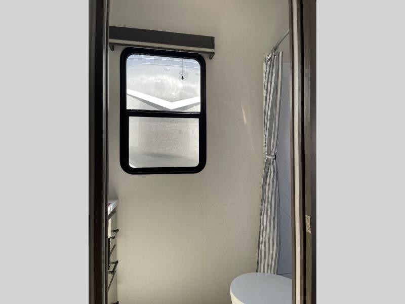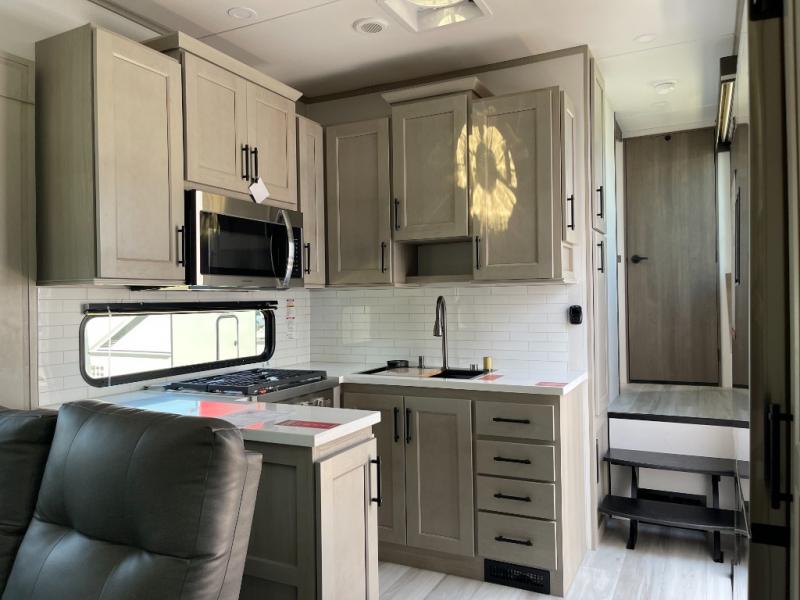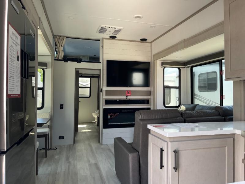 Grab the whole gang and head out in this fifth wheel featuring two private bedrooms, two full baths, and quad slides for even more space in this widebody layout. The living area featuring dual opposing slides offers space to dine and relax including an L-shaped sofa with recliners opposite the entertainment center and fireplace. You'll also love the full kitchen with ample counter space, a spice rack above the microwave, a pull-out pet dish, and more convenient features. The front master bedroom includes a queen bed with an optional king bed, a private entrance into the dual entry bath, plus a slide out with the wardrobe and bath sink. And your guests can take the second master bedroom with a folding queen bed slide, washer and dryer prep, a full rear bath, and even a loft above for more sleeping space!