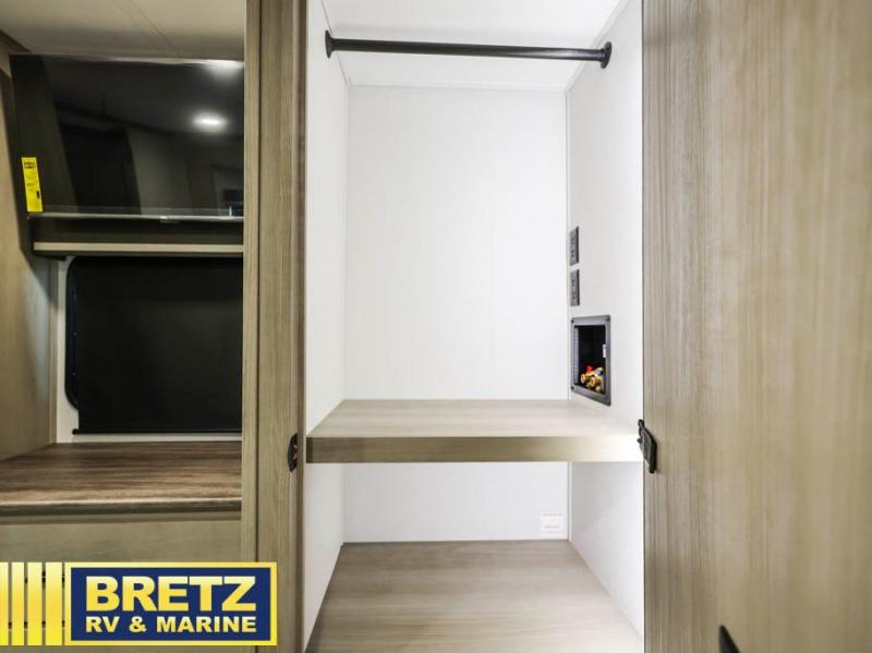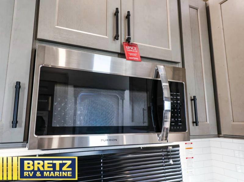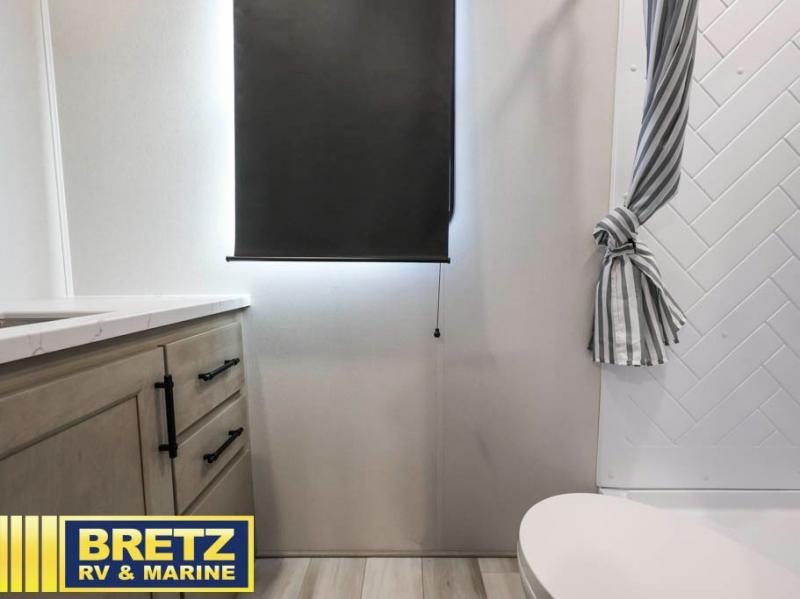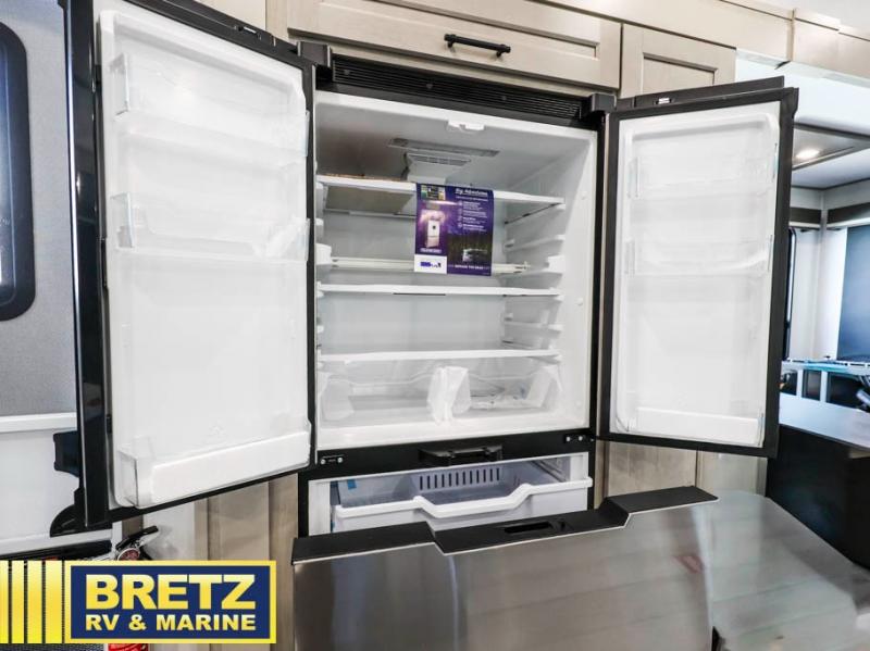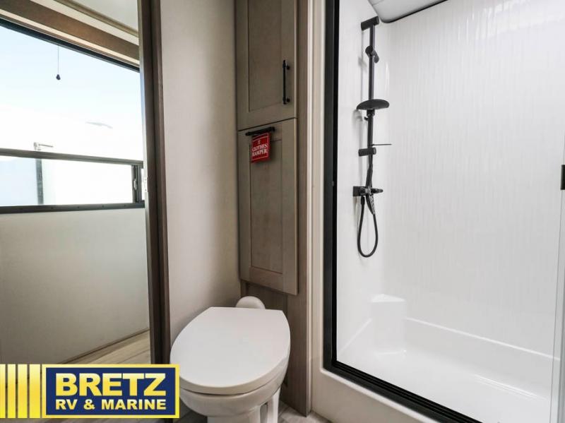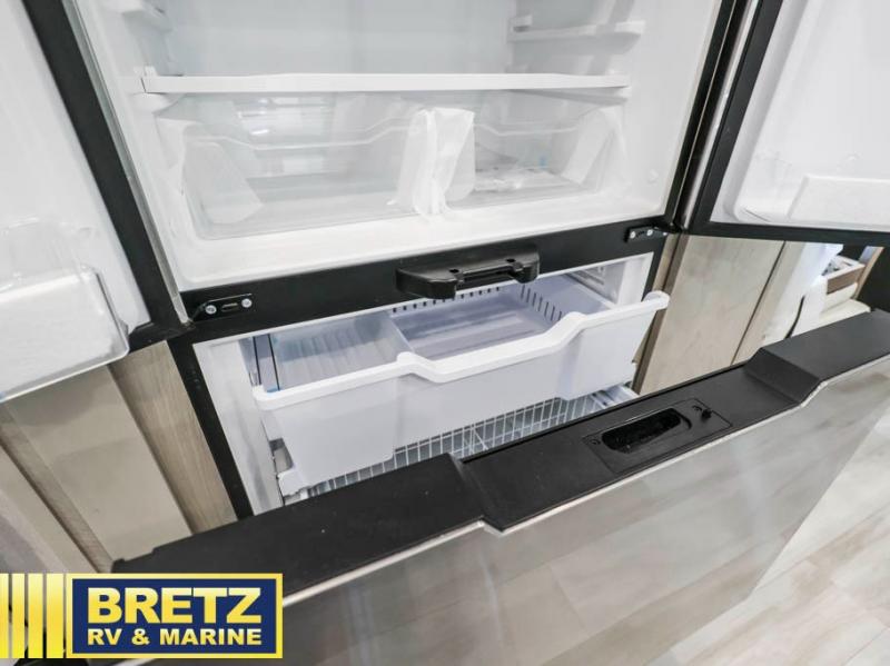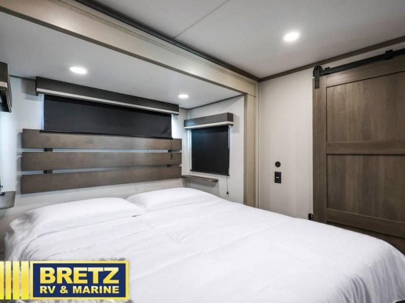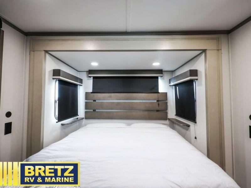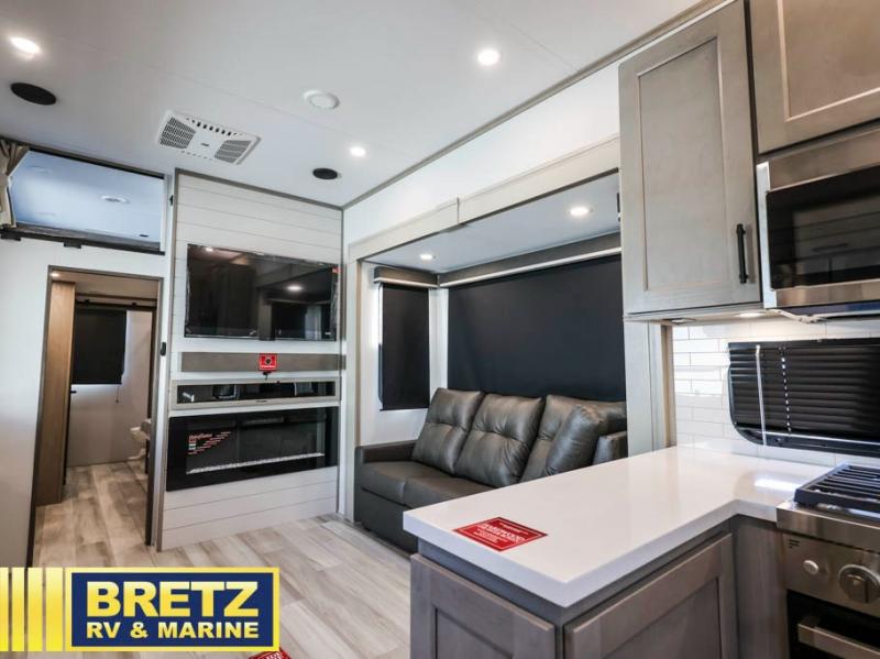 Grab the whole gang and head out in this fifth wheel featuring two private bedrooms, two full baths, and quad slides for even more space in this widebody layout. The living area featuring dual opposing slides offers space to dine and relax including an L-shaped sofa with recliners opposite the entertainment center and fireplace. You'll also love the full kitchen with ample counter space, a spice rack above the microwave, a pull-out pet dish, and more convenient features. The front master bedroom includes a queen bed with an optional king bed, a private entrance into the dual entry bath, plus a slide out with the wardrobe and bath sink. And your guests can take the second master bedroom with a folding queen bed slide, washer and dryer prep, a full rear bath, and even a loft above for more sleeping space!