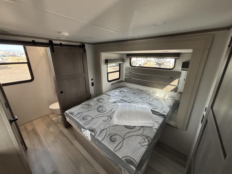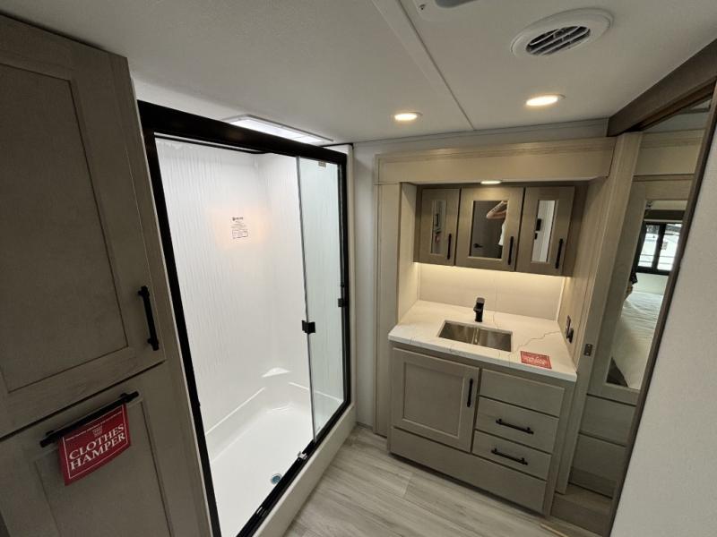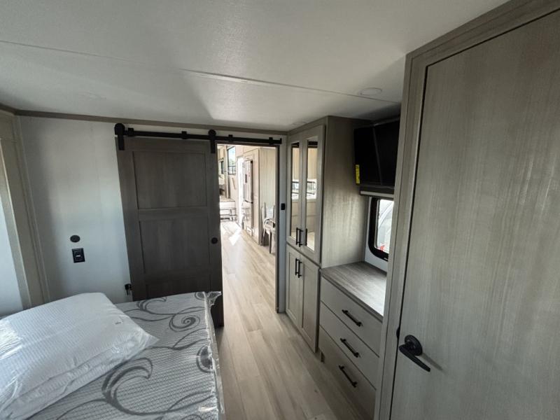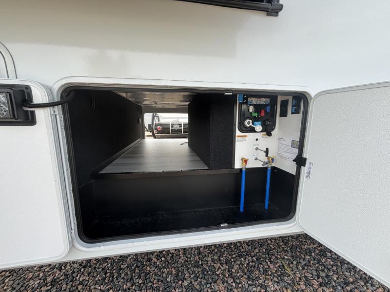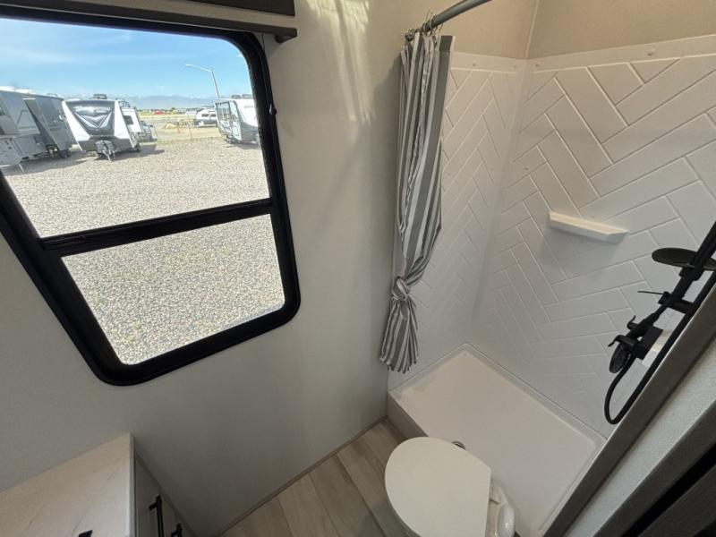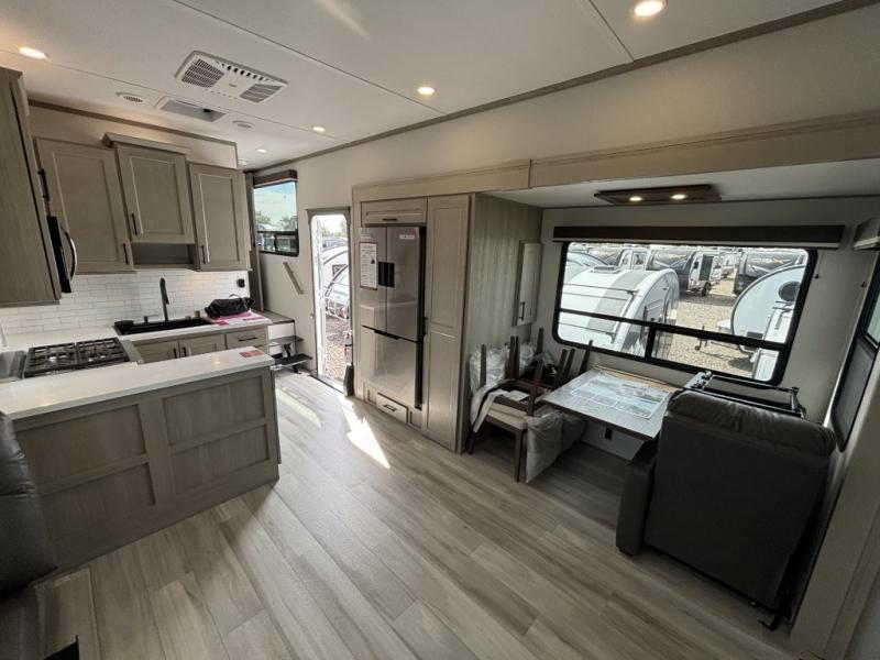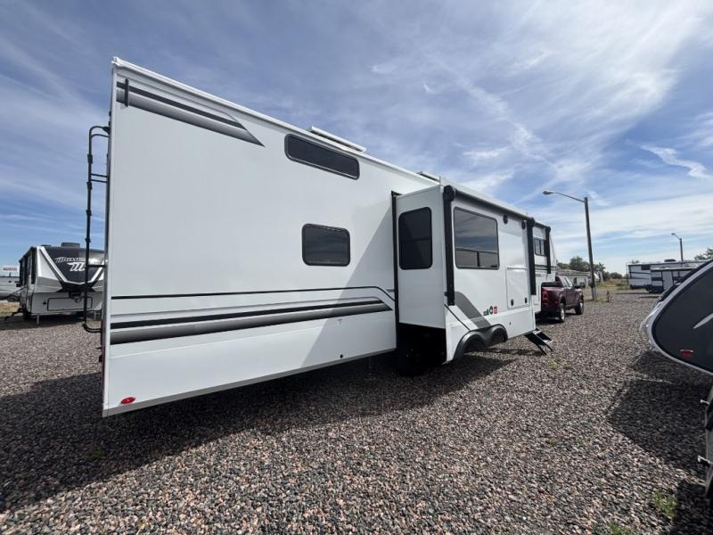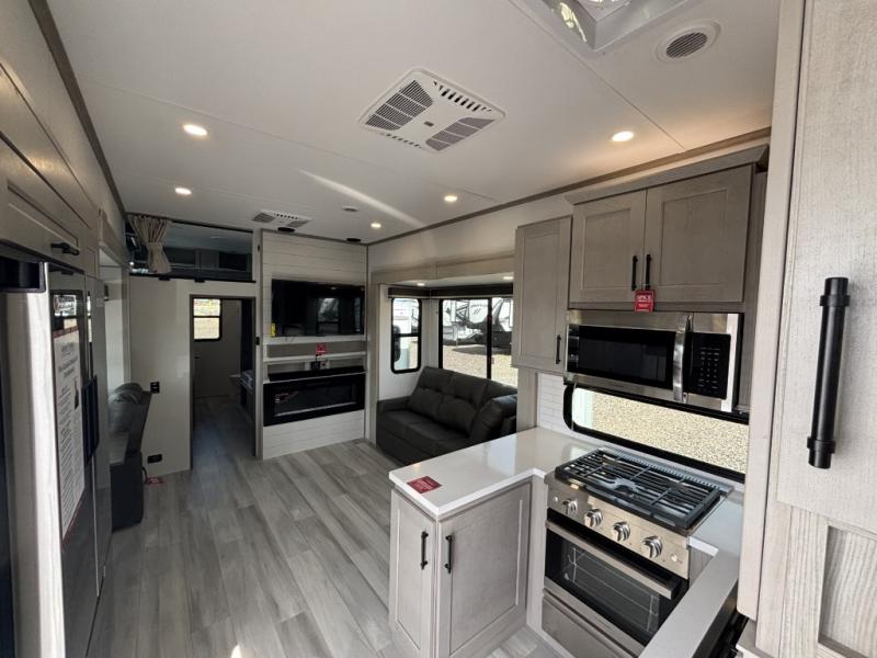 Grab the whole gang and head out in this fifth wheel featuring two private bedrooms, two full baths, and quad slides for even more space in this widebody layout. The living area featuring dual opposing slides offers space to dine and relax including an L-shaped sofa with recliners opposite the entertainment center and fireplace. You'll also love the full kitchen with ample counter space, a spice rack above the microwave, a pull-out pet dish, and more convenient features. The front master bedroom includes a queen bed with an optional king bed, a private entrance into the dual entry bath, plus a slide out with the wardrobe and bath sink. And your guests can take the second master bedroom with a folding queen bed slide, washer and dryer prep, a full rear bath, and even a loft above for more sleeping space!