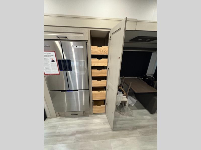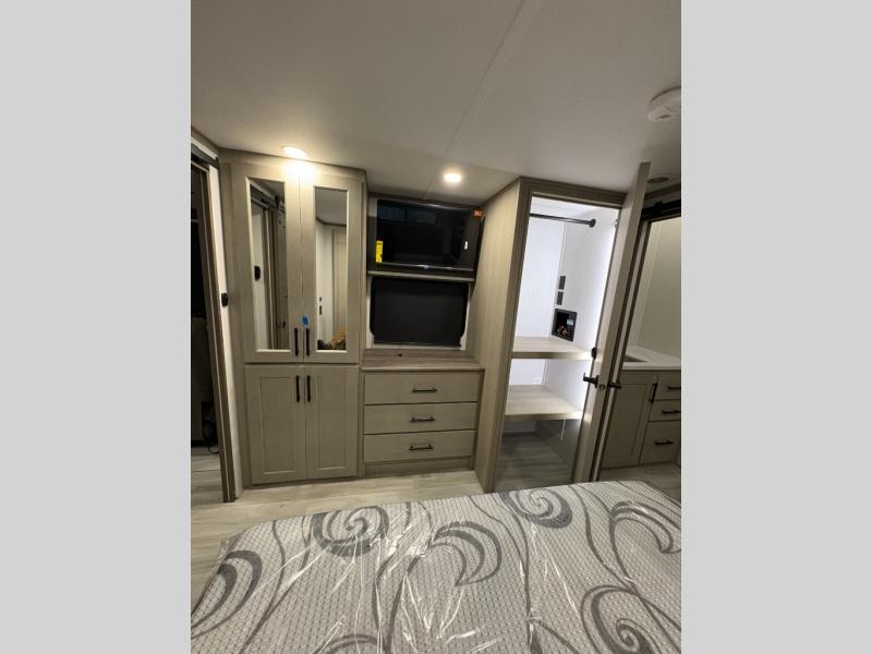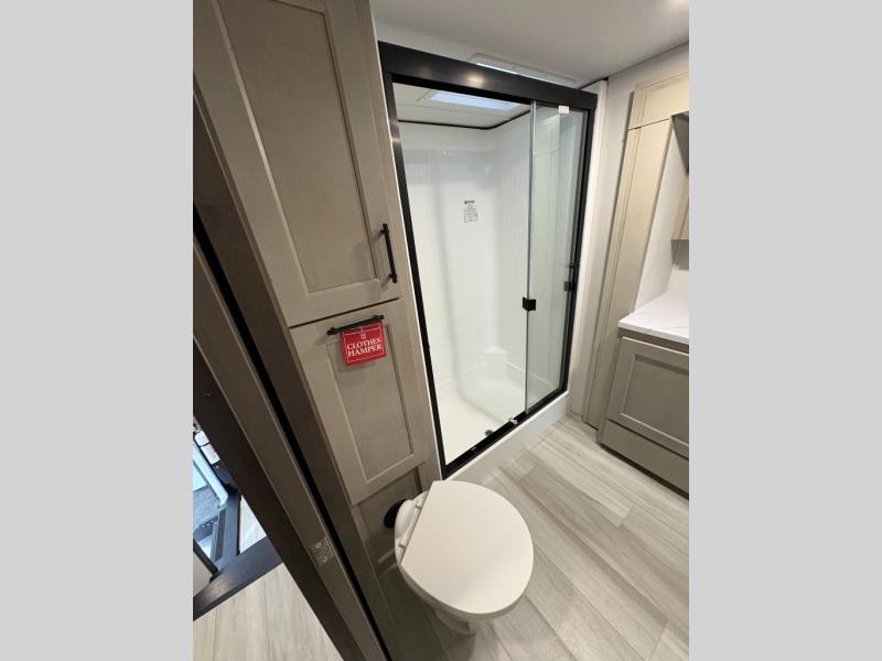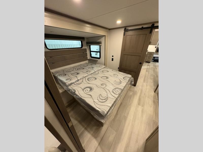 Grab the whole gang and head out in this fifth wheel featuring two private bedrooms, two full baths, and quad slides for even more space in this widebody layout. The living area featuring dual opposing slides offers space to dine and relax including an L-shaped sofa with recliners opposite the entertainment center and fireplace. You'll also love the full kitchen with ample counter space, a spice rack above the microwave, a pull-out pet dish, and more convenient features. The front master bedroom includes a queen bed with an optional king bed, a private entrance into the dual entry bath, plus a slide out with the wardrobe and bath sink. And your guests can take the second master bedroom with a folding queen bed slide, washer and dryer prep, a full rear bath, and even a loft above for more sleeping space!
