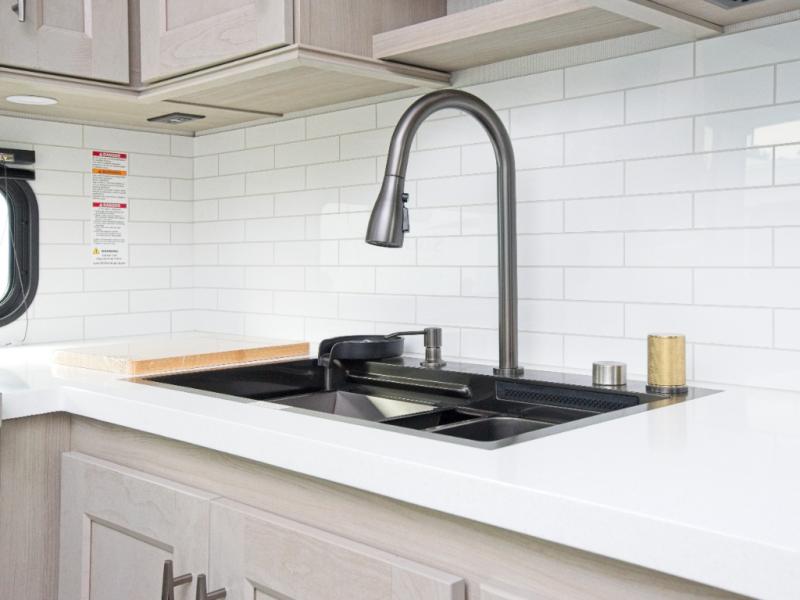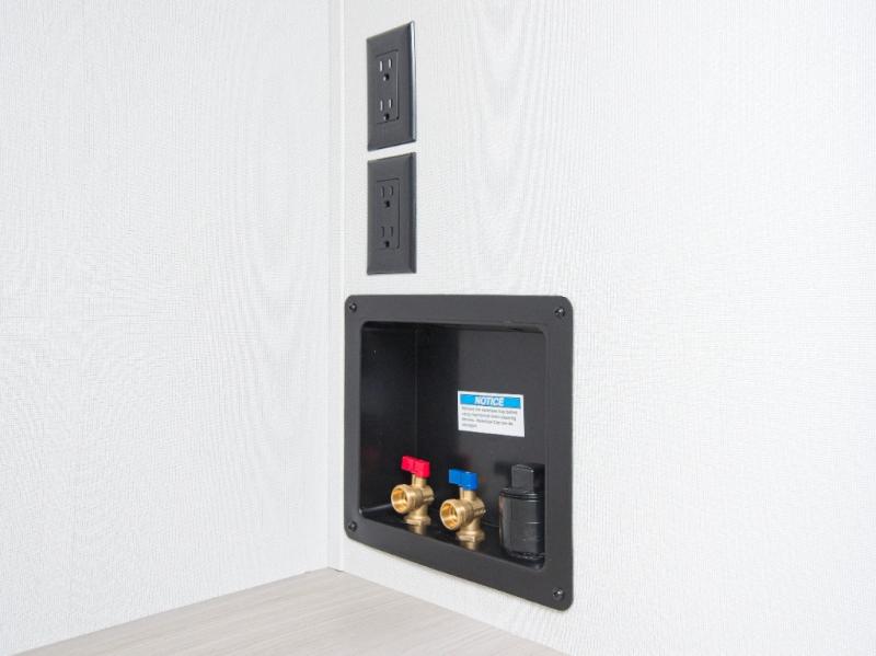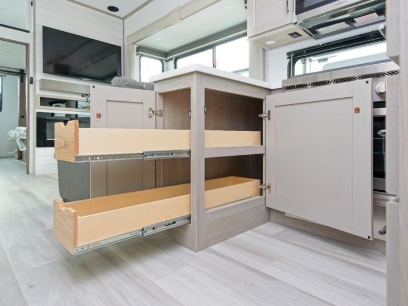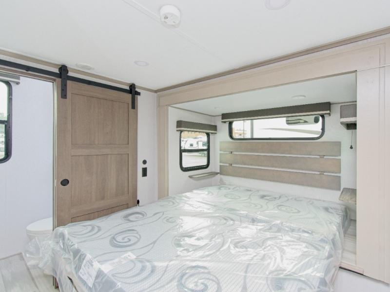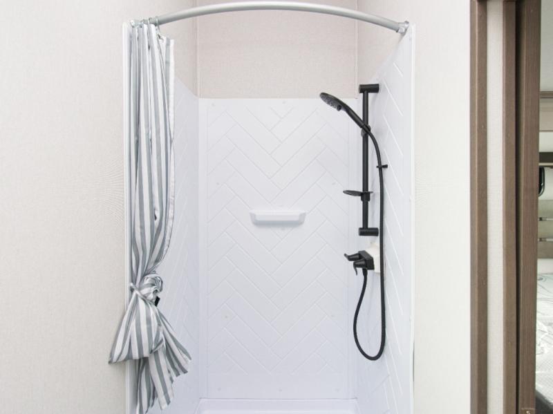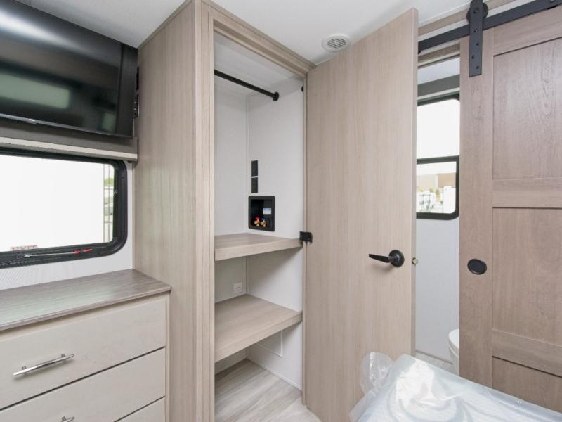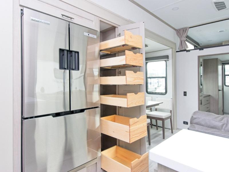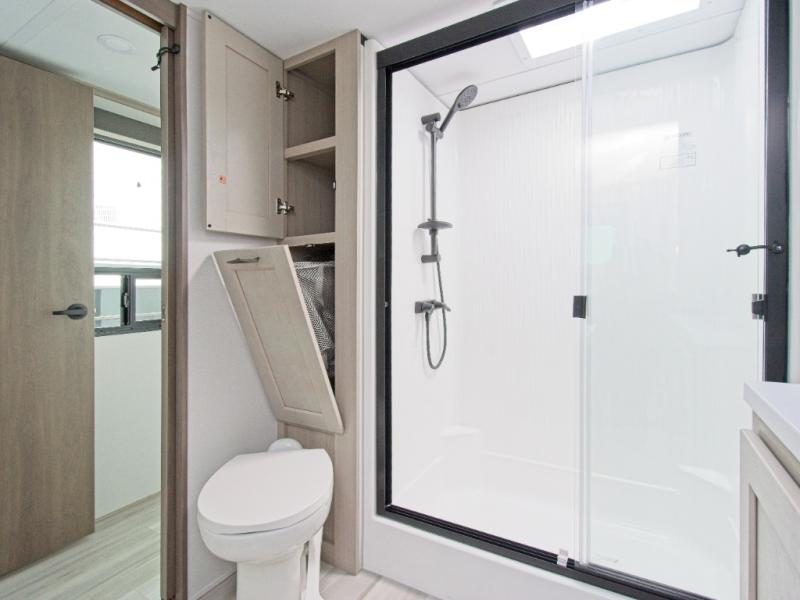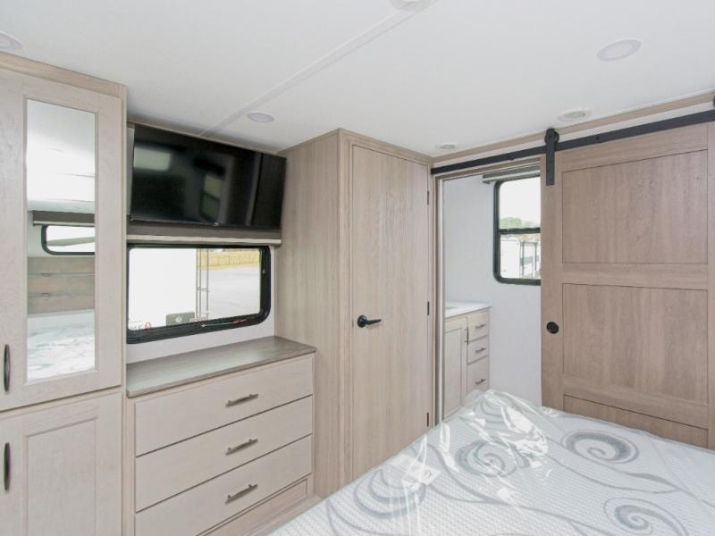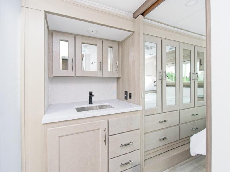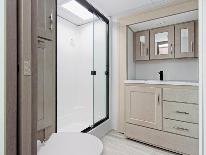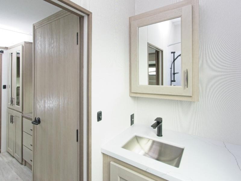 Up front, the primary master suite includes a walk-around queen bed (optional king), a private entrance to the dual-entry bathroom, and a slide-out wardrobe with integrated sink. In the rear, your guests will enjoy their own private bedroom with a folding queen bed slide, washer/dryer prep, a full bath, and even a loft for extra sleeping space.