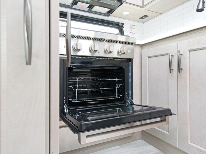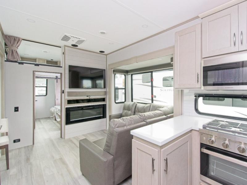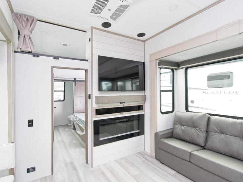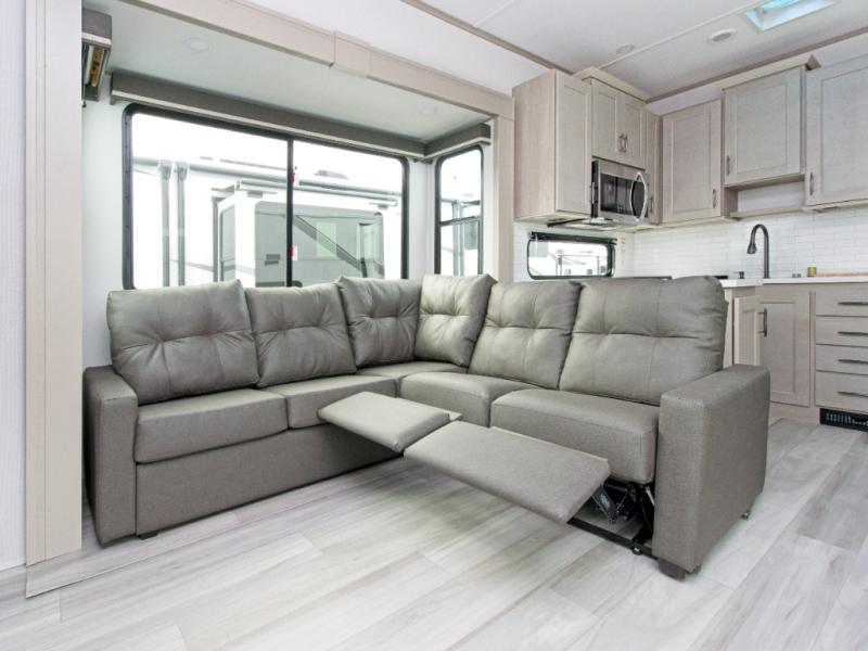 The main living area features dual opposing slides for a wide-open feel, complete with an L-shaped reclining sofa, free-standing dinette, and a cozy fireplace with entertainment center. The fully equipped kitchen includes generous counter space, a spice rack, pull-out pet dish, and modern appliances—making meal prep easy and enjoyable.