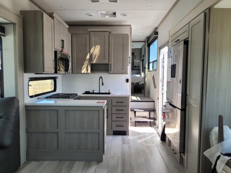 Grab the whole gang and head out in this fifth wheel featuring two private bedrooms, two full baths, and quad slides for even more space in this widebody layout. The living area featuring dual opposing slides offers space to dine and relax including an L-shaped sofa with recliners opposite the entertainment center and fireplace. You'll also love the full kitchen with ample counter space, a spice rack above the microwave, a pull-out pet dish, and more convenient features. The front master bedroom includes a queen bed with an optional king bed, a private entrance into the dual entry bath, plus a slide out with the wardrobe and bath sink. And your guests can take the second master bedroom with a folding queen bed slide, washer and dryer prep, a full rear bath, and even a loft above for more sleeping space!