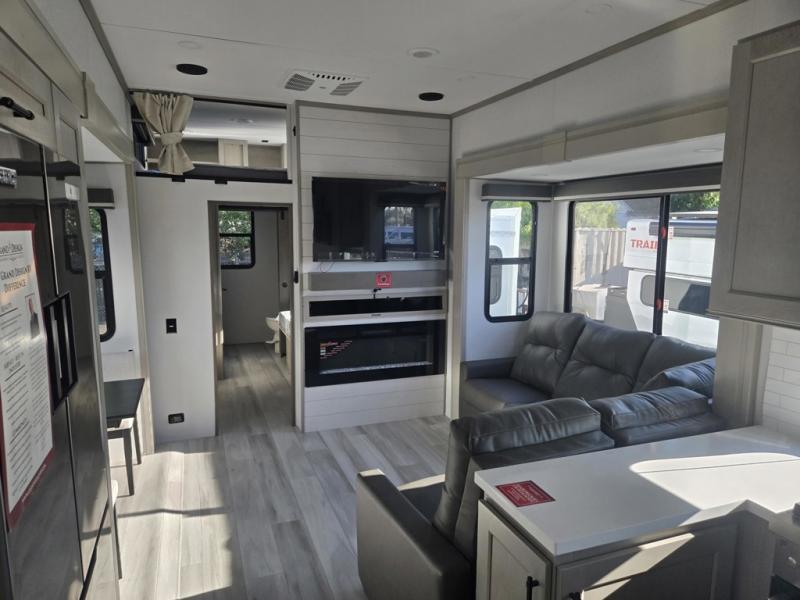 Any Grand Design Influence fifth wheel features five-sided aluminum cage construction with a walk-on roof and a fully enclosed underbelly with heated tanks and storage for all weather camping. For peace of mind, the MORryde CRE3000 Suspension system will provide safe and smooth towing, and the 101" widebody construction offers all the room you need and that is before multiple slides are fully engaged. You will appreciate the Keyed-Alike locks, slam-latch baggage doors with magnetic door catches, exterior security light, and SolidStep entry steps. On the inside, Congoleum flooring, premium roller shades for privacy, a hallway handrail for safety, and nightstands with USB ports to keep all of your electronics fully charged. You will also love the On Demand tankless water heater when showering, plus the added heat and ambiance from an electric fireplace, and so much more!
