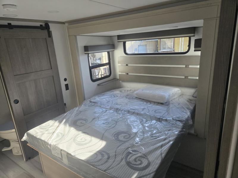 Grab the whole gang and head out in this fifth wheel featuring two private bedrooms, two full baths, and quad slides for even more space in this widebody layout. The living area featuring dual opposing slides offers space to dine and relax including an L-shaped sofa with recliners opposite the entertainment center and fireplace. You'll also love the full kitchen with ample counter space, a spice rack above the microwave, a pull-out pet dish, and more convenient features. The front master bedroom includes a queen bed with an optional king bed, a private entrance into the dual entry bath, plus a slide out with the wardrobe and bath sink. And your guests can take the second master bedroom with a folding queen bed slide, washer and dryer prep, a full rear bath, and even a loft above for more sleeping space!
