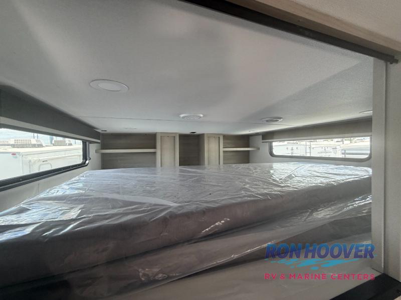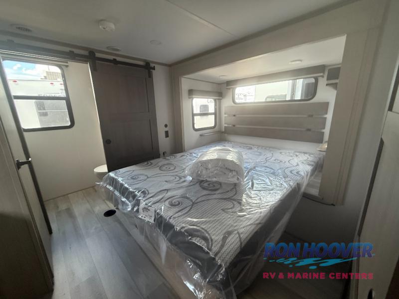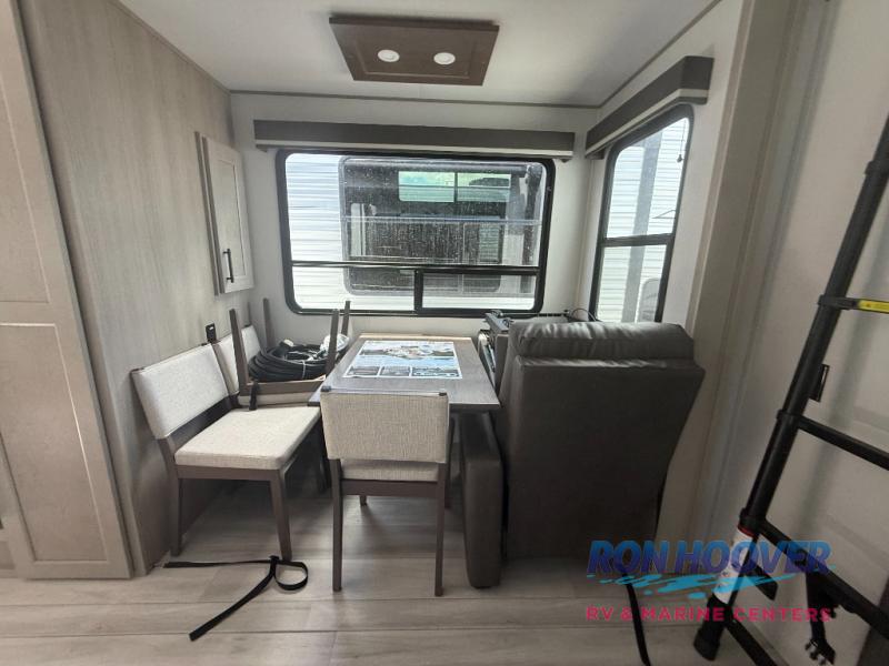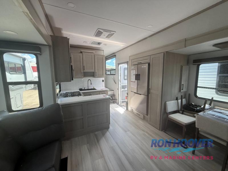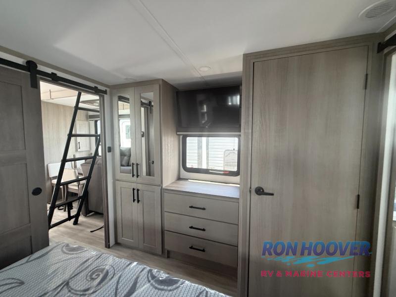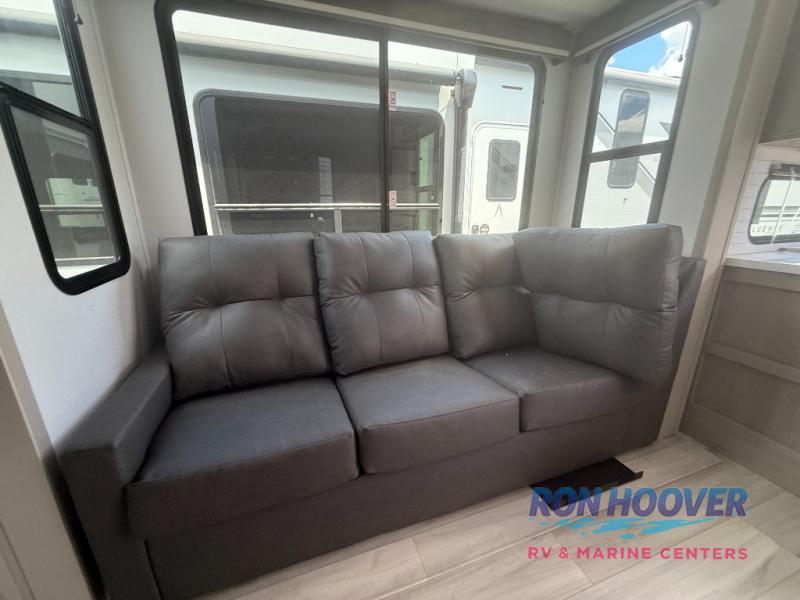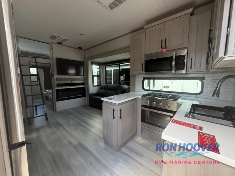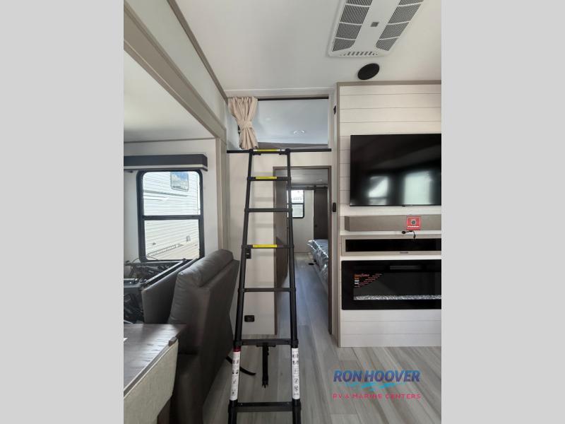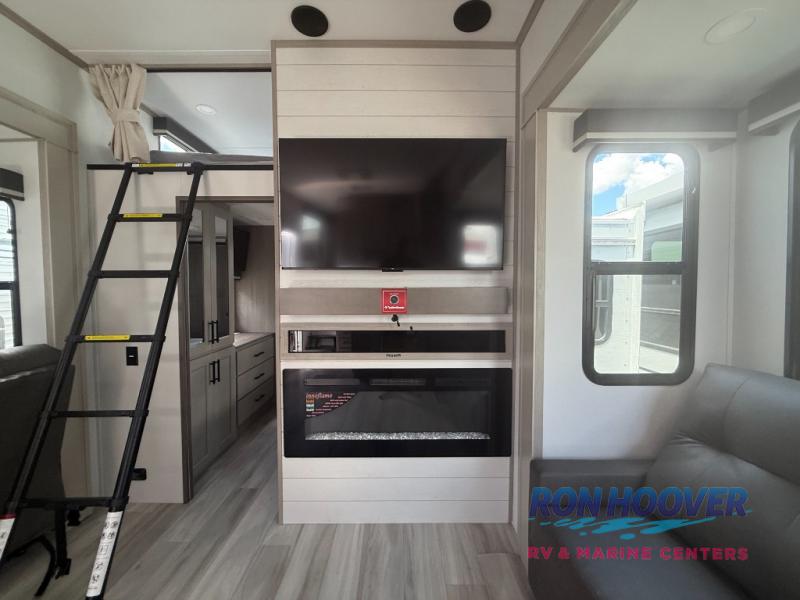 Grab the whole gang and head out in this fifth wheel featuring two private bedrooms, two full baths, and quad slides for even more space in this widebody layout. The living area featuring dual opposing slides offers space to dine and relax including an L-shaped sofa with recliners opposite the entertainment center and fireplace. You'll also love the full kitchen with ample counter space, a spice rack above the microwave, a pull-out pet dish, and more convenient features. The front master bedroom includes a queen bed with an optional king bed, a private entrance into the dual entry bath, plus a slide out with the wardrobe and bath sink. And your guests can take the second master bedroom with a folding queen bed slide, washer and dryer prep, a full rear bath, and even a loft above for more sleeping space!