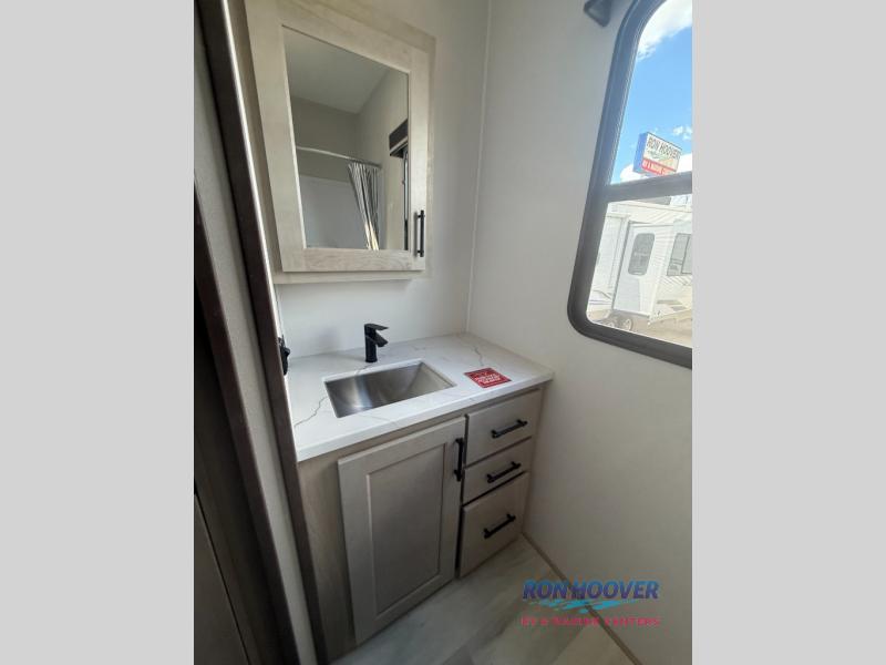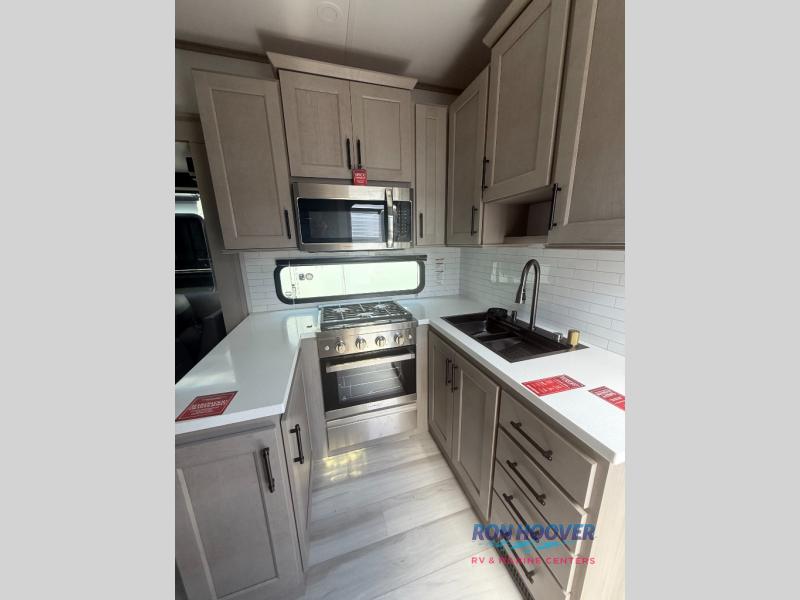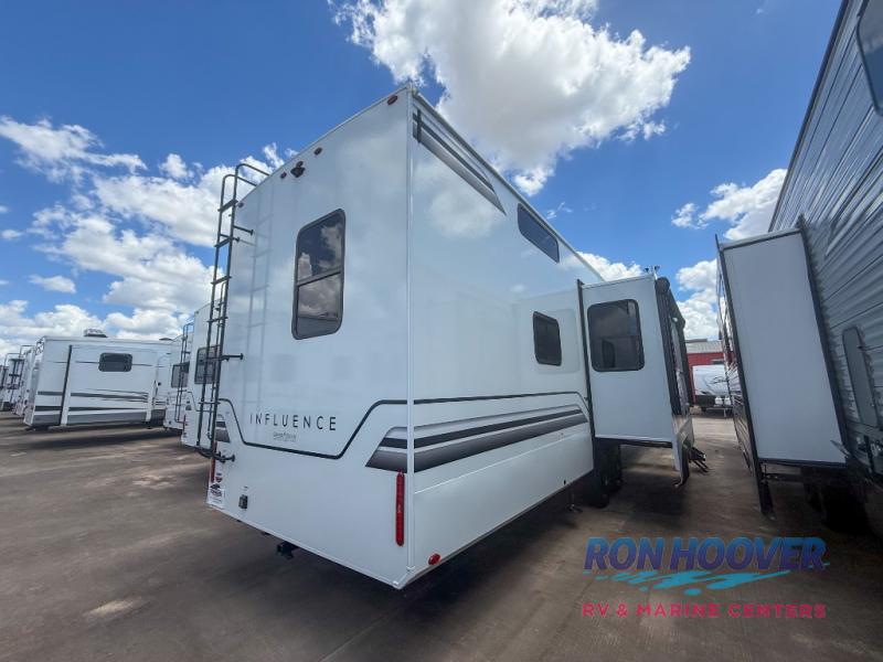 Any Grand Design Influence fifth wheel features five-sided aluminum cage construction with a walk-on roof and a fully enclosed underbelly with heated tanks and storage for all weather camping. For peace of mind, the MORryde CRE3000 Suspension system will provide safe and smooth towing, and the 101" widebody construction offers all the room you need and that is before multiple slides are fully engaged. You will appreciate the Keyed-Alike locks, slam-latch baggage doors with magnetic door catches, exterior security light, and SolidStep entry steps. On the inside, Congoleum flooring, premium roller shades for privacy, a hallway handrail for safety, and nightstands with USB ports to keep all of your electronics fully charged. You will also love the On Demand tankless water heater when showering, plus the added heat and ambiance from an electric fireplace, and so much more!