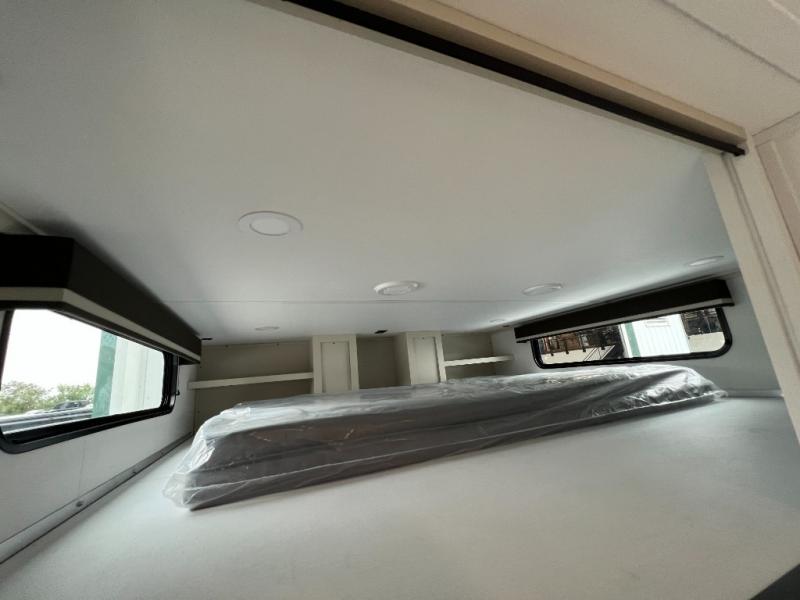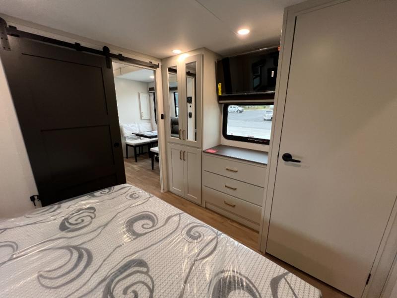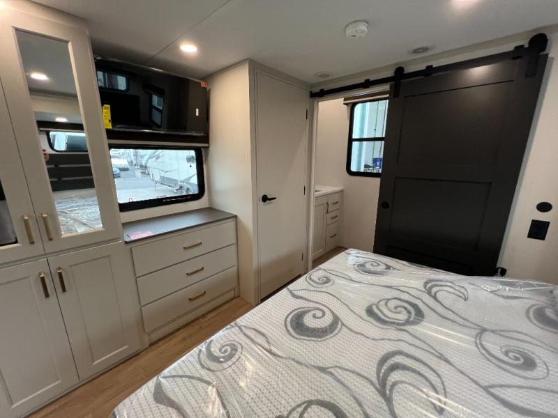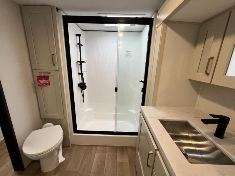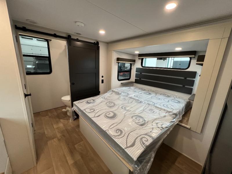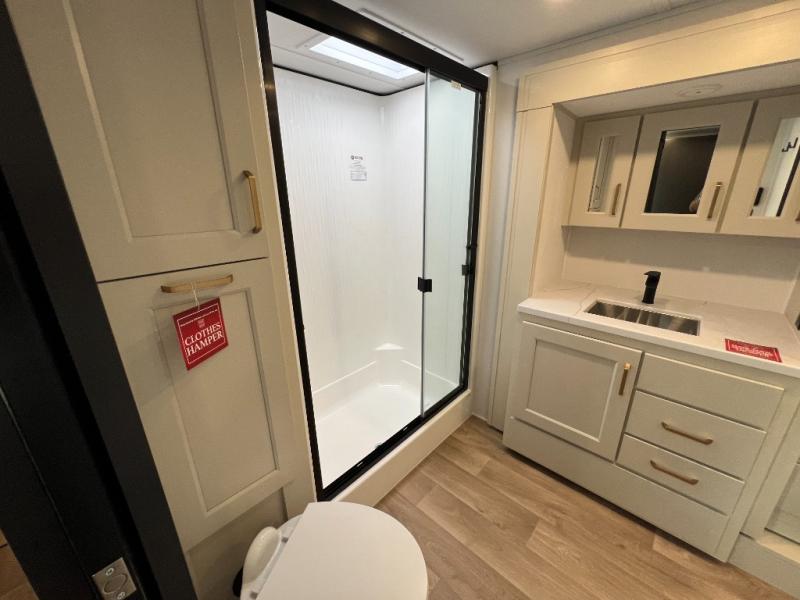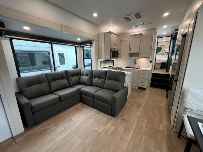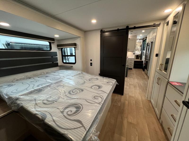 Grab the whole gang and head out in this fifth wheel featuring two private bedrooms, two full baths, and quad slides for even more space in this widebody layout. The living area featuring dual opposing slides offers space to dine and relax including an L-shaped sofa with recliners opposite the entertainment center and fireplace. You'll also love the full kitchen with ample counter space, a spice rack above the microwave, a pull-out pet dish, and more convenient features. The front master bedroom includes a queen bed with an optional king bed, a private entrance into the dual entry bath, plus a slide out with the wardrobe and bath sink. And your guests can take the second master bedroom with a folding queen bed slide, washer and dryer prep, a full rear bath, and even a loft above for more sleeping space!