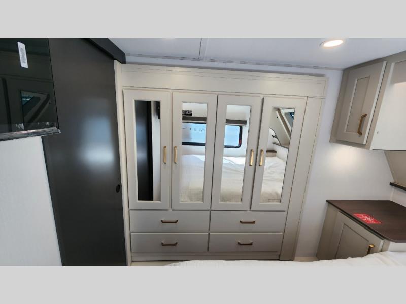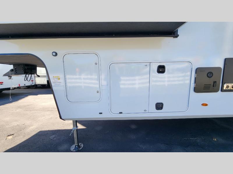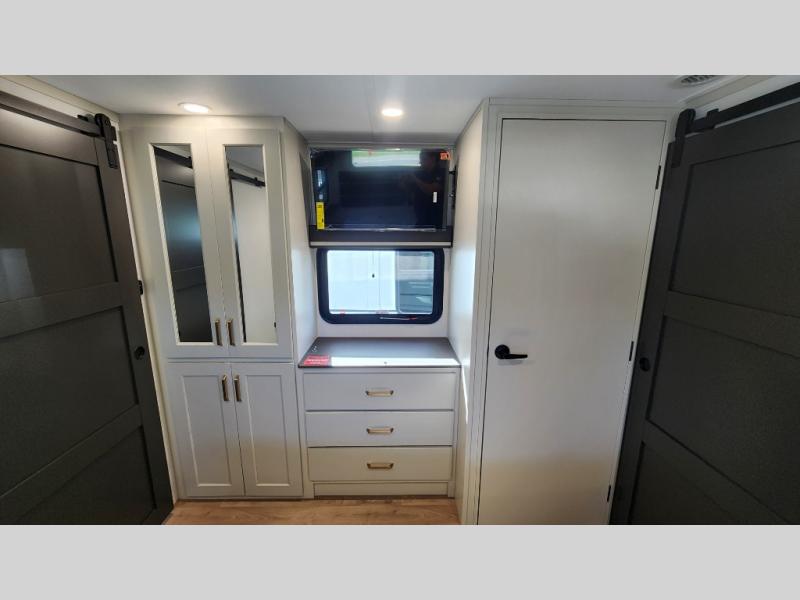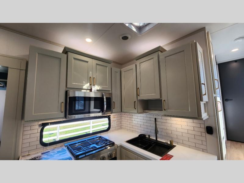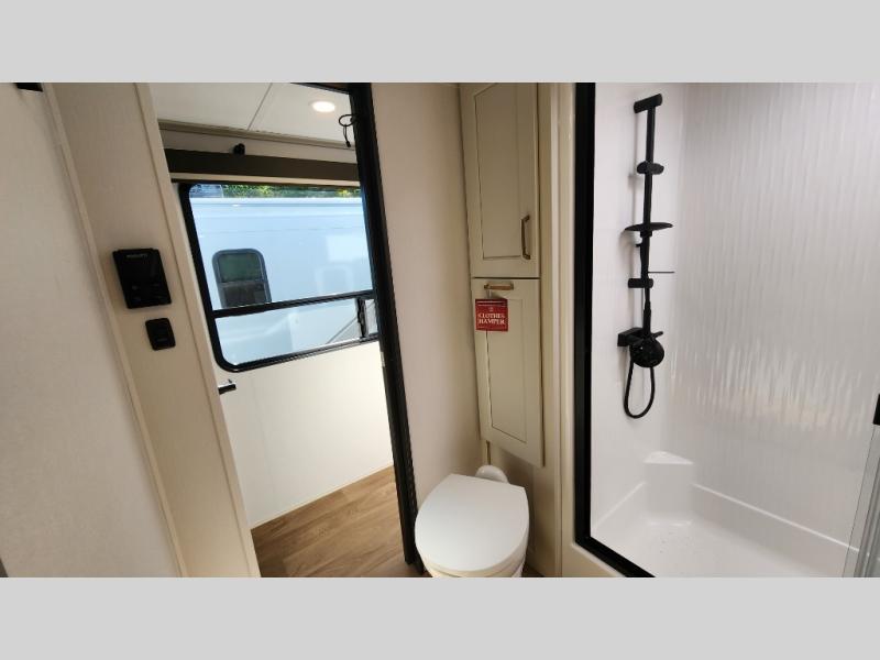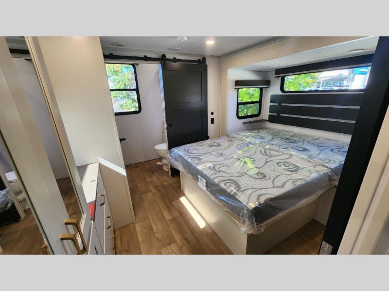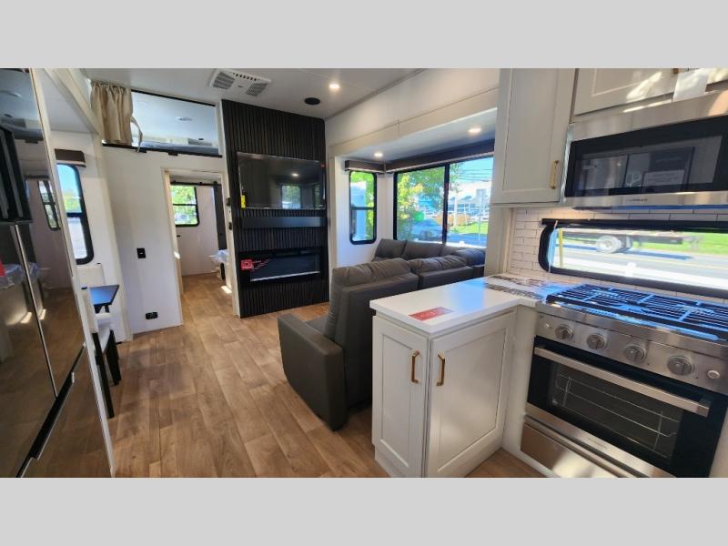 Grab the whole gang and head out in this fifth wheel featuring two private bedrooms, two full baths, and quad slides for even more space in this widebody layout. The living area featuring dual opposing slides offers space to dine and relax including an L-shaped sofa with recliners opposite the entertainment center and fireplace. You'll also love the full kitchen with ample counter space, a spice rack above the microwave, a pull-out pet dish, and more convenient features. The front master bedroom includes a queen bed with an optional king bed, a private entrance into the dual entry bath, plus a slide out with the wardrobe and bath sink. And your guests can take the second master bedroom with a folding queen bed slide, washer and dryer prep, a full rear bath, and even a loft above for more sleeping space!
