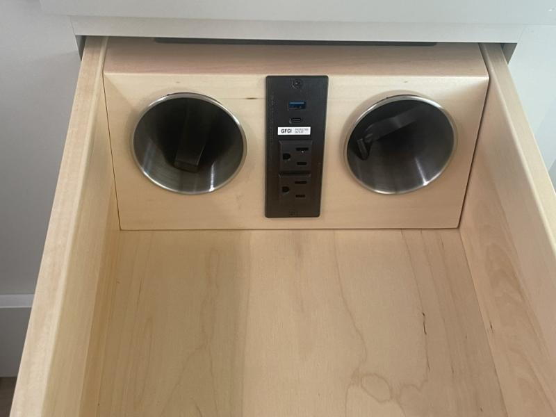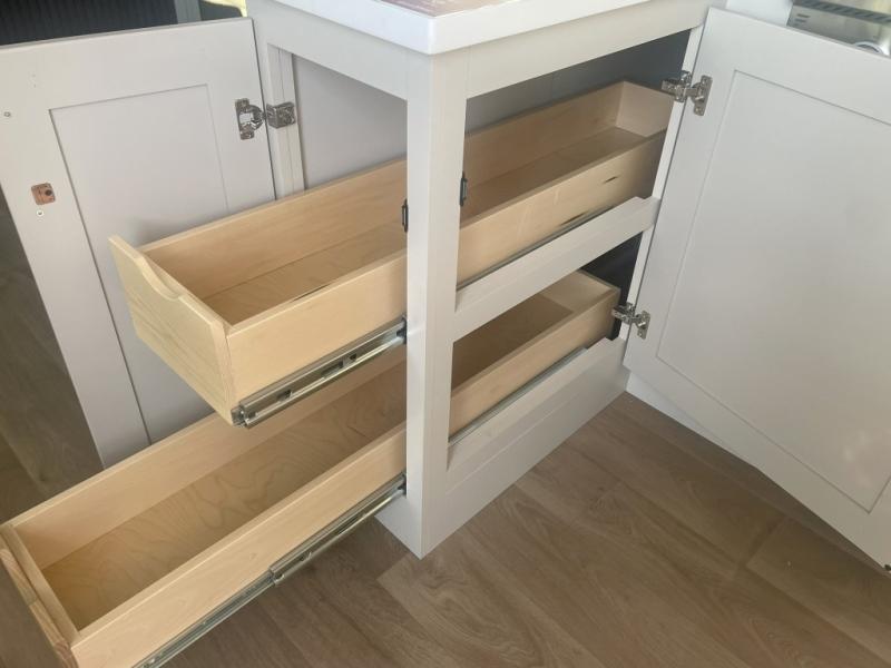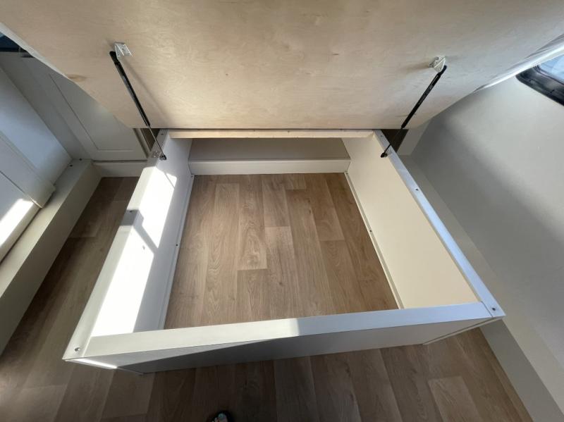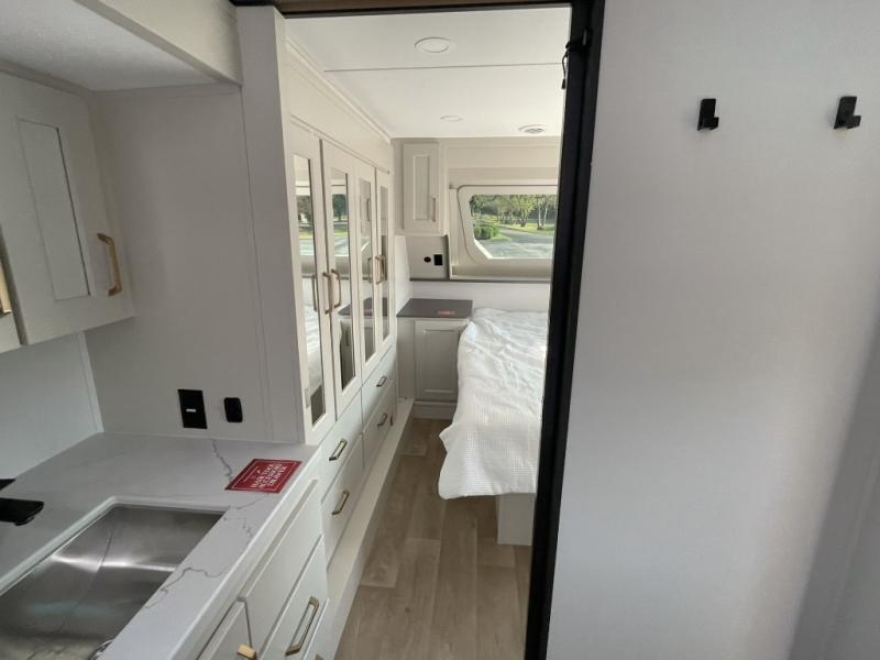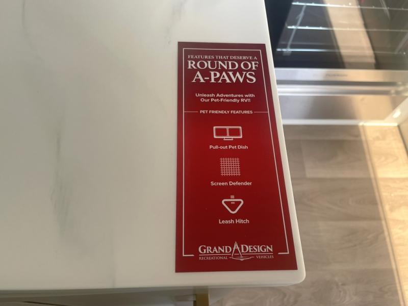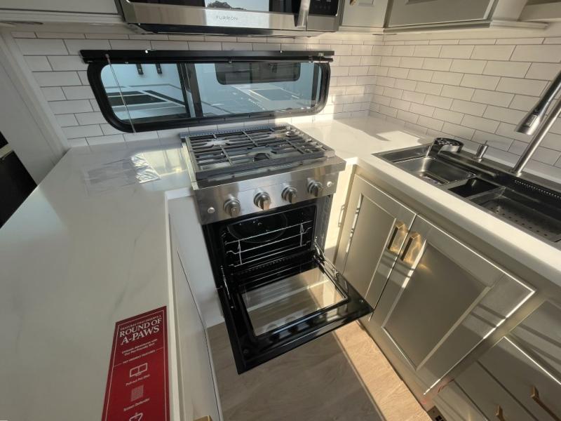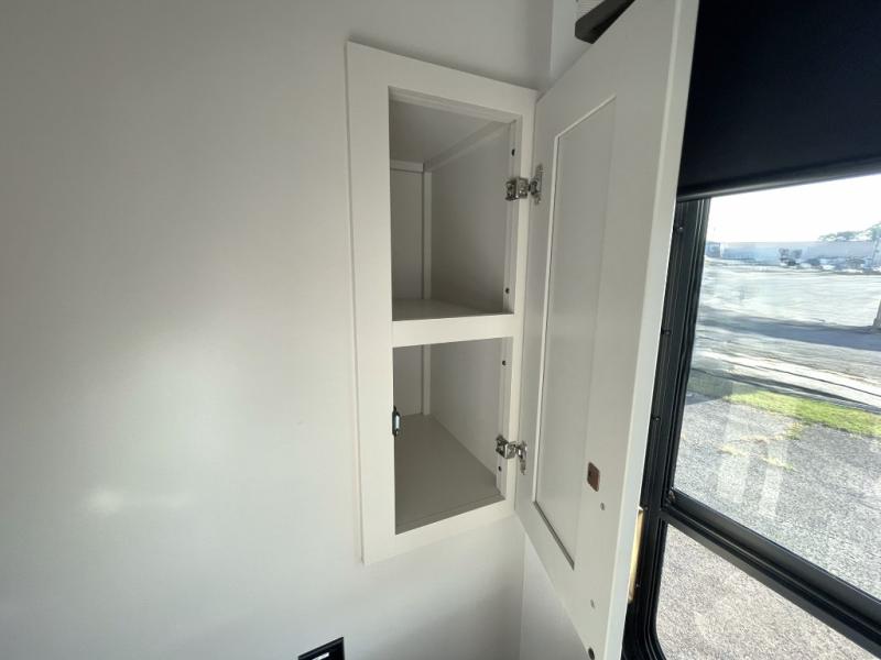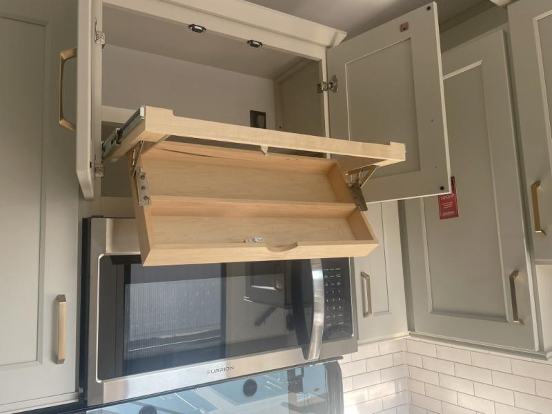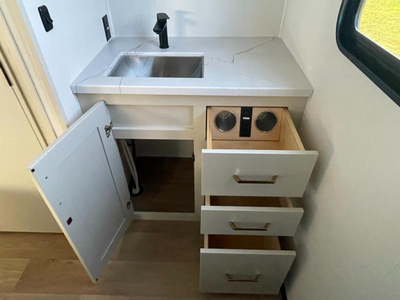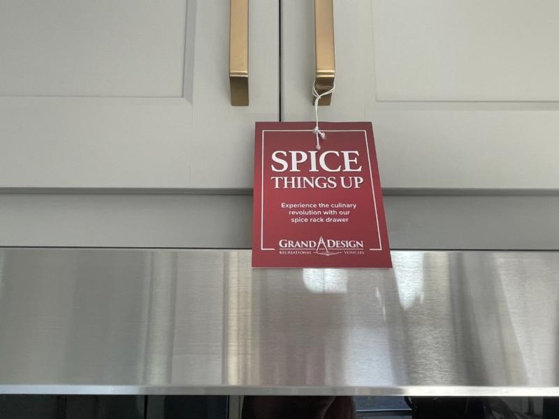 Whether you're cooking up a full breakfast or entertaining guests, the kitchen is a dream. You'll find generous counter space, a built-in spice rack, a large microwave, and even a pull-out pet dish for your furry family member. It’s a chef’s delight, right in the heart of your RV.