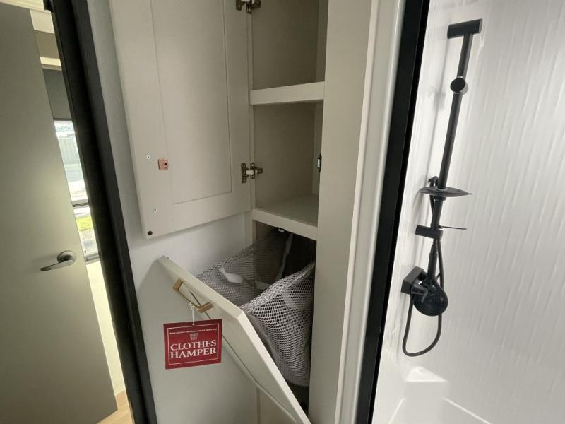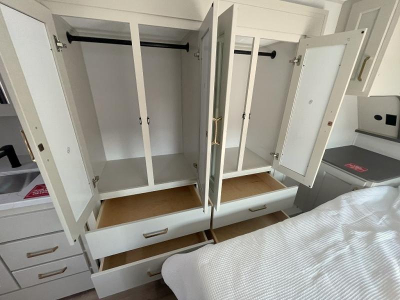 Yes, you read that right. This floorplan includes two fully enclosed master suites, giving everyone the privacy and comfort they deserve. The front bedroom features a queen bed (with an optional king), a spacious wardrobe, and direct access to the dual-entry bathroom. The rear master suite includes a folding queen bed, washer and dryer prep, and its own private full bath — plus a loft overhead for extra sleeping space.