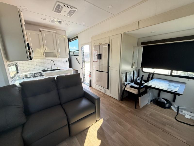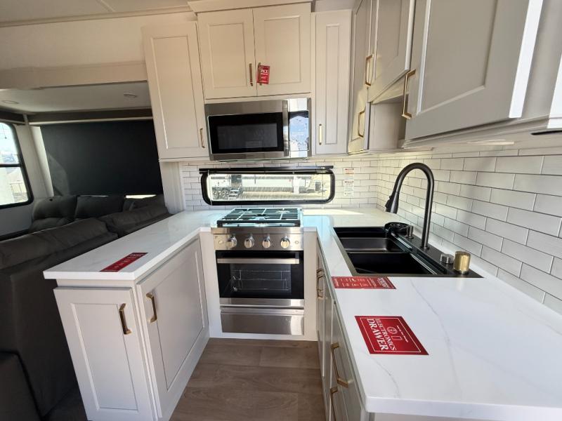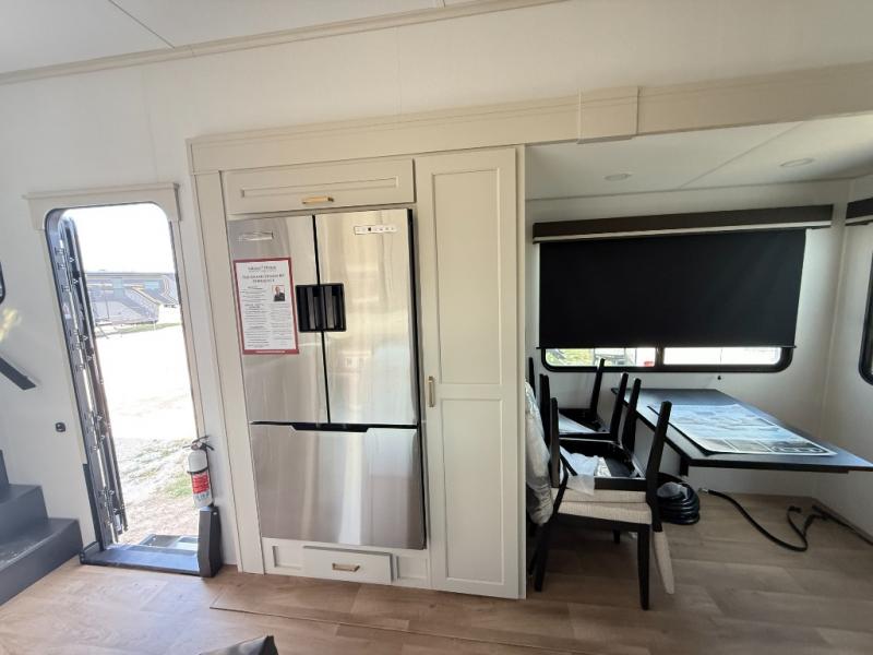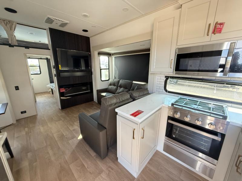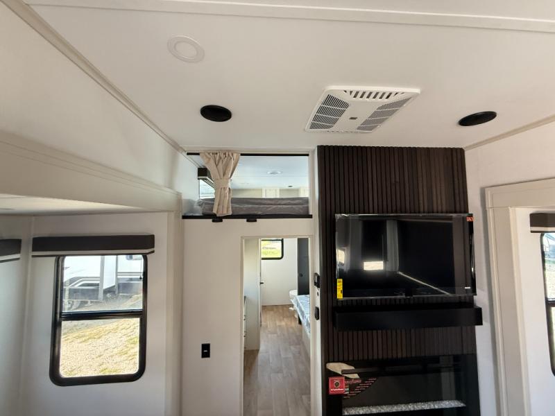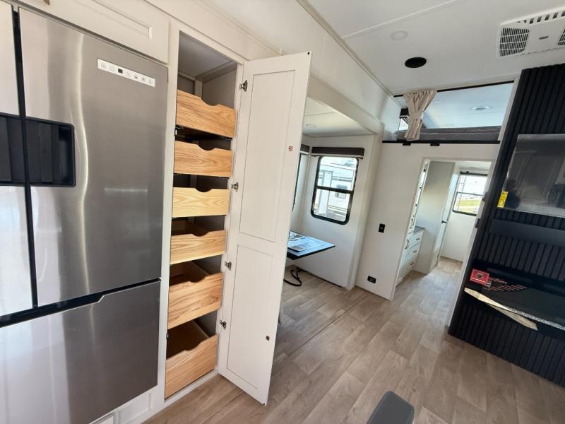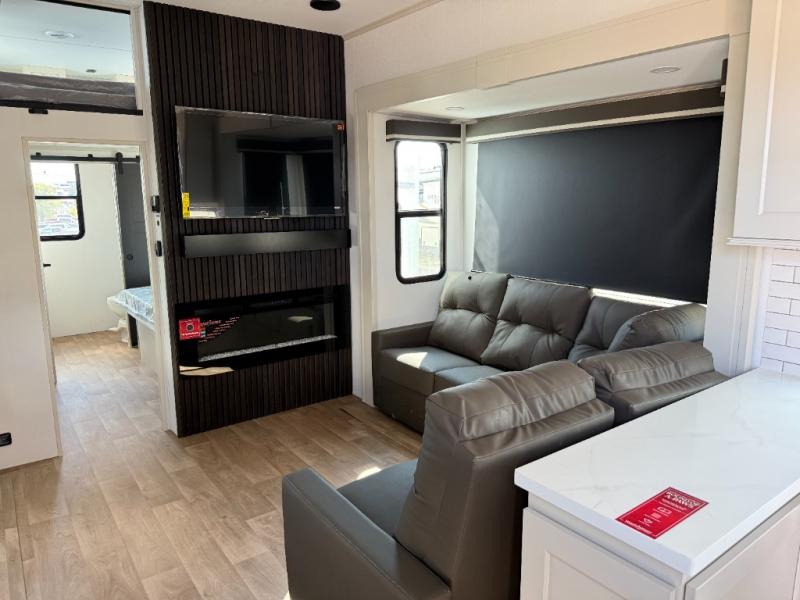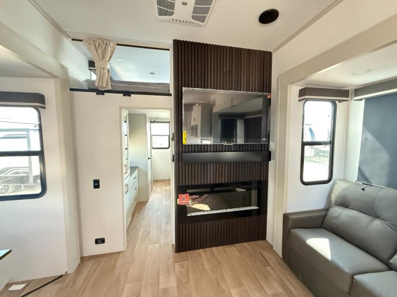 Grab the whole gang and head out in this fifth wheel featuring two private bedrooms, two full baths, and quad slides for even more space in this widebody layout. The living area featuring dual opposing slides offers space to dine and relax including an L-shaped sofa with recliners opposite the entertainment center and fireplace. You'll also love the full kitchen with ample counter space, a spice rack above the microwave, a pull-out pet dish, and more convenient features. The front master bedroom includes a queen bed with an optional king bed, a private entrance into the dual entry bath, plus a slide out with the wardrobe and bath sink. And your guests can take the second master bedroom with a folding queen bed slide, washer and dryer prep, a full rear bath, and even a loft above for more sleeping space!