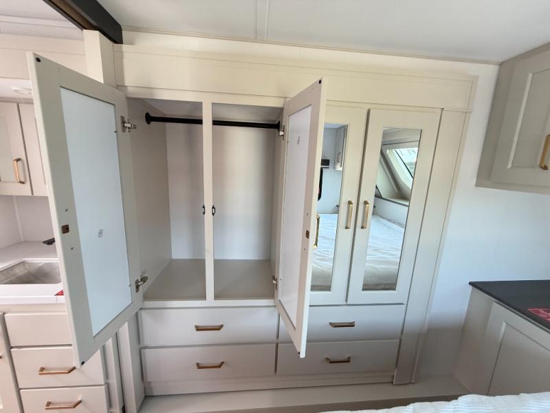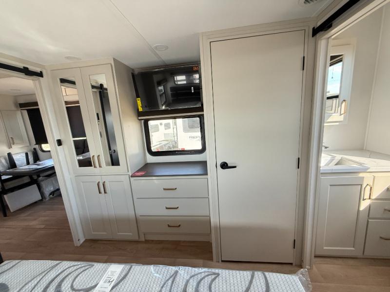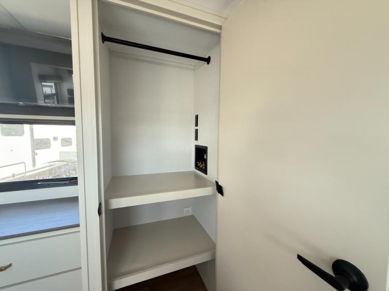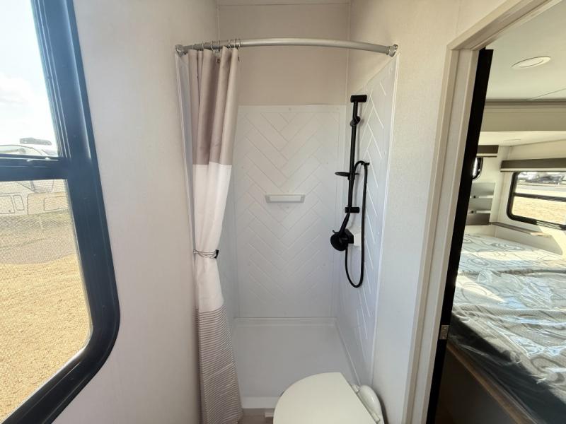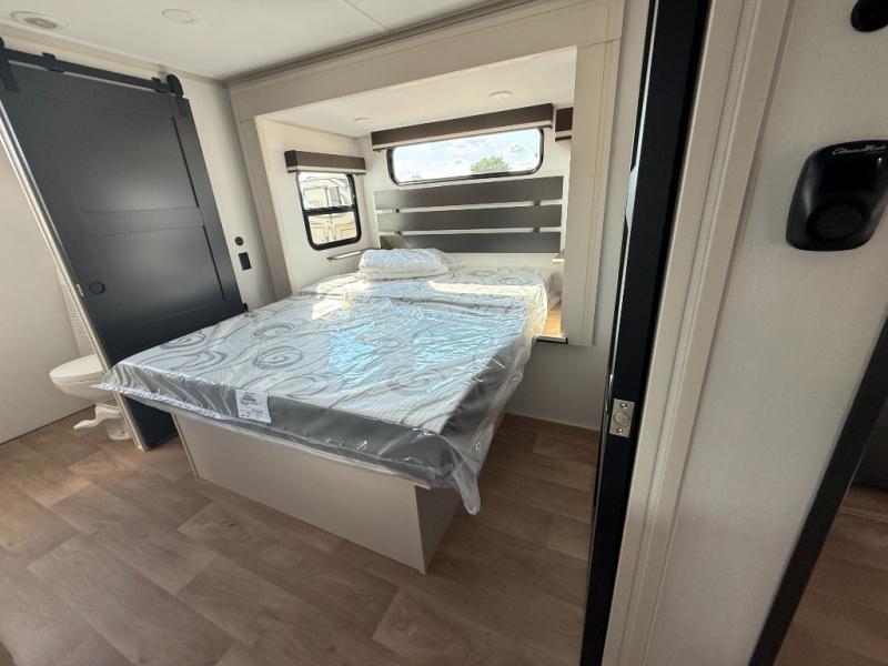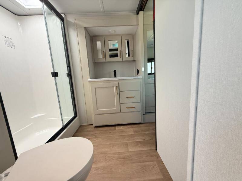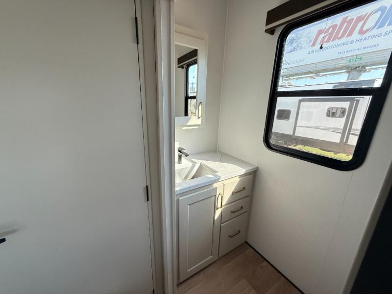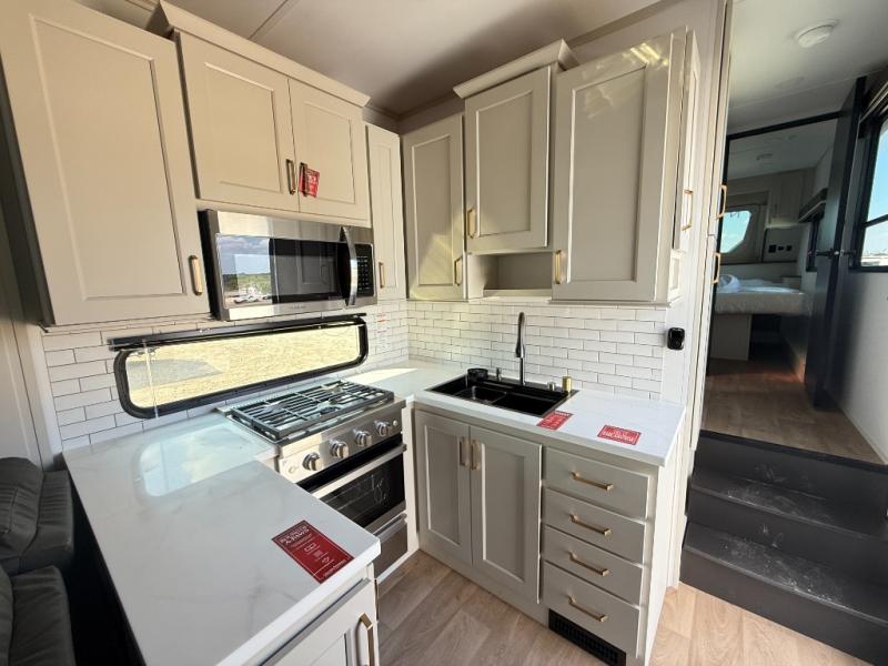 Grab the whole gang and head out in this fifth wheel featuring two private bedrooms, two full baths, and quad slides for even more space in this widebody layout. The living area featuring dual opposing slides offers space to dine and relax including an L-shaped sofa with recliners opposite the entertainment center and fireplace. You'll also love the full kitchen with ample counter space, a spice rack above the microwave, a pull-out pet dish, and more convenient features. The front master bedroom includes a queen bed with an optional king bed, a private entrance into the dual entry bath, plus a slide out with the wardrobe and bath sink. And your guests can take the second master bedroom with a folding queen bed slide, washer and dryer prep, a full rear bath, and even a loft above for more sleeping space!