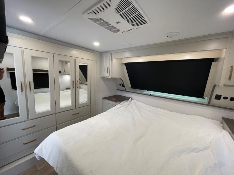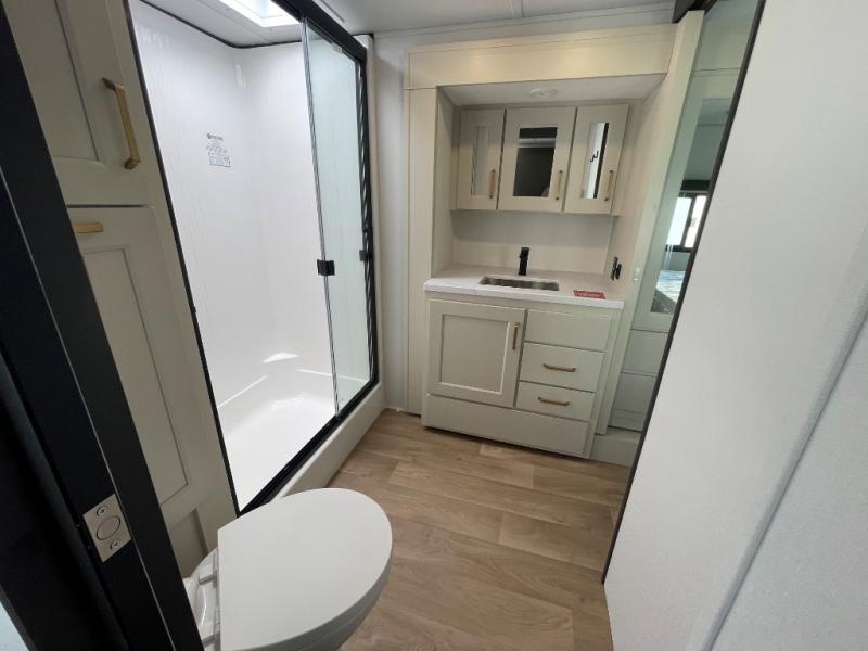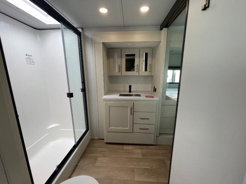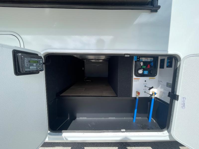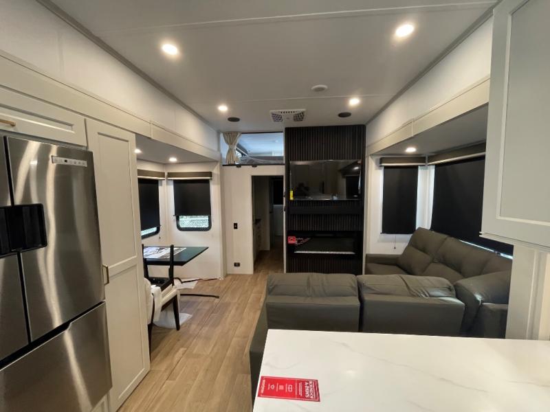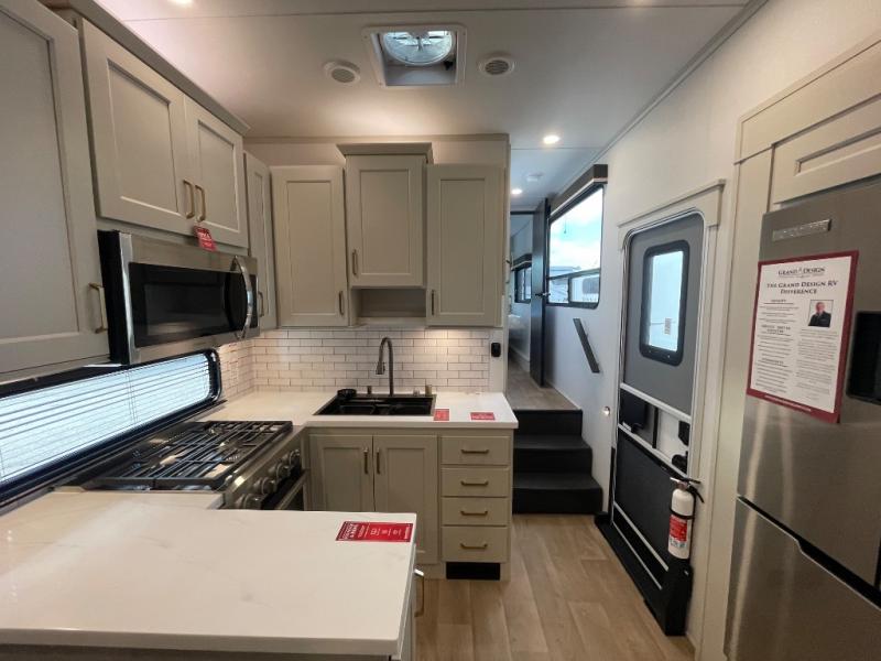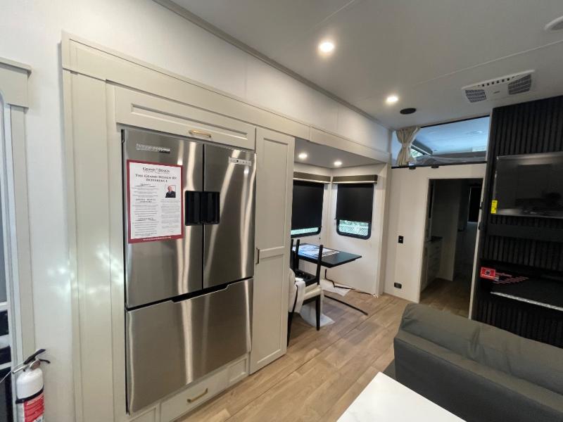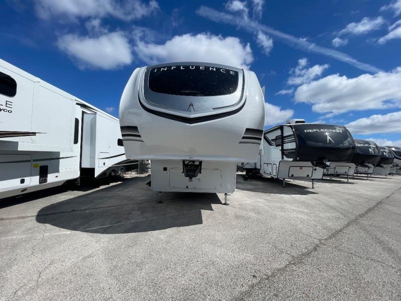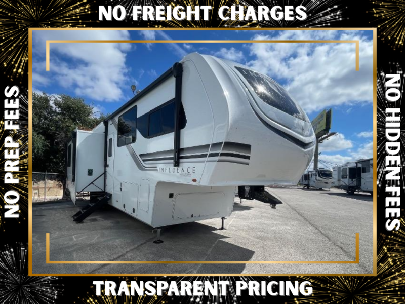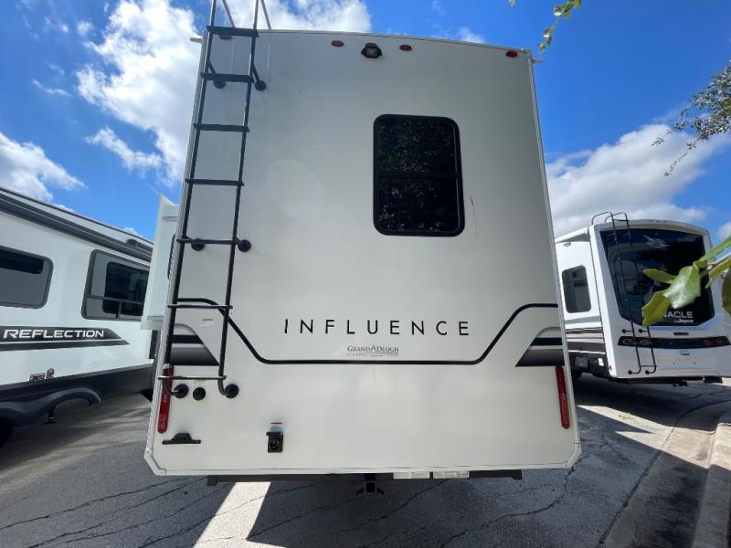 Any Grand Design Influence fifth wheel features five-sided aluminum cage construction with a walk-on roof and a fully enclosed underbelly with heated tanks and storage for all weather camping. For peace of mind, the MORryde CRE3000 Suspension system will provide safe and smooth towing, and the 101" widebody construction offers all the room you need and that is before multiple slides are fully engaged. You will appreciate the Keyed-Alike locks, slam-latch baggage doors with magnetic door catches, exterior security light, and SolidStep entry steps. On the inside, Congoleum flooring, premium roller shades for privacy, a hallway handrail for safety, and nightstands with USB ports to keep all of your electronics fully charged. You will also love the On Demand tankless water heater when showering, plus the added heat and ambiance from an electric fireplace, and so much more!