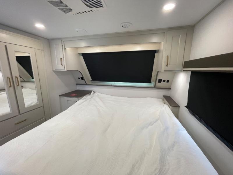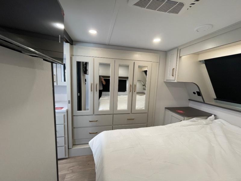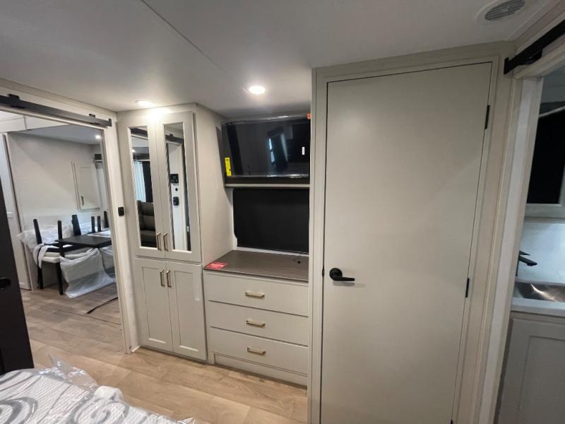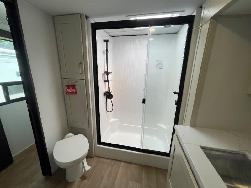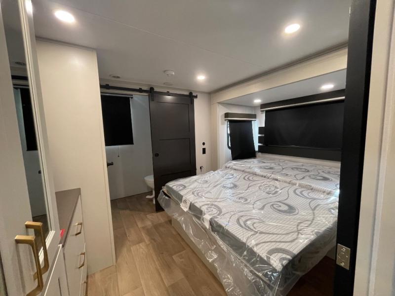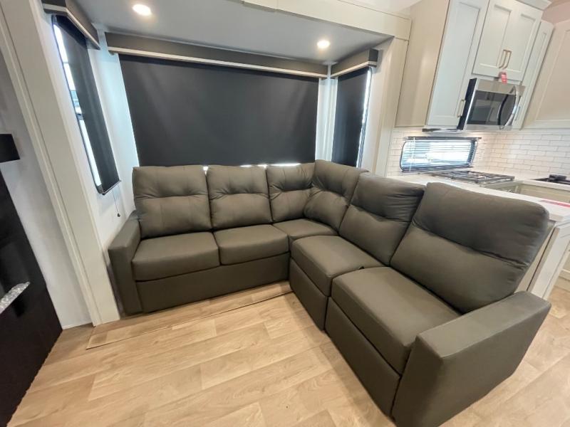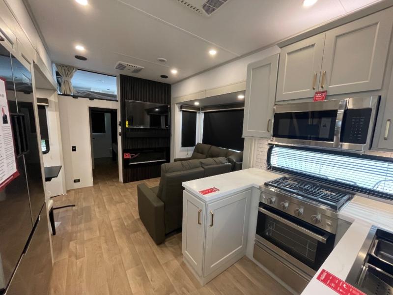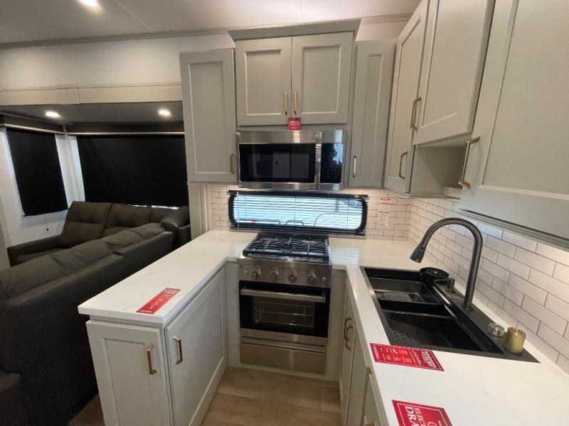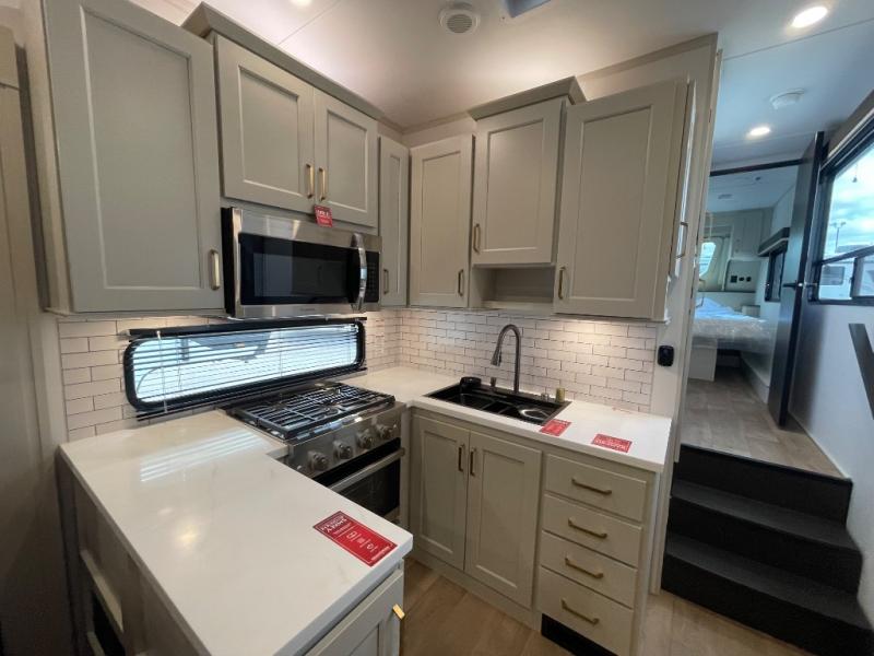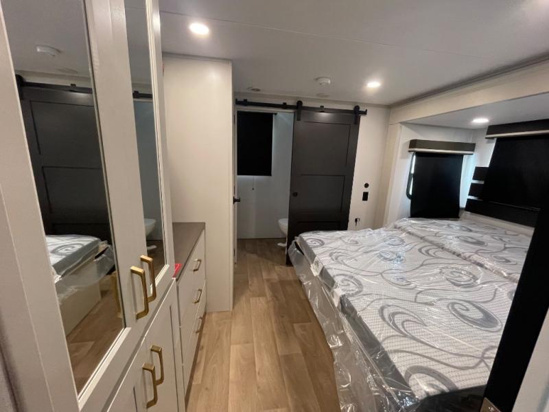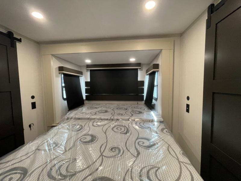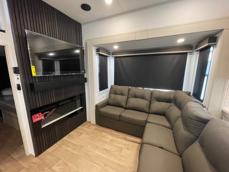 Grab the whole gang and head out in this fifth wheel featuring two private bedrooms, two full baths, and quad slides for even more space in this widebody layout. The living area featuring dual opposing slides offers space to dine and relax including an L-shaped sofa with recliners opposite the entertainment center and fireplace. You'll also love the full kitchen with ample counter space, a spice rack above the microwave, a pull-out pet dish, and more convenient features. The front master bedroom includes a queen bed with an optional king bed, a private entrance into the dual entry bath, plus a slide out with the wardrobe and bath sink. And your guests can take the second master bedroom with a folding queen bed slide, washer and dryer prep, a full rear bath, and even a loft above for more sleeping space!