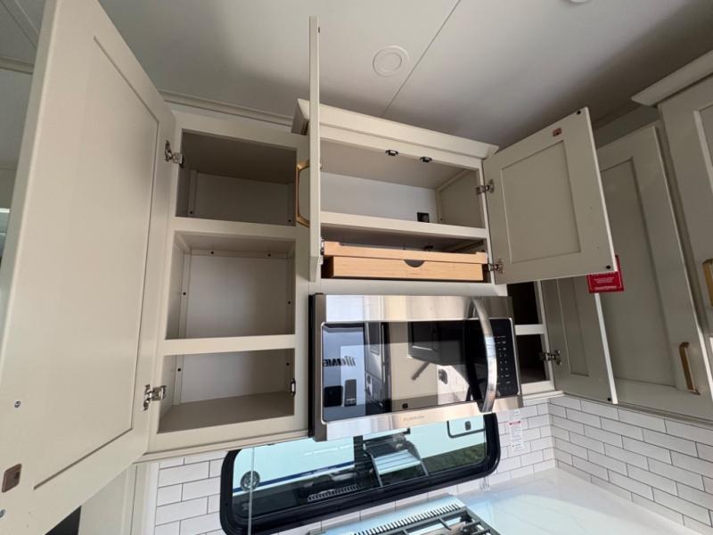 Grab the whole gang and head out in this fifth wheel featuring two private bedrooms, two full baths, and quad slides for even more space in this widebody layout. The living area featuring dual opposing slides offers space to dine and relax including an L-shaped sofa with recliners opposite the entertainment center and fireplace. You'll also love the full kitchen with ample counter space, a spice rack above the microwave, a pull-out pet dish, and more convenient features. The front master bedroom includes a queen bed with an optional king bed, a private entrance into the dual entry bath, plus a slide out with the wardrobe and bath sink. And your guests can take the second master bedroom with a folding queen bed slide, washer and dryer prep, a full rear bath, and even a loft above for more sleeping space!