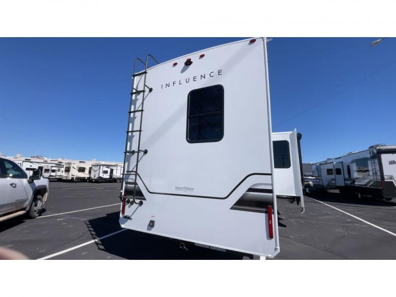 Any Grand Design Influence fifth wheel features five-sided aluminum cage construction with a walk-on roof and a fully enclosed underbelly with heated tanks and storage for all weather camping. For peace of mind, the MORryde CRE3000 Suspension system will provide safe and smooth towing, and the 101" widebody construction offers all the room you need and that is before multiple slides are fully engaged. You will appreciate the Keyed-Alike locks, slam-latch baggage doors with magnetic door catches, exterior security light, and SolidStep entry steps. On the inside, Congoleum flooring, premium roller shades for privacy, a hallway handrail for safety, and nightstands with USB ports to keep all of your electronics fully charged. You will also love the On Demand tankless water heater when showering, plus the added heat and ambiance from an electric fireplace, and so much more!