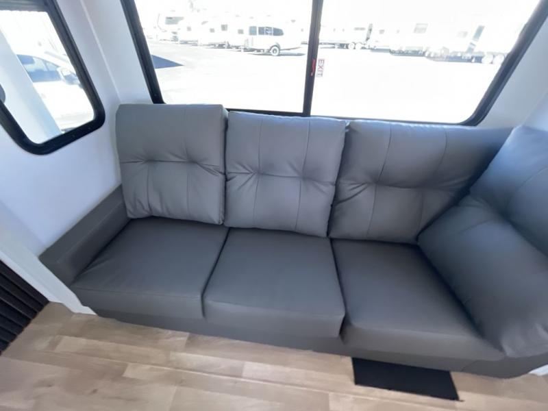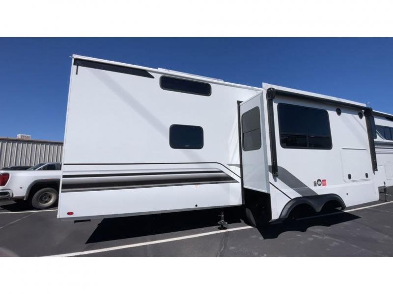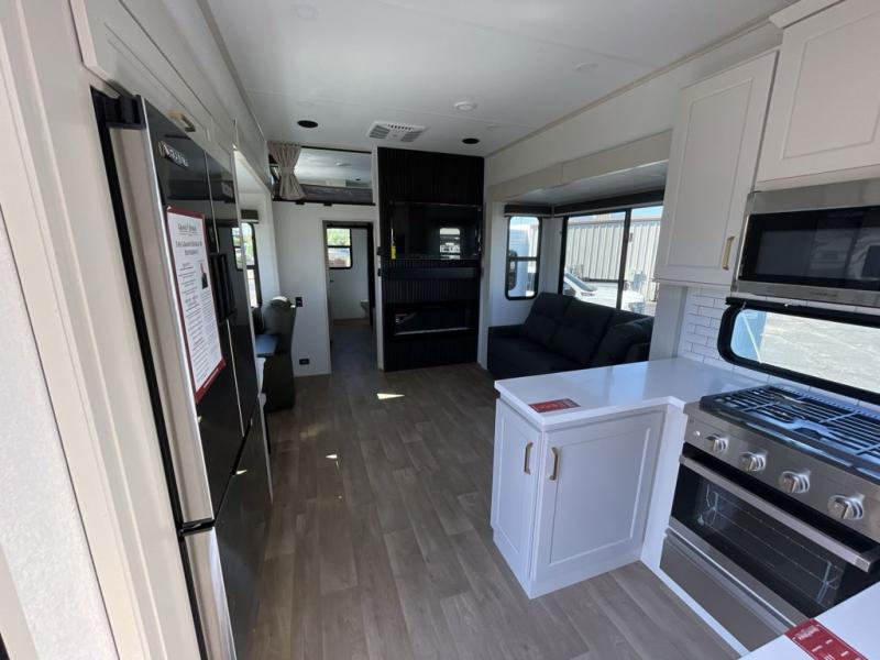 Grab the whole gang and head out in this fifth wheel featuring two private bedrooms, two full baths, and quad slides for even more space in this widebody layout. The living area featuring dual opposing slides offers space to dine and relax including an L-shaped sofa with recliners opposite the entertainment center and fireplace. You'll also love the full kitchen with ample counter space, a spice rack above the microwave, a pull-out pet dish, and more convenient features. The front master bedroom includes a queen bed with an optional king bed, a private entrance into the dual entry bath, plus a slide out with the wardrobe and bath sink. And your guests can take the second master bedroom with a folding queen bed slide, washer and dryer prep, a full rear bath, and even a loft above for more sleeping space!