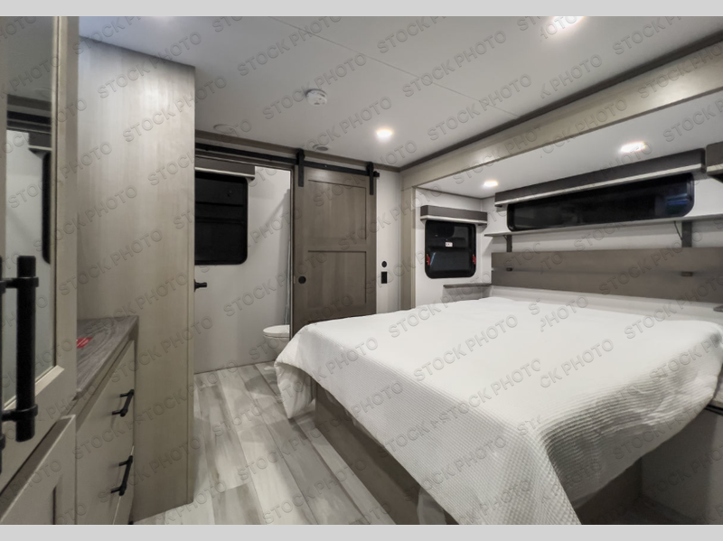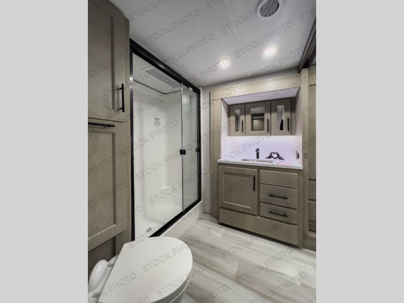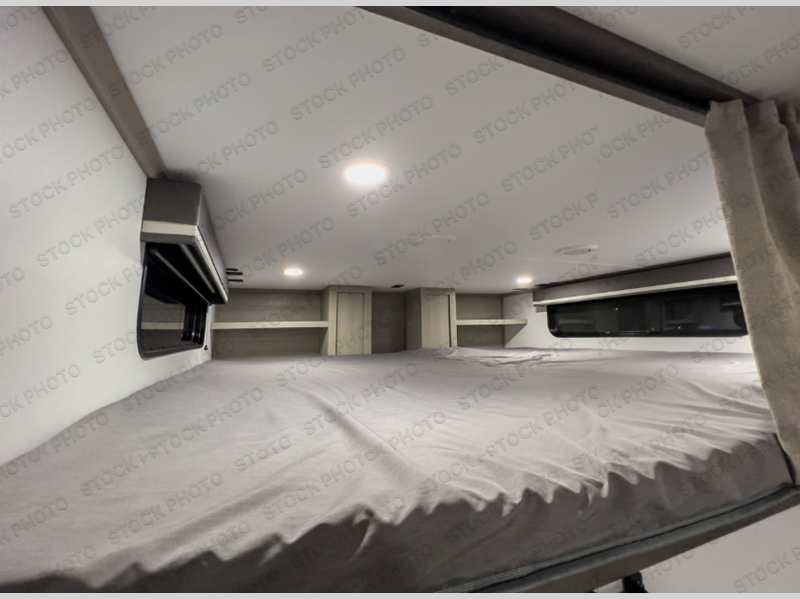 Grab the whole gang and head out in this fifth wheel featuring two private bedrooms, two full baths, and quad slides for even more space in this widebody layout. The living area featuring dual opposing slides offers space to dine and relax including an L-shaped sofa with recliners opposite the entertainment center and fireplace. You'll also love the full kitchen with ample counter space, a spice rack above the microwave, a pull-out pet dish, and more convenient features. The front master bedroom includes a queen bed with an optional king bed, a private entrance into the dual entry bath, plus a slide out with the wardrobe and bath sink. And your guests can take the second master bedroom with a folding queen bed slide, washer and dryer prep, a full rear bath, and even a loft above for more sleeping space!