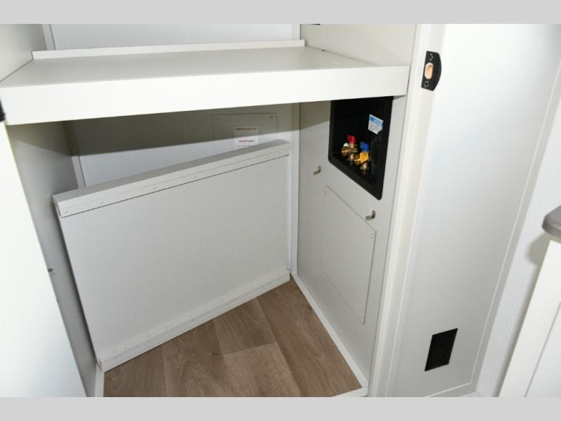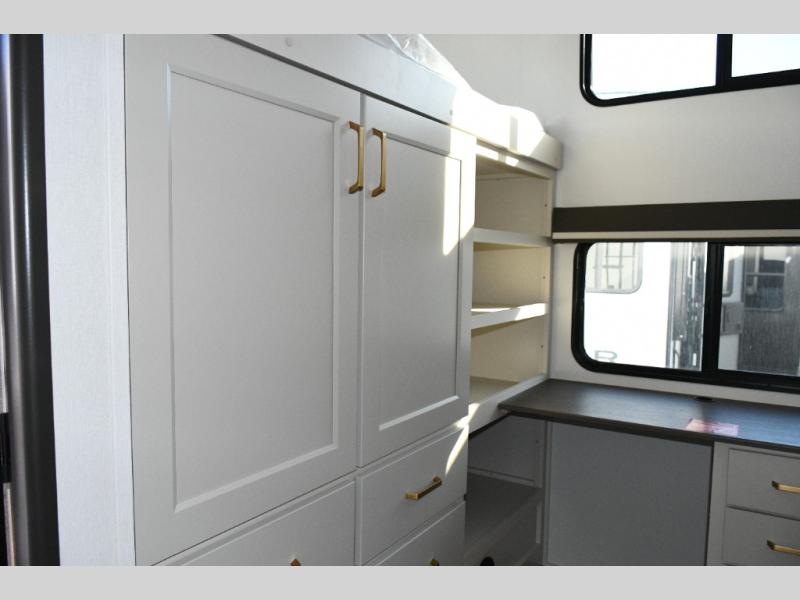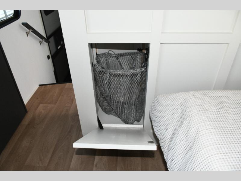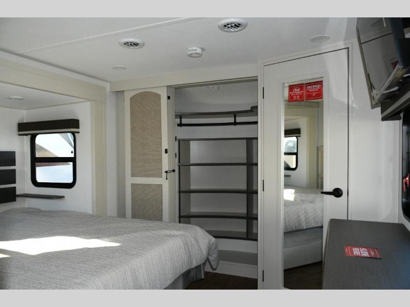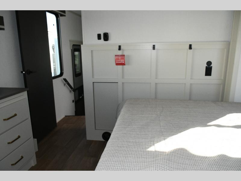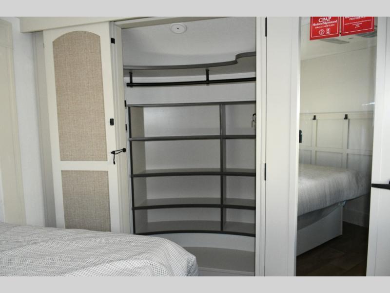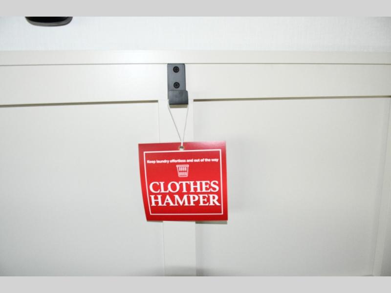 Front Private Bedroom – A queen bed slide-out, large wardrobe, washer/dryer prep, and a pass-thru clothes hamper leading directly to the master bath.