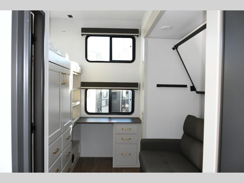 Rear Private Bunkhouse Suite – Perfect for kids or guests with a tri-fold sofa, fold-down bunk, upper bunk, storage, and a half bath with its own exterior entry door for added privacy and easy access.
