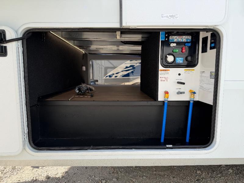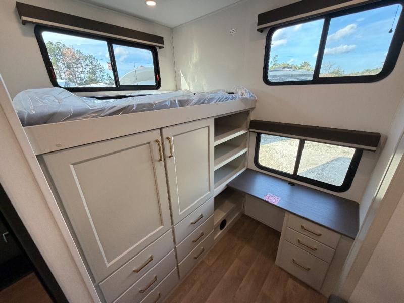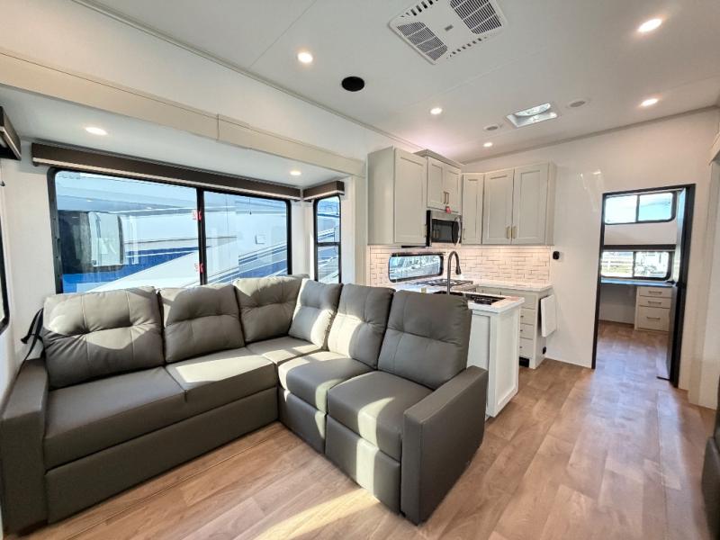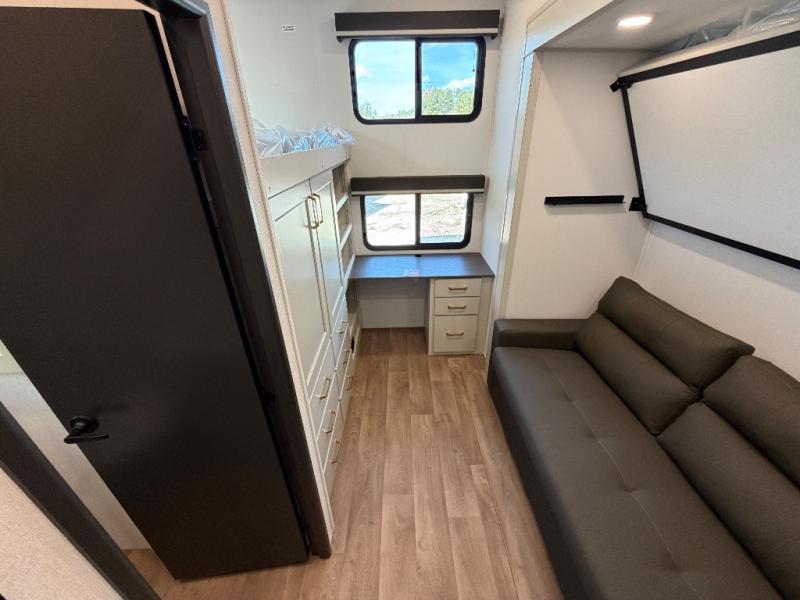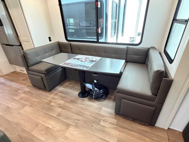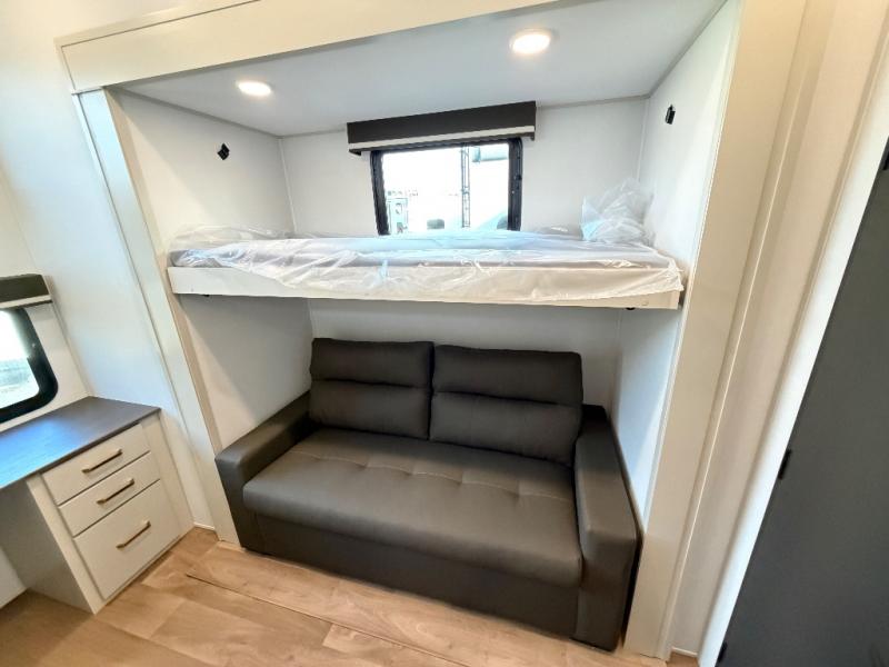 Your whole crew will love camping in this spacious fifth wheel! There is a rear private bunkhouse with a tri-fold sofa and fold-down bunk within a slide, plus a second bunk, storage space, and even a half bath with one of the dual entry doors to the unit for added convenience! You'll find your own space in the front private bedroom, complete with a queen bed slide out, a pass-thru clothes hamper that goes directly into the full bath, plus washer and dryer prep if you choose to add these appliances. A U-shaped kitchen includes ample counter space, a spice rack above the microwave, plus a flip-up countertop extension for even more prep space. There is also a U-shaped dinette where you can all dine around, plus an L-shaped sofa with recline at the end for relaxing space. And you're sure to appreciate the entertainment wall with an LED smart TV, fireplace and smart storage!