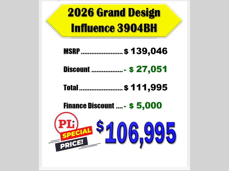 New 2026 Grand Design Influence 3904BH Fifth Wheel