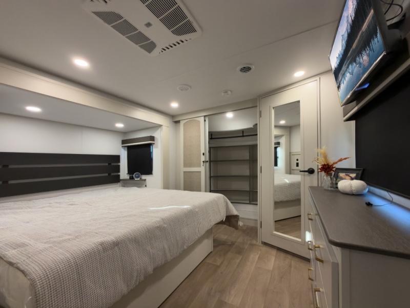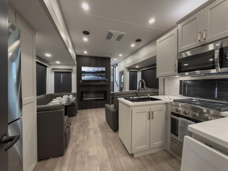 Any Grand Design Influence fifth wheel features five-sided aluminum cage construction with a walk-on roof and a fully enclosed underbelly with heated tanks and storage for all weather camping. For peace of mind, the MORryde CRE3000 Suspension system will provide safe and smooth towing, and the 101" widebody construction offers all the room you need and that is before multiple slides are fully engaged. You will appreciate the Keyed-Alike locks, slam-latch baggage doors with magnetic door catches, exterior security light, and SolidStep entry steps. On the inside, Congoleum flooring, premium roller shades for privacy, a hallway handrail for safety, and nightstands with USB ports to keep all of your electronics fully charged. You will also love the on demand tankless water heater when showering, plus the added heat and ambiance from an electric fireplace, and so much more!